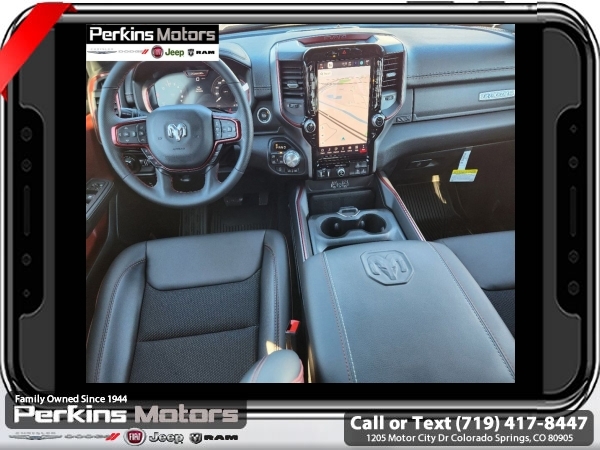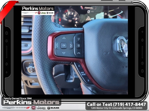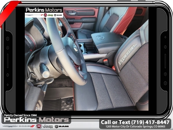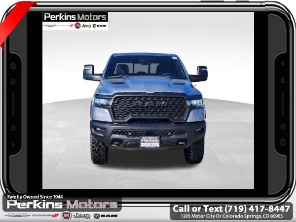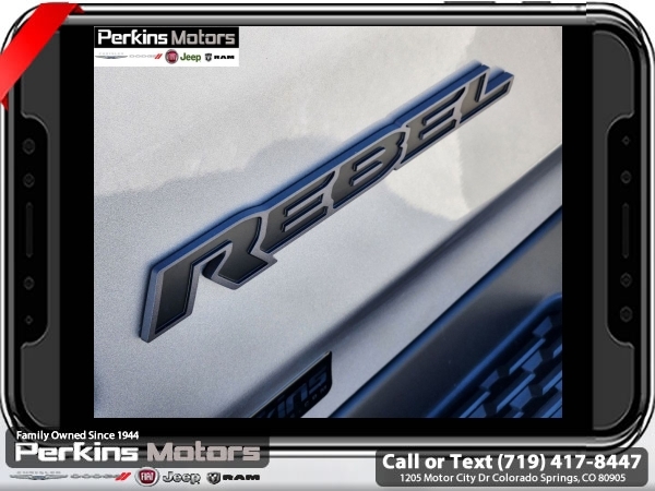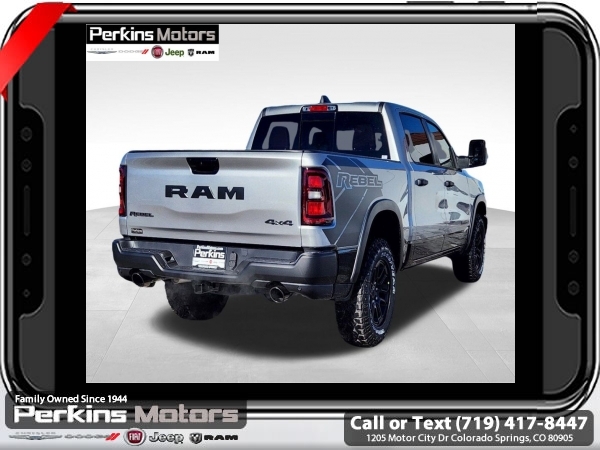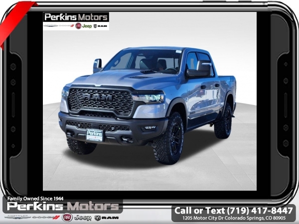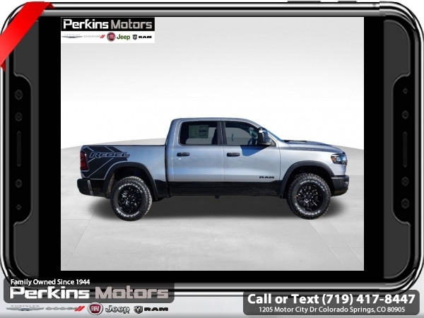 Factory MSRP: $70,355 $10,176 off MSRP! Priced below KBB Fair Purchase Price! Billet Silver Metallic Clearcoat 2025 Ram 1500 Rebel 4WD 8-Speed Automatic 3.0L I6<br><br>Check us out at www.perkinsmotors.com to see our specials! Since opening our doors in 1944, we’ve been proud to serve Colorado Springs, CO, and the surrounding areas of Pueblo, Castle Rock and Denver, CO. Throughout this time of being family owned for 80 years, we’ve maintained a firm commitment to our customers: to offer a wide selection of New Chrysler, Dodge, Fiat, Jeep, and Ram vehicles and quality pre-owned vehicles, and provide a quick, no-hassle car-buying process that ensures everyone drives off the lot satisfied with their purchase.<br><br>Bed Utility Group (Exterior 115V AC Outlet, MOPAR 4 Adjustable Cargo Tie-Down Hooks, and MOPAR Spray In Bedliner), Quick Order Package 21W Rebel, Rebel Level 1 Equipment Group (Auto Power-Folding Mirrors, Auto-Dimming Exterior Driver Mirror, Black Premium Power Mirrors, Convex Wide-Angle Exterior Mirror Insert, Exterior Mirrors Courtesy Lamps, Exterior Mirrors w/Heating Element, Exterior Mirrors w/Supplemental Signals, Power Adjustable Pedals, Rear Window Defroster, Remote Tailgate Release, and Wireless Charging Pad), Towing Technology Group (Trailer Hitch Line-Up Assist), Trailer Tow Group (Accent Color Tailgate Handle, Auto-Dimming Exterior Passenger Mirror, Exterior Mirrors w/Memory, Forward & Reverse Utility Lights, Manual Folding Exterior Mirrors, Manual Telescoping Mirrors, Mirror Clearance/Running Lights, Power Telescoping Mirrors, Power-Adjustable Convex Aux Mirrors, Trailer Brake Control, Trailer Light Check, Trailer Reverse Steering Control, Trailer Tire Pressure Monitoring System, and Trailer Tow Mirrors), 10 Speakers, 3.92 Rear Axle Ratio, 33 Gallon Fuel Tank, 4 Way Front Headrests, 4-Wheel Disc Brakes, 4G LTE Wi-Fi Hot Spot, ABS brakes, Air Conditioning, Alloy wheels, AM/FM radio: SiriusXM with 360L, Apple CarPlay, Apple CarPlay/Android Auto, Auto High-beam Headlights, Auto-dimming Rear-View mirror, Automatic temperature control, Brake assist, Bucket Seats, Cloth/Vinyl Bucket Seats, Compass, Connected Travel & Traffic Services, Connectivity - US/Canada, Cruise Control, Delay-off headlights, Driver door bin, Driver vanity mirror, Dual front impact airbags, Dual front side impact airbags, Electronic Stability Control, Engine Block Heater, Front anti-roll bar, Front Bucket Seats, Front Center Armrest w/Storage, Front dual zone A/C, Front fog lights, Front License Plate Bracket, Front reading lights, Front Seat Back Map Pockets, Front wheel independent suspension, Full Length Upgraded Floor Console, Fully automatic headlights, Garage door transmitter, Google Android Auto, GPS Antenna Input, GPS Navigation, Heated door mirrors, Heated front seats, Heated steering wheel, Illuminated entry, Integrated Voice Command w/Bluetooth, Leather steering wheel, Low tire pressure warning, Navigation System, Occupant sensing airbag, Outside temperature display, Overhead airbag, Overhead console, Panic alarm, ParkView Rear Back-Up Camera, Passenger door bin, Passenger vanity mirror, Power Adjust 8-Way Driver Seat, Power door mirrors, Power driver seat, Power steering, Power windows, Radio data system, Radio: Uconnect 5 Nav w/12.0 Display, Rear 60/40 Folding Seat, Rear anti-roll bar, Rear seat center armrest, Rear step bumper, Remote keyless entry, SiriusXM w/360L, Split folding rear seat, Steering wheel mounted audio controls, Tachometer, Telescoping steering wheel, Tilt steering wheel, Traction control, Trip computer, USB Host Flip, Variably intermittent wipers, Voltmeter, and Wheels: 18 x 8.0 Painted Mid-Gloss Black. Sale price includes all manufacture's incentives and dealer discounts. Sale price not available on lease or compatible with special APR. $2000 - 2025 National Retail Consumer Cash. Exp. 06/30/2025 $6176 - 2025 National Minimum Employee Pricing Discount. Exp. 06/30/2025