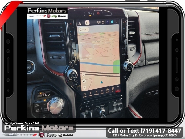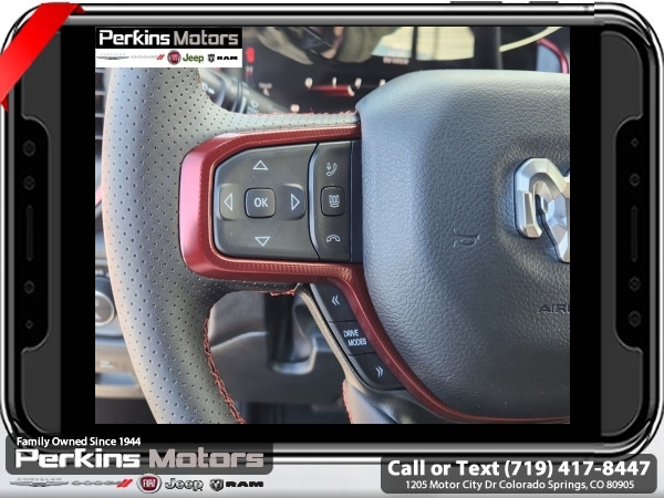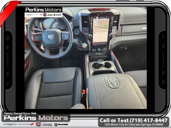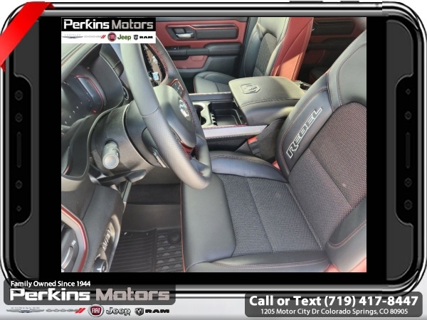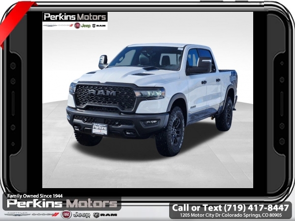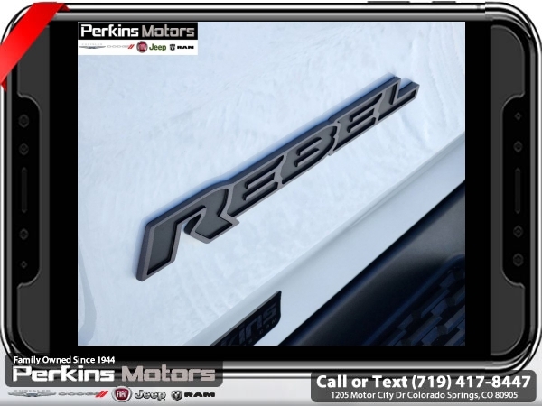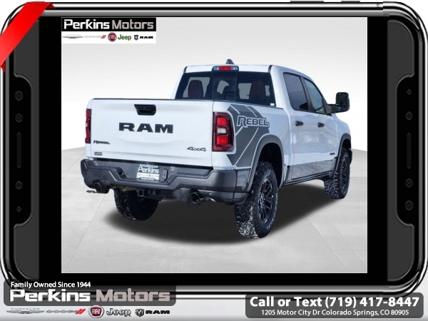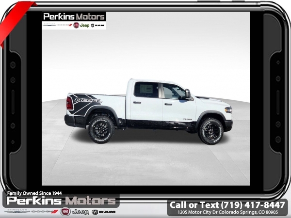 Factory MSRP: $70,060 $13,000 off MSRP! Priced below KBB Fair Purchase Price! Bright White Clearcoat 2025 Ram 1500 Rebel 4WD 8-Speed Automatic 3.0L I6<br><br>Check us out at www.perkinsmotors.com to see our specials! Since opening our doors in 1944, we’ve been proud to serve Colorado Springs, CO, and the surrounding areas of Pueblo, Castle Rock and Denver, CO. Throughout this time of being family owned for 80 years, we’ve maintained a firm commitment to our customers: to offer a wide selection of New Chrysler, Dodge, Fiat, Jeep, and Ram vehicles and quality pre-owned vehicles, and provide a quick, no-hassle car-buying process that ensures everyone drives off the lot satisfied with their purchase.<br><br>Bed Utility Group (Exterior 115V AC Outlet, MOPAR 4 Adjustable Cargo Tie-Down Hooks, and MOPAR Spray In Bedliner), Quick Order Package 21W Rebel, Rebel Level 1 Equipment Group (Auto Power-Folding Mirrors, Auto-Dimming Exterior Driver Mirror, Black Premium Power Mirrors, Convex Wide-Angle Exterior Mirror Insert, Exterior Mirrors Courtesy Lamps, Exterior Mirrors w/Heating Element, Exterior Mirrors w/Supplemental Signals, Power Adjustable Pedals, Rear Window Defroster, Remote Tailgate Release, and Wireless Charging Pad), Towing Technology Group (Trailer Hitch Line-Up Assist), Trailer Tow Group (Accent Color Tailgate Handle, Auto-Dimming Exterior Passenger Mirror, Exterior Mirrors w/Memory, Forward & Reverse Utility Lights, Manual Folding Exterior Mirrors, Manual Telescoping Mirrors, Mirror Clearance/Running Lights, Power Telescoping Mirrors, Power-Adjustable Convex Aux Mirrors, Trailer Brake Control, Trailer Light Check, Trailer Reverse Steering Control, Trailer Tire Pressure Monitoring System, and Trailer Tow Mirrors), 10 Speakers, 3.92 Rear Axle Ratio, 33 Gallon Fuel Tank, 4 Way Front Headrests, 4-Wheel Disc Brakes, 4G LTE Wi-Fi Hot Spot, ABS brakes, Air Conditioning, Alloy wheels, AM/FM radio: SiriusXM with 360L, Apple CarPlay, Apple CarPlay/Android Auto, Auto High-beam Headlights, Auto-dimming Rear-View mirror, Automatic temperature control, Brake assist, Bucket Seats, Cloth/Vinyl Bucket Seats, Compass, Connected Travel & Traffic Services, Connectivity - US/Canada, Cruise Control, Delay-off headlights, Driver door bin, Driver vanity mirror, Dual front impact airbags, Dual front side impact airbags, Electronic Stability Control, Engine Block Heater, Front anti-roll bar, Front Bucket Seats, Front Center Armrest w/Storage, Front dual zone A/C, Front fog lights, Front License Plate Bracket, Front reading lights, Front Seat Back Map Pockets, Front wheel independent suspension, Full Length Upgraded Floor Console, Fully automatic headlights, Garage door transmitter, Google Android Auto, GPS Antenna Input, GPS Navigation, Heated door mirrors, Heated front seats, Heated steering wheel, Illuminated entry, Integrated Voice Command w/Bluetooth, Leather steering wheel, Low tire pressure warning, Navigation System, Occupant sensing airbag, Outside temperature display, Overhead airbag, Overhead console, Panic alarm, ParkView Rear Back-Up Camera, Passenger door bin, Passenger vanity mirror, Power Adjust 8-Way Driver Seat, Power door mirrors, Power driver seat, Power steering, Power windows, Radio data system, Radio: Uconnect 5 Nav w/12.0 Display, Rear 60/40 Folding Seat, Rear anti-roll bar, Rear seat center armrest, Rear step bumper, Remote keyless entry, SiriusXM w/360L, Split folding rear seat, Steering wheel mounted audio controls, Tachometer, Telescoping steering wheel, Tilt steering wheel, Traction control, Trip computer, USB Host Flip, Variably intermittent wipers, Voltmeter, and Wheels: 18 x 8.0 Painted Mid-Gloss Black. Sale price includes all manufacture's incentives and dealer discounts. Sale price not available on lease or compatible with special APR. $1000 - 2025 National Truck Month Bonus Cash . Exp. 04/30/2025 $1500 - 2025 National Conquest Dealer Cash. Exp. 04/30/2025 $4000 - 2025 National Retail Consumer Cash. Exp. 0