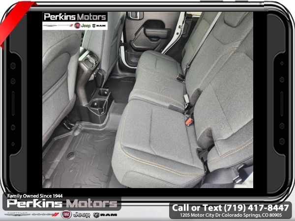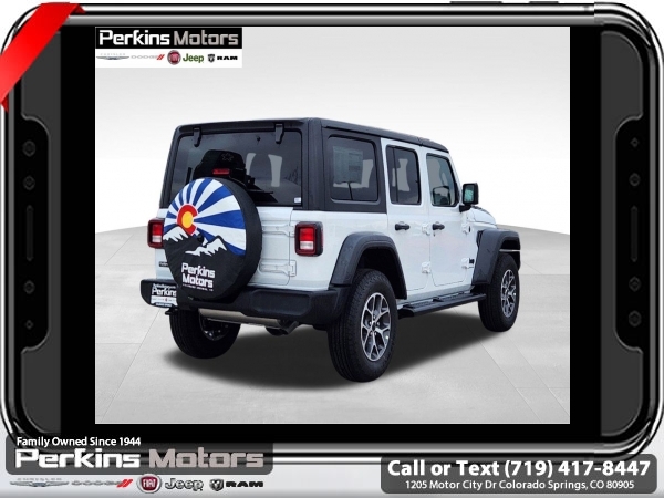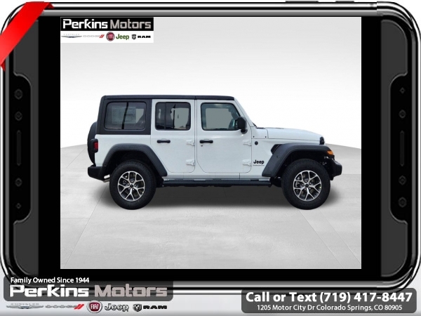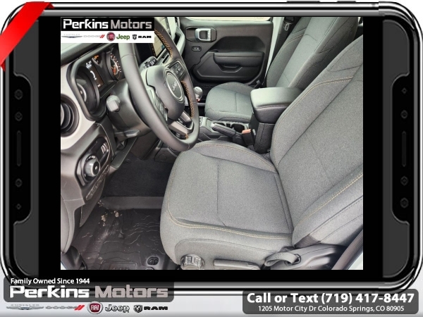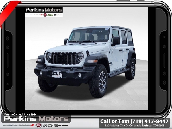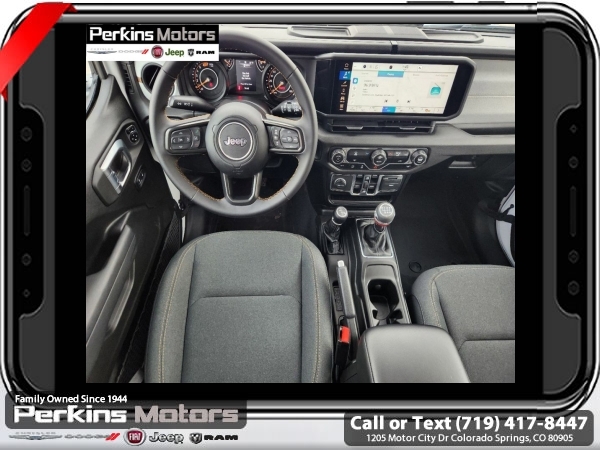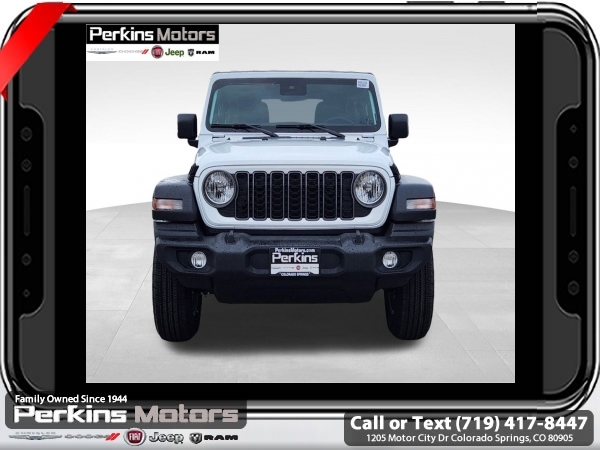 Factory MSRP: $45,975 $9,841 off MSRP! Priced below KBB Fair Purchase Price! Bright White Clearcoat 2025 Jeep Wrangler Sport S 4WD 6-Speed Manual 3.6L V6 24V VVT<br><br>Check us out at www.perkinsmotors.com to see our specials! Since opening our doors in 1944, we’ve been proud to serve Colorado Springs, CO, and the surrounding areas of Pueblo, Castle Rock and Denver, CO. Throughout this time of being family owned for 80 years, we’ve maintained a firm commitment to our customers: to offer a wide selection of New Chrysler, Dodge, Fiat, Jeep, and Ram vehicles and quality pre-owned vehicles, and provide a quick, no-hassle car-buying process that ensures everyone drives off the lot satisfied with their purchase.<br><br>Quick Order Package 23S Sport S (Corning Gorilla Glass, Deep Tint Sunscreen Windows, Full Speed Forward Collision Warning Plus, Power Heated Mirrors, and Sun Visors w/Illuminated Vanity Mirrors), 110 MPH Vehicle Max Speed Calibration, 3.45 Overall Top Gear Ratio, 4-Wheel Disc Brakes, 8 Speakers, ABS brakes, Air Conditioning, Apple CarPlay/Android Auto, Aux Battery, Black 3-Piece Hard Top, Brake assist, Cloth Low-Back Bucket Seats, Compass, Cruise Control, Delay-off headlights, Driver door bin, Driver vanity mirror, Dual front impact airbags, Dual front side impact airbags, Electronic Stability Control, Front anti-roll bar, Front Bucket Seats, Front Center Armrest w/Storage, Front fog lights, Front reading lights, Illuminated entry, Integrated roll-over protection, Low tire pressure warning, MOPAR All-Weather Floor Mats, Mopar Black Tubular Side Steps, Non-Lock Fuel Cap w/o Discriminator, Normal Duty Suspension, Occupant sensing airbag, Outside temperature display, Overhead airbag, Panic alarm, ParkView Rear Back-Up Camera, Passenger door bin, Passenger vanity mirror, Power steering, Power windows, Radio data system, Radio: Uconnect 5 w/12.3 Display, Rear anti-roll bar, Rear reading lights, Rear Window Defroster, Rear Window Wiper/Washer, Remote keyless entry, Split folding rear seat, Steering wheel mounted audio controls, Stop-Start Dual Battery System, Tachometer, Telescoping steering wheel, Tilt steering wheel, Traction control, Trip computer, Variably intermittent wipers, Wheels: 17 x 7.5 Black Steel Styled, and Wheels: 17 x 7.5 Machined w/Black Pockets. Sale price includes all manufacture's incentives and dealer discounts. Sale price not available on lease or compatible with special APR. $1000 - 2025 National Bonus Cash . Exp. 06/30/2025 $2500 - 2025 West BC Regional Bonus Cash. Exp. 06/30/2025
