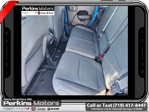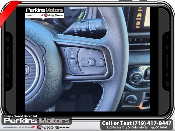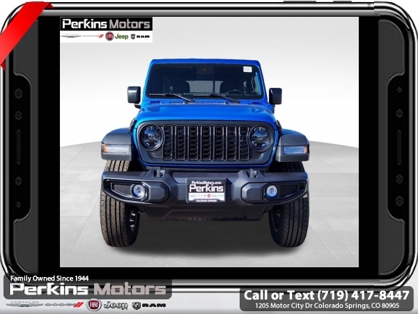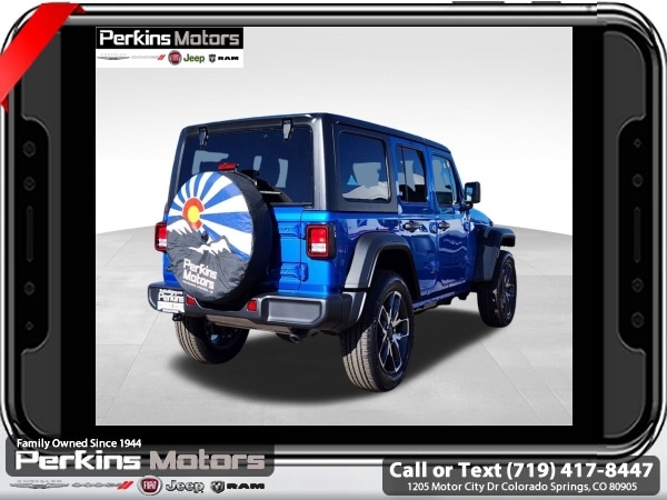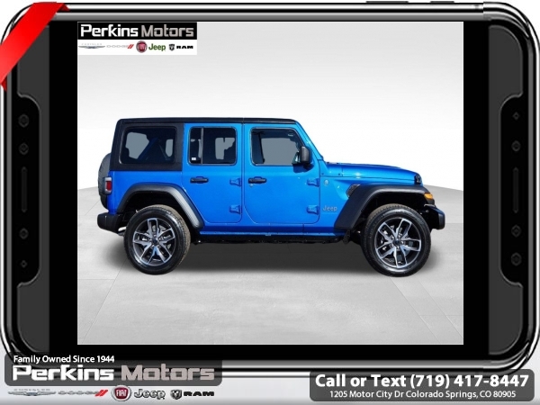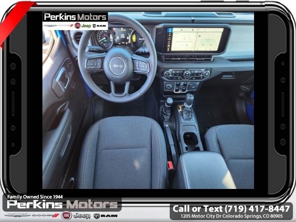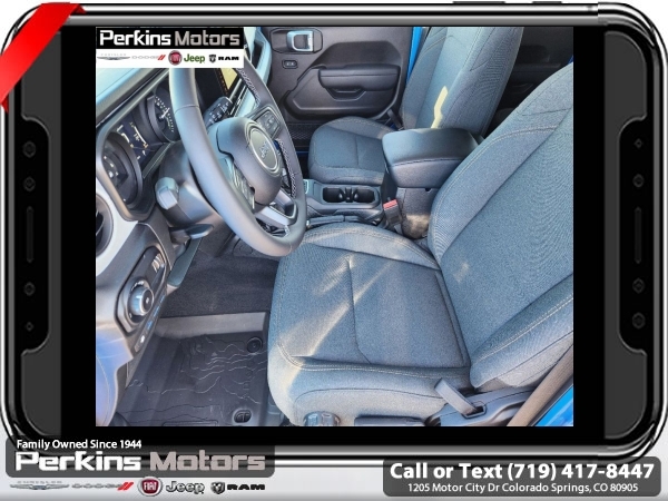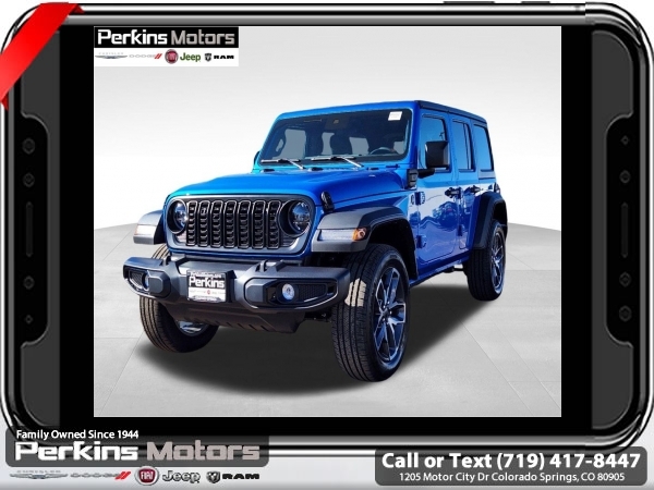 Factory MSRP: $59,430 $10,500 off MSRP! Priced below KBB Fair Purchase Price! Hydro Blue Pearl Coat 2025 Jeep Wrangler Sport S 4xe 4WD 8-Speed Automatic 2.0L I4 DOHC<br>2.0L I4 DOHC.<br>Check us out at www.perkinsmotors.com to see our specials! Since opening our doors in 1944, we’ve been proud to serve Colorado Springs, CO, and the surrounding areas of Pueblo, Castle Rock and Denver, CO. Throughout this time of being family owned for 80 years, we’ve maintained a firm commitment to our customers: to offer a wide selection of New Chrysler, Dodge, Fiat, Jeep, and Ram vehicles and quality pre-owned vehicles, and provide a quick, no-hassle car-buying process that ensures everyone drives off the lot satisfied with their purchase.<br><br>Convenience Group (Emergency/Assistance Call), LED Headlamp & Fog Lamp Group (Front LED Fog Lamps), Quick Order Package 29U Sport S, 2.0L I4 DOHC, 3.73 Rear Axle Ratio, 4-Wheel Disc Brakes, 8 Speakers, ABS brakes, Air Conditioning, Alloy wheels, Apple CarPlay/Android Auto, Black 3-Piece Hard Top, Brake assist, Cloth Low-Back Bucket Seats, Compass, Cruise Control, Delay-off headlights, Driver door bin, Driver vanity mirror, Dual front impact airbags, Dual front side impact airbags, Electronic Stability Control, Freedom Panel Storage Bag, Front anti-roll bar, Front Bucket Seats, Front Center Armrest w/Storage, Front fog lights, Front License Plate Bracket (DISC), Front reading lights, Fully automatic headlights, Heated door mirrors, Illuminated entry, Integrated roll-over protection, Jeep Trail Rated Kit, Low tire pressure warning, MOPAR All-Weather Floor Mats, MOPAR Satin Black Grille, Occupant sensing airbag, Outside temperature display, Overhead airbag, Panic alarm, ParkView Rear Back-Up Camera, Passenger door bin, Passenger vanity mirror, Power door mirrors, Power steering, Power windows, Radio data system, Radio: Uconnect 5 w/12.3 Display, Rear anti-roll bar, Rear reading lights, Remote keyless entry, Security system, Split folding rear seat, Sport Suspension, Steering wheel mounted audio controls, Tachometer, Telescoping steering wheel, Tilt steering wheel, Traction control, Trip computer, Variably intermittent wipers, Voltmeter, and Wheels: 20 x 8 Machined/Painted Gray. Sale price includes all manufacture's incentives and dealer discounts. Sale price not available on lease or compatible with special APR. $500 - 2025 National Presidents Day Bonus Cash. Exp. 03/03/2025 $6500 - 2025 National Retail Consumer Cash. Exp. 03/03/2025