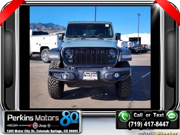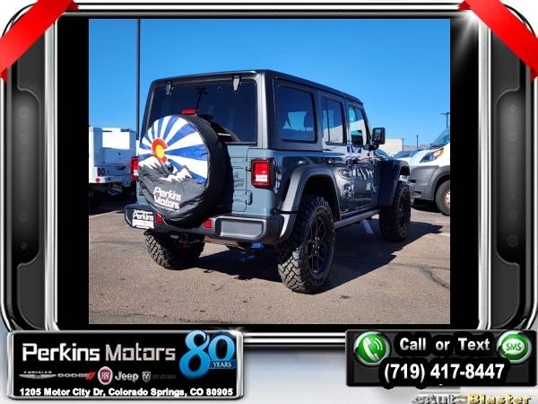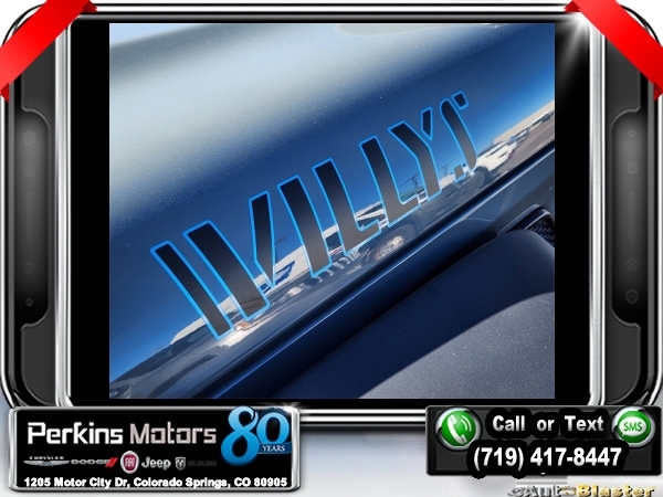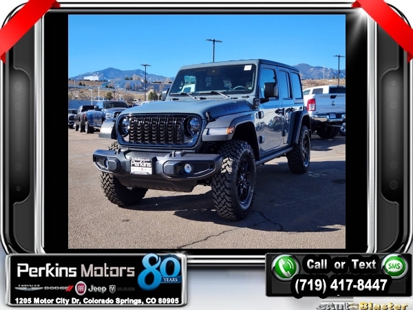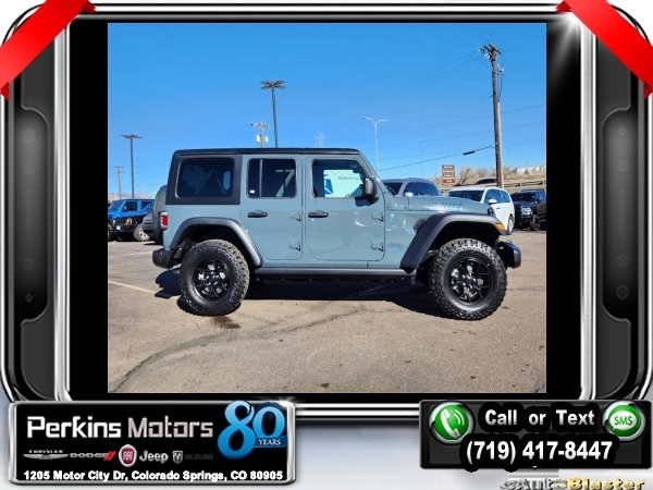 Factory MSRP: $61,715 $7,000 off MSRP! Priced below KBB Fair Purchase Price! Anvil Clear Coat 2025 Jeep Wrangler Willys 4xe 4WD 8-Speed Automatic 2.0L I4 DOHC<br>2.0L I4 DOHC.<br>Check us out at www.perkinsmotors.com to see our specials! Since opening our doors in 1944, we’ve been proud to serve Colorado Springs, CO, and the surrounding areas of Pueblo, Castle Rock and Denver, CO. Throughout this time of being family owned for 80 years, we’ve maintained a firm commitment to our customers: to offer a wide selection of New Chrysler, Dodge, Fiat, Jeep, and Ram vehicles and quality pre-owned vehicles, and provide a quick, no-hassle car-buying process that ensures everyone drives off the lot satisfied with their purchase.<br><br>Convenience Group (Emergency/Assistance Call, Heated Steering Wheel, and Remote Start System), Quick Order Package 29W Willys 4xe (E-Locker Rear Axle, Molded in Color Rubicon Highline Flare, and Wheels: 17 x 7.5 Painted Black), 2.0L I4 DOHC, 3.73 Rear Axle Ratio, 4-Wheel Disc Brakes, 8 Speakers, ABS brakes, Air Conditioning, Alloy wheels, Apple CarPlay/Android Auto, Black 3-Piece Hard Top, Brake assist, Cloth Low-Back Bucket Seats, Compass, Cruise Control, Delay-off headlights, Driver door bin, Driver vanity mirror, Dual front impact airbags, Dual front side impact airbags, Electronic Stability Control, Freedom Panel Storage Bag, Front anti-roll bar, Front Bucket Seats, Front Center Armrest w/Storage, Front fog lights, Front License Plate Bracket (DISC), Front reading lights, Fully automatic headlights, Heated door mirrors, Illuminated entry, Integrated roll-over protection, Low tire pressure warning, Occupant sensing airbag, Outside temperature display, Overhead airbag, Panic alarm, ParkView Rear Back-Up Camera, Passenger door bin, Passenger vanity mirror, Power door mirrors, Power steering, Power windows, Radio data system, Radio: Uconnect 5 w/12.3 Display, Rear anti-roll bar, Rear reading lights, Remote keyless entry, Security system, Split folding rear seat, Sport Suspension, Steering wheel mounted audio controls, Tachometer, Telescoping steering wheel, Tilt steering wheel, Traction control, Trip computer, Variably intermittent wipers, Voltmeter, and Wheels: 20 x 8 Machined/Painted Gray. Sale price includes all manufacture's incentives and dealer discounts. Sale price not available on lease or compatible with special APR. $500 - 2025 National Start Something New Bonus Cash . Exp. 02/03/2025 $6500 - 2025 National Retail Consumer Cash. Exp. 02/03/2025