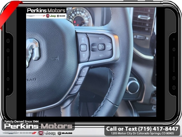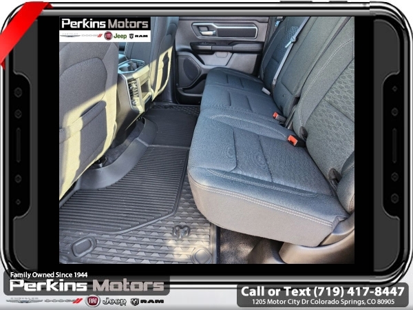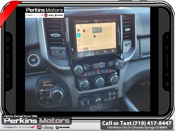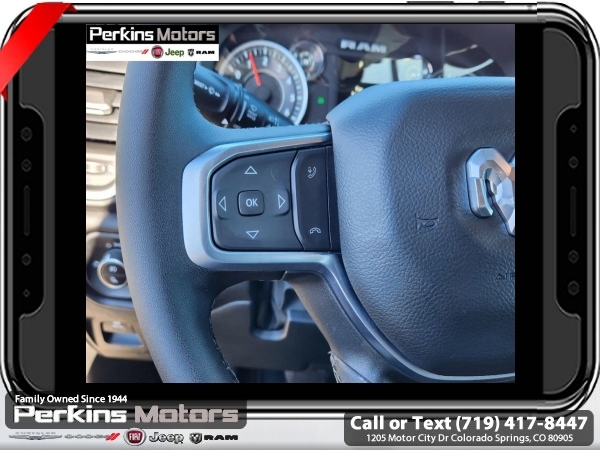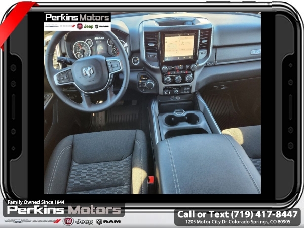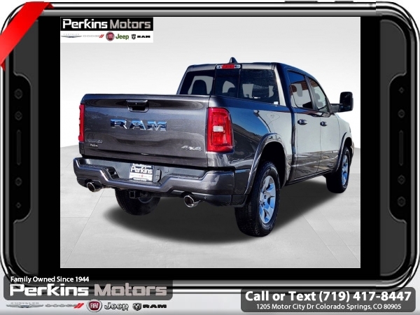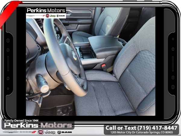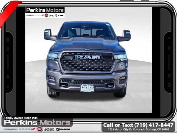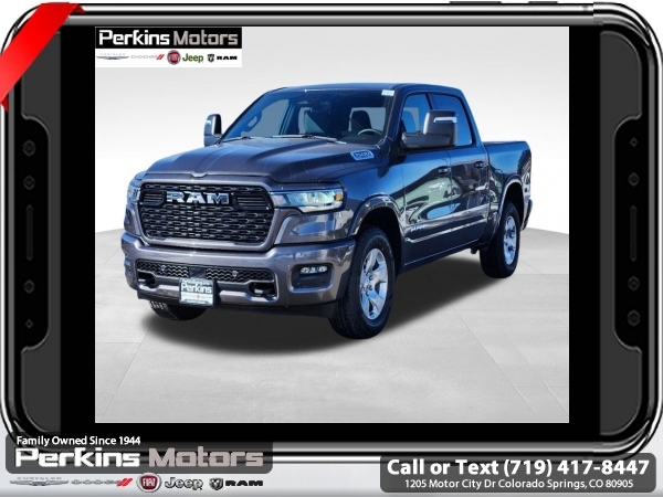 Factory MSRP: $64,000 $14,248 off MSRP! Granite Crystal Metallic Clearcoat 2025 Ram 1500 Big Horn/Lone Star 4WD 8-Speed Automatic 3.0L I6<br><br>Check us out at www.perkinsmotors.com to see our specials! Since opening our doors in 1944, we’ve been proud to serve Colorado Springs, CO, and the surrounding areas of Pueblo, Castle Rock and Denver, CO. Throughout this time of being family owned for 80 years, we’ve maintained a firm commitment to our customers: to offer a wide selection of New Chrysler, Dodge, Fiat, Jeep, and Ram vehicles and quality pre-owned vehicles, and provide a quick, no-hassle car-buying process that ensures everyone drives off the lot satisfied with their purchase.<br><br>Big Horn Level 1 Equipment Group (115V Auxiliary Power Outlet, 2nd Row In Floor Storage Bins, 400W Inverter, Auto Power-Folding Mirrors, Auto-Dimming Exterior Driver Mirror, Auto-Dimming Rear-View Mirror, Black Exterior Mirrors, Black Premium Power Mirrors, Convex Wide-Angle Exterior Mirror Insert, Exterior Mirrors Courtesy Lamps, Exterior Mirrors w/Heating Element, Exterior Mirrors w/Supplemental Signals, Glove Box Lamp, Heated Front Seats, Heated Steering Wheel, Leather Wrapped Steering Wheel, Power 2-Way Driver Lumbar Adjust, Power Adjust 8-Way Driver Seat, Power Adjustable Pedals, Rear Power Sliding Window, Rear Window Defroster, Steering Wheel Mounted Audio Controls, Sun Visors w/Illuminated Vanity Mirrors, and Universal Garage Door Opener), Protection Group (Tow Hooks), Quick Order Package 21Z Big Horn, Sport Appearance Package (3 Rear Seat Head Restraints, 4 Way Front Headrests, Black Interior Accents, Body Color Door Handles, Body Color Front Bumper, Body Color Rear Bumper w/Step Pads, Body Color Tailgate Handle, Bucket Seats, Deluxe Cloth Bucket Seats, Front Seat Back Map Pockets, Full Length Floor Console, Grille Surround 1 Body Color Texture 1 Black, Manual Adjust 4-Way Front Passenger Seat, RAM Grille Badge - Chrome, Rear 60/40 Folding Seat, and Rear Center Armrest), Towing Technology Group (Trailer Hitch Line-Up Assist), Trailer Tow Group (Accent Color Tailgate Handle, Black Trailer Tow Power Mirrors, Manual Folding Exterior Mirrors, Manual Telescoping Mirrors, Mirror Clearance/Running Lights, Power-Adjustable Convex Aux Mirrors, Trailer Brake Control, Trailer Reverse Steering Control, Trailer Tire Pressure Monitoring System, and Trailer Tow Mirrors), 3.21 Rear Axle Ratio, 3.92 Rear Axle Ratio, 33 Gallon Fuel Tank, 4-Wheel Disc Brakes, 4G LTE Wi-Fi Hot Spot, 6 Speakers, 9 Amplified Speakers w/Subwoofer, ABS brakes, Air Conditioning, Alloy wheels, AM/FM radio, Anti-Spin Differential Rear Axle, Apple CarPlay/Android Auto, Auto High-beam Headlights, Brake assist, Bumpers: chrome, Cloth Bench Seat, Compass, Connectivity - US/Canada, Cruise Control, Delay-off headlights, Driver door bin, Dual front impact airbags, Dual front side impact airbags, Electronic Stability Control, Front anti-roll bar, Front Center Armrest w/Storage, Front fog lights, Front License Plate Bracket, Front reading lights, Front wheel independent suspension, Fully automatic headlights, GPS Antenna Input, Heated door mirrors, Illuminated entry, Integrated Voice Command w/Bluetooth, Low tire pressure warning, MOPAR Front & Rear Rubber Floor Mats, Occupant sensing airbag, Outside temperature display, Overhead airbag, Overhead console, Panic alarm, ParkView Rear Back-Up Camera, Passenger door bin, Passenger vanity mirror, Power door mirrors, Power steering, Power windows, Radio data system, Radio: Uconnect 5 W w/8.4 Display, Rear anti-roll bar, Rear seat center armrest, Rear step bumper, Sale price includes all manufacture's incentives and dealer discounts. Sale price not available on lease or compatible with special APR. $1000 - 2025 West BC SFS Bonus Cash . Exp. 06/30/2025 $1000 - 2025 West BC SFS Retail Bonus Cash . Exp. 06/30/2025 $3000 - 2025 National Retail Consumer Cash. Exp. 06/30/2025 $5022 - 2025 National Minimum Employee Pricing Discount. Exp. 0