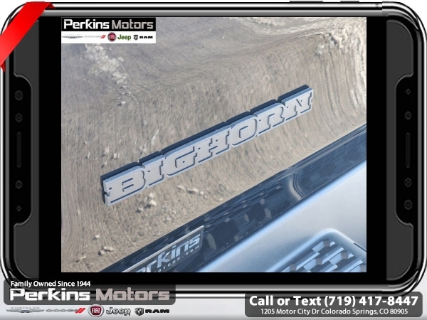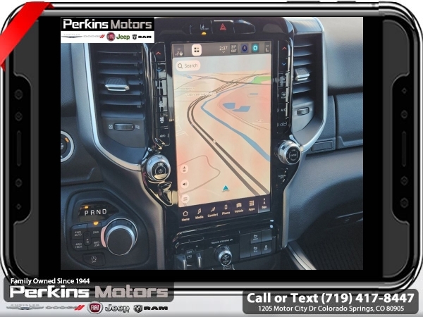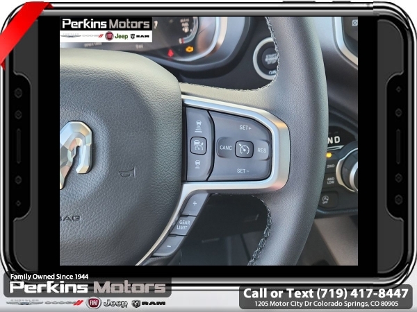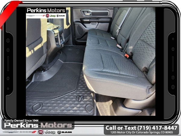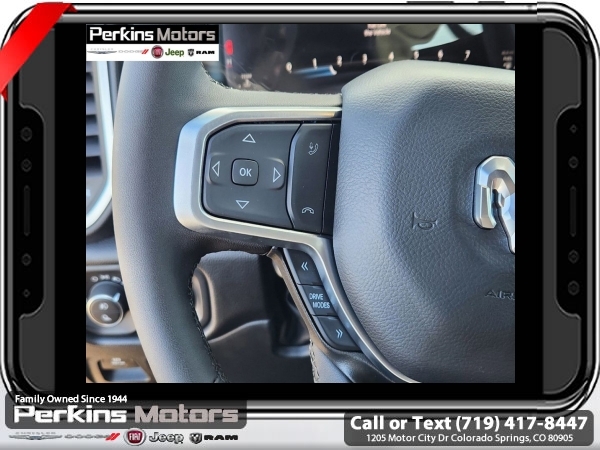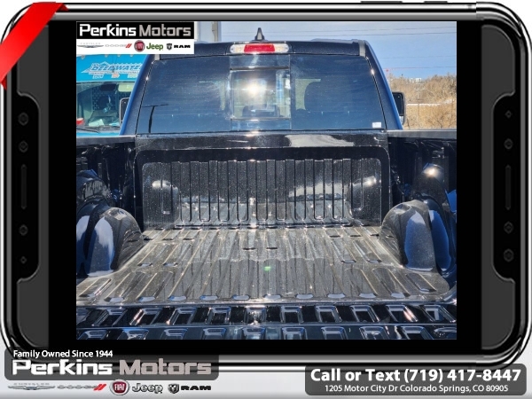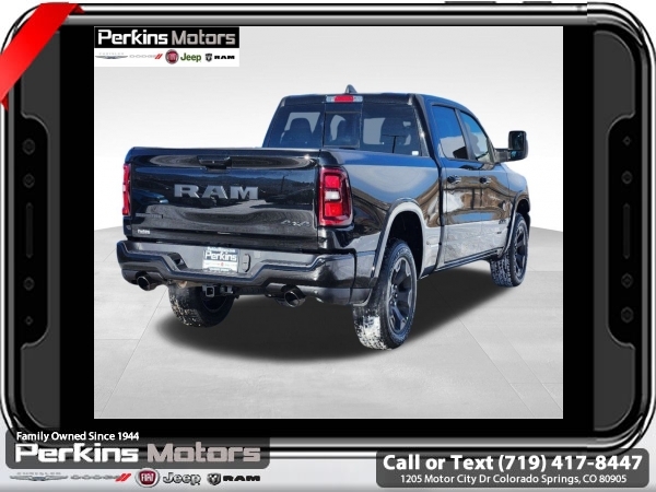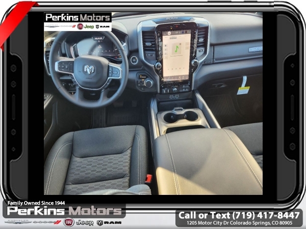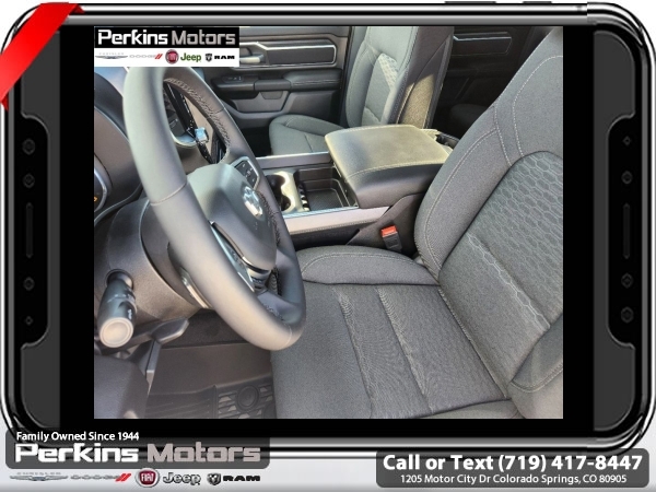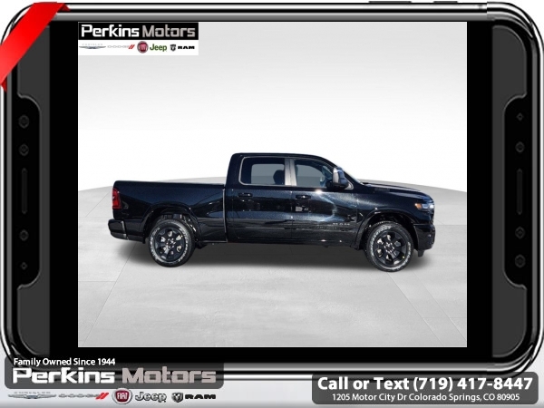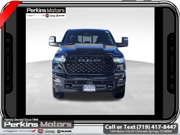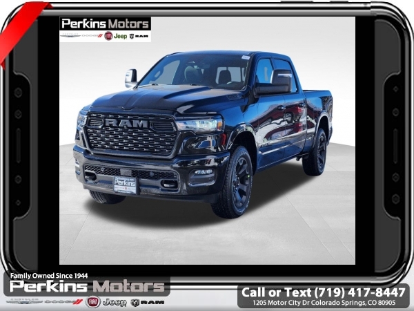 Factory MSRP: $65,220 $15,500 off MSRP! Priced below KBB Fair Purchase Price! Diamond Black Crystal Pearlcoat 2025 Ram 1500 Big Horn/Lone Star 4WD 8-Speed Automatic 3.0L I6<br><br>Check us out at www.perkinsmotors.com to see our specials! Since opening our doors in 1944, we’ve been proud to serve Colorado Springs, CO, and the surrounding areas of Pueblo, Castle Rock and Denver, CO. Throughout this time of being family owned for 80 years, we’ve maintained a firm commitment to our customers: to offer a wide selection of New Chrysler, Dodge, Fiat, Jeep, and Ram vehicles and quality pre-owned vehicles, and provide a quick, no-hassle car-buying process that ensures everyone drives off the lot satisfied with their purchase.<br><br>Big Horn Level 2 Equipment Group (115V Auxiliary Power Outlet, 115V Auxiliary Rear Power Outlet, 12 Touchscreen Display, 2nd Row In Floor Storage Bins, 400W Inverter, 4G LTE Wi-Fi Hot Spot, 9 Amplified Speakers w/Subwoofer, Air Conditioning ATC w/Dual Zone Control, Apple CarPlay, Auto Power-Folding Mirrors, Auto-Dimming Exterior Driver Mirror, Auto-Dimming Rear-View Mirror, Black Exterior Mirrors, Black Premium Power Mirrors, Cluster 7.0 TFT Color Display, Configurable Drive Mode, Connected Travel & Traffic Services, Connectivity - US/Canada, Convex Wide-Angle Exterior Mirror Insert, Exterior Mirrors Courtesy Lamps, Exterior Mirrors w/Heating Element, Exterior Mirrors w/Supplemental Signals, Glove Box Lamp, Google Android Auto, GPS Antenna Input, GPS Navigation, HD Radio, Heated Front Seats, Heated Steering Wheel, Integrated Voice Command w/Bluetooth, Leather Wrapped Steering Wheel, LED Dome Lamp w/On/Off Switch, LED Footwell Lighting, Media Hub w/2 Charge Only USBs, Overhead LED Lamps, Power 2-Way Driver Lumbar Adjust, Power Adjust 8-Way Driver Seat, Power Adjustable Pedals, Premium Overhead Console, Radio: Uconnect 5 Nav w/12.0 Display, Rear Power Sliding Window, Rear Window Defroster, Remote Tailgate Release, Security Alarm, SiriusXM w/360L, Sun Visors w/Illuminated Vanity Mirrors, Universal Garage Door Opener, and USB Host Flip), Night Edition (3 Rear Seat Head Restraints, 4 Way Front Headrests, Accent Color Door Handles, Accent Color Premium Power Mirrors, Anti-Spin Differential Rear Axle, Black Exterior Truck Badging, Black Headlamp Bezels, Black Interior Accents, Black Painted Exterior Mirrors Caps, Black Tail Lamp Bezels, Body Color Front Bumper, Body Color Rear Bumper w/Step Pads, Bucket Seats, Deluxe Cloth Bucket Seats, Dual Exhaust w/Black Tips, Front Seat Back Map Pockets, Full Length Floor Console, Grille Black Surround Black Mesh, Manual Adjust 4-Way Front Passenger Seat, RAM Grille Badge - Black, Rear 60/40 Folding Seat, Rear Center Armrest, and Wheels: 20 x 9.0 Aluminum Painted Clad), Protection Group (Tow Hooks), Quick Order Package 21Z Big Horn, Towing Technology Group (Trailer Hitch Line-Up Assist), Trailer Tow Group (Accent Color Tailgate Handle, Black Trailer Tow Power Mirrors, Manual Folding Exterior Mirrors, Manual Telescoping Mirrors, Mirror Clearance/Running Lights, Power-Adjustable Convex Aux Mirrors, Trailer Brake Control, Trailer Light Check, Trailer Reverse Steering Control, Trailer Tire Pressure Monitoring System, and Trailer Tow Mirrors), 3.55 Rear Axle Ratio, 3.92 Rear Axle Ratio, 4-Wheel Disc Brakes, 6 Speakers, ABS brakes, Air Conditioning, Alloy wheels, AM/FM radio, Apple CarPlay/Android Auto, Auto High-beam Headlights, Brake assist, Bumpers: chrome, Cloth Bench Seat, Cluster 12 TFT Color Display, Compass, Cruise Control, Delay-off headlights, Drive Sale price includes all manufacture's incentives and dealer discounts. Sale price not available on lease or compatible with special APR. $1000 - 2025 National Truck Month Bonus Cash . Exp. 03/03/2025 $1000 - 2025 West BC SFS Bonus Cash . Exp. 03/03/2025 $1000 - 2025 West BC SFS Retail Bonus Cash . Exp. 03/03/2025 $1500 - 2025 National Bonus Cash . Exp. 03/03/2025 $4000 - 2025 National Retail Consumer Cash. Exp. 0