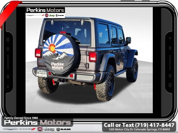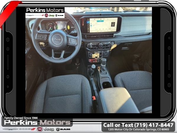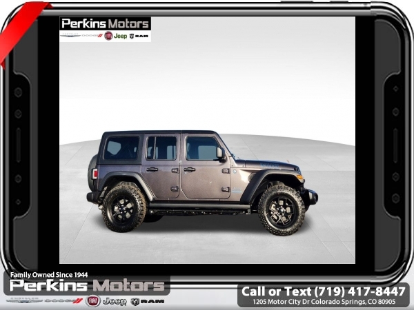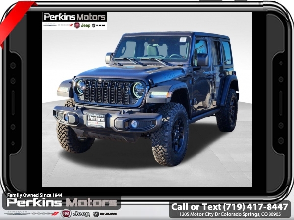 Factory MSRP: $61,715 $12,500 off MSRP! Priced below KBB Fair Purchase Price! Granite Crystal Metallic Clearcoat 2025 Jeep Wrangler Willys 4xe 4WD 8-Speed Automatic 2.0L I4 DOHC<br>2.0L I4 DOHC.<br>Check us out at www.perkinsmotors.com to see our specials! Since opening our doors in 1944, we’ve been proud to serve Colorado Springs, CO, and the surrounding areas of Pueblo, Castle Rock and Denver, CO. Throughout this time of being family owned for 80 years, we’ve maintained a firm commitment to our customers: to offer a wide selection of New Chrysler, Dodge, Fiat, Jeep, and Ram vehicles and quality pre-owned vehicles, and provide a quick, no-hassle car-buying process that ensures everyone drives off the lot satisfied with their purchase.<br><br>Convenience Group (Heated Front Seats and Remote Start System), Quick Order Package 29W Willys 4xe (Conventional Differential Front Axle, Off-Road Plus Mode, and Wheels: 17 x 7.5 Painted Black), 2.0L I4 DOHC, 3.73 Rear Axle Ratio, 4-Wheel Disc Brakes, 8 Speakers, ABS brakes, Air Conditioning, Alloy wheels, Apple CarPlay/Android Auto, Black 3-Piece Hard Top, Brake assist, Cloth Low-Back Bucket Seats, Compass, Cruise Control, Delay-off headlights, Driver door bin, Driver vanity mirror, Dual front impact airbags, Dual front side impact airbags, Electronic Stability Control, Front anti-roll bar, Front Bucket Seats, Front Center Armrest w/Storage, Front fog lights, Front License Plate Bracket (DISC), Front reading lights, Fully automatic headlights, Heated door mirrors, Illuminated entry, Integrated roll-over protection, Low tire pressure warning, Occupant sensing airbag, Outside temperature display, Overhead airbag, Panic alarm, ParkView Rear Back-Up Camera, Passenger door bin, Passenger vanity mirror, Power door mirrors, Power steering, Power windows, Radio data system, Radio: Uconnect 5 w/12.3 Display, Rear anti-roll bar, Rear reading lights, Remote keyless entry, Security system, Split folding rear seat, Sport Suspension, Steering wheel mounted audio controls, Tachometer, Telescoping steering wheel, Tilt steering wheel, Traction control, Trip computer, Variably intermittent wipers, Voltmeter, and Wheels: 20 x 8 Machined/Painted Gray. Sale price includes all manufacture's incentives and dealer discounts. Sale price not available on lease or compatible with special APR. $500 - 2025 National Jeep Celebration Event Bonus Cash . Exp. 03/31/2025 $6500 - 2025 National Retail Consumer Cash. Exp. 03/31/2025