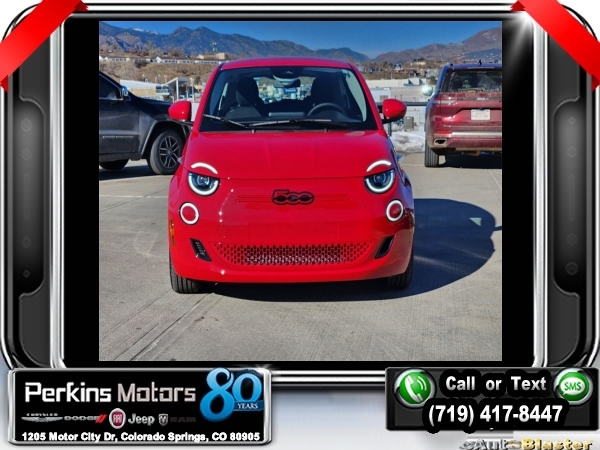 Factory MSRP: $34,095 Red by (Red) 2024 Fiat 500e Battery Electric FWD 1-Speed Automatic Electric<br><br>Check us out at www.perkinsmotors.com to see our specials! Since opening our doors in 1944, we’ve been proud to serve Colorado Springs, CO, and the surrounding areas of Pueblo, Castle Rock and Denver, CO. Throughout this time of being family owned for 80 years, we’ve maintained a firm commitment to our customers: to offer a wide selection of New Chrysler, Dodge, Fiat, Jeep, and Ram vehicles and quality pre-owned vehicles, and provide a quick, no-hassle car-buying process that ensures everyone drives off the lot satisfied with their purchase.<br><br>Quick Order Package 21A 500e Inspi(red), 6 Speakers, ABS brakes, Air Conditioning, Alloy wheels, AM/FM radio: SiriusXM, Anti-whiplash front head restraints, Automatic temperature control, Brake assist, Bumpers: body-color, Cloth Bucket Seats w/Red Accents, Compass, Cruise Control, Delay-off headlights, Driver door bin, Dual front impact airbags, Dual front side impact airbags, Electronic Stability Control, Front anti-roll bar, Front Bucket Seats, Front Center Armrest, Front dual zone A/C, Front reading lights, Front wheel independent suspension, Fully automatic headlights, Illuminated entry, Knee airbag, Low tire pressure warning, Manufacturer's Statement of Origin, Navigation System, Occupant sensing airbag, Outside temperature display, Overhead airbag, Overhead console, Panic alarm, ParkView Rear Back-Up Camera, Passenger door bin, Passenger vanity mirror, Power door mirrors, Power steering, Power windows, Premium audio system: Uconnect 5.0, Radio data system, Radio: Uconnect 5 Nav w/10.25 Display, Rain sensing wipers, Rear anti-roll bar, Rear window defroster, Rear window wiper, Remote keyless entry, Security system, Split folding rear seat, Spoiler, Sport steering wheel, Steering wheel mounted audio controls, Telescoping steering wheel, Tilt steering wheel, Traction control, Trip computer, Variably intermittent wipers, and Wheels: 17 x 7.0 Aluminum Multi-Spoke.