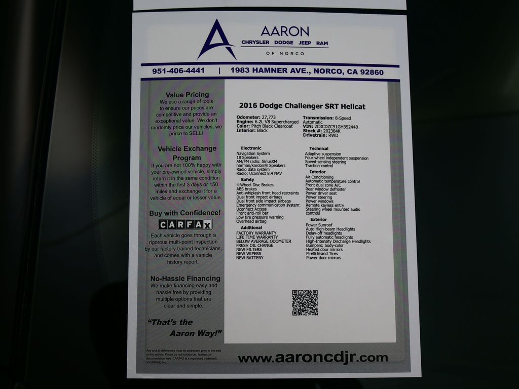 Priced below KBB Fair Purchase Price!BELOW AVERAGE ODOMETER, FRESH OIL CHANGE, NEW FILTERS, NEW WIPERS, Challenger SRT Hellcat, 2D Coupe, 6.2L V8 Supercharged, 8-Speed Automatic, RWD, Alloy wheels, Compass, Front dual zone A/C, Fully automatic headlights, harman/kardon® Speakers, Laguna Performance Seats w/SRT Embossed Logo, Low tire pressure warning, Navigation System, Overhead airbag, ParkView Rear Back-Up Camera, Power Sunroof, Quick Order Package 26R SRT Hellcat, Radio: Uconnect 8.4 NAV, Spoiler, Ventilated front seats, Wheels: 20" x 9.5" SRT Low-Gloss Black Forged.Awards: * JD Power Initial Quality Study (IQS), Vehicle Dependability Study * JD Power Initial Quality Study (IQS), Vehicle Dependability Study (VDS) * JD Power Initial Quality Study (IQS)