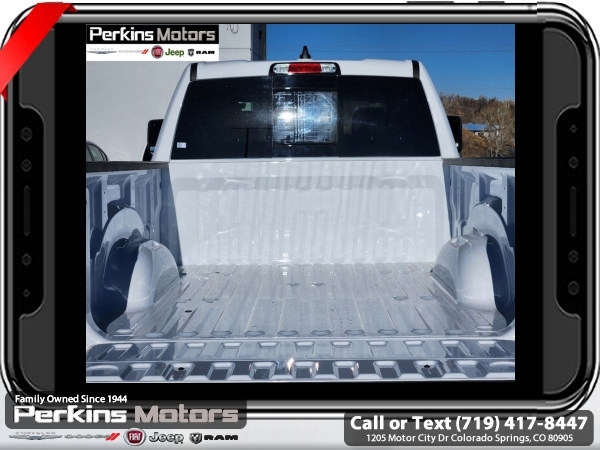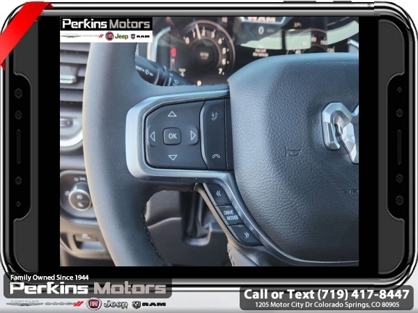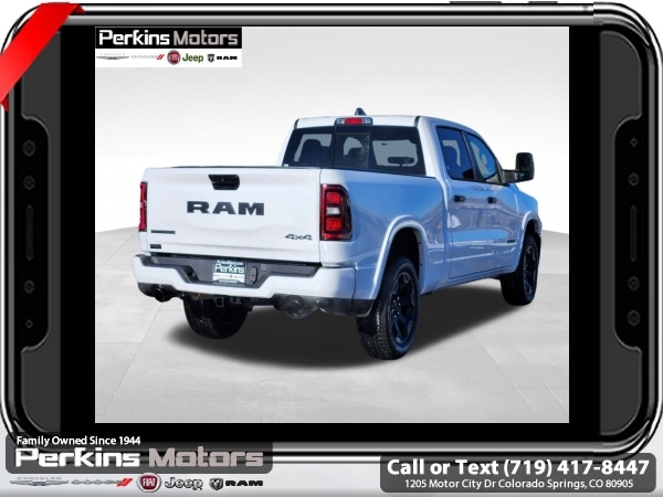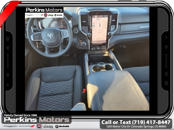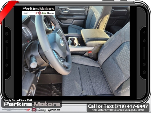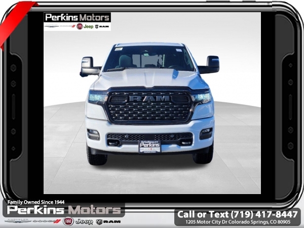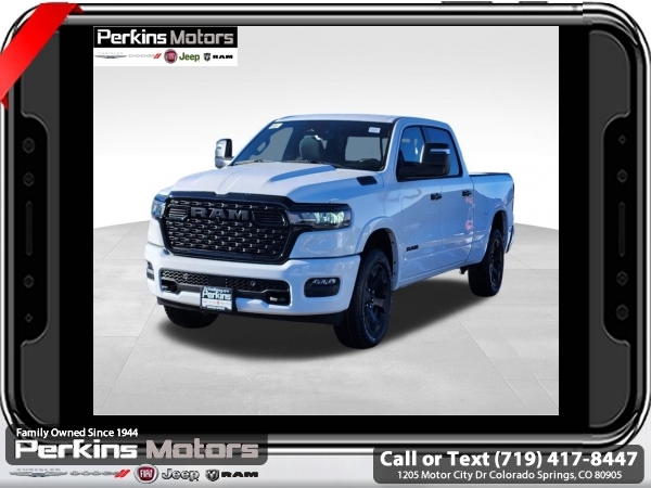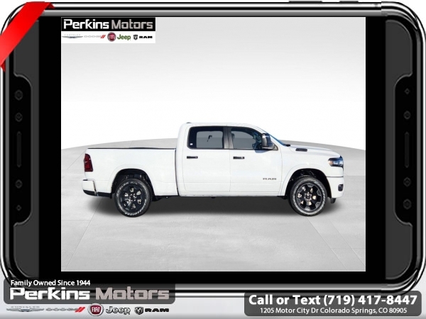 Factory MSRP: $64,975 $15,500 off MSRP! Priced below KBB Fair Purchase Price! Bright White Clearcoat 2025 Ram 1500 Big Horn/Lone Star 4WD 8-Speed Automatic 3.0L I6<br><br>Check us out at www.perkinsmotors.com to see our specials! Since opening our doors in 1944, we’ve been proud to serve Colorado Springs, CO, and the surrounding areas of Pueblo, Castle Rock and Denver, CO. Throughout this time of being family owned for 80 years, we’ve maintained a firm commitment to our customers: to offer a wide selection of New Chrysler, Dodge, Fiat, Jeep, and Ram vehicles and quality pre-owned vehicles, and provide a quick, no-hassle car-buying process that ensures everyone drives off the lot satisfied with their purchase.<br><br>Big Horn Level 2 Equipment Group (115V Auxiliary Power Outlet, 115V Auxiliary Rear Power Outlet, 12 Touchscreen Display, 2nd Row In Floor Storage Bins, 400W Inverter, 4G LTE Wi-Fi Hot Spot, 9 Amplified Speakers w/Subwoofer, Air Conditioning ATC w/Dual Zone Control, Apple CarPlay, Auto Power-Folding Mirrors, Auto-Dimming Exterior Driver Mirror, Auto-Dimming Rear-View Mirror, Black Exterior Mirrors, Black Premium Power Mirrors, Cluster 7.0 TFT Color Display, Configurable Drive Mode, Connected Travel & Traffic Services, Connectivity - US/Canada, Convex Wide-Angle Exterior Mirror Insert, Exterior Mirrors Courtesy Lamps, Exterior Mirrors w/Heating Element, Exterior Mirrors w/Supplemental Signals, Glove Box Lamp, Google Android Auto, GPS Antenna Input, GPS Navigation, HD Radio, Heated Front Seats, Heated Steering Wheel, Integrated Voice Command w/Bluetooth, Leather Wrapped Steering Wheel, LED Dome Lamp w/On/Off Switch, LED Footwell Lighting, Media Hub w/2 Charge Only USBs, Overhead LED Lamps, Power 2-Way Driver Lumbar Adjust, Power Adjust 8-Way Driver Seat, Power Adjustable Pedals, Premium Overhead Console, Radio: Uconnect 5 Nav w/12.0 Display, Rear Power Sliding Window, Rear Window Defroster, Remote Tailgate Release, Security Alarm, SiriusXM w/360L, Sun Visors w/Illuminated Vanity Mirrors, Universal Garage Door Opener, and USB Host Flip), Night Edition (3 Rear Seat Head Restraints, 4 Way Front Headrests, Accent Color Door Handles, Accent Color Premium Power Mirrors, Anti-Spin Differential Rear Axle, Black Exterior Truck Badging, Black Headlamp Bezels, Black Interior Accents, Black Painted Exterior Mirrors Caps, Black Tail Lamp Bezels, Body Color Front Bumper, Body Color Rear Bumper w/Step Pads, Bucket Seats, Deluxe Cloth Bucket Seats, Dual Exhaust w/Black Tips, Front Seat Back Map Pockets, Full Length Floor Console, Grille Black Surround Black Mesh, Manual Adjust 4-Way Front Passenger Seat, RAM Grille Badge - Black, Rear 60/40 Folding Seat, Rear Center Armrest, and Wheels: 20 x 9.0 Aluminum Painted Clad), Protection Group (Tow Hooks), Quick Order Package 21Z Big Horn, Towing Technology Group (Trailer Hitch Line-Up Assist), Trailer Tow Group (Accent Color Tailgate Handle, Black Trailer Tow Power Mirrors, Manual Folding Exterior Mirrors, Manual Telescoping Mirrors, Mirror Clearance/Running Lights, Power-Adjustable Convex Aux Mirrors, Trailer Brake Control, Trailer Light Check, Trailer Reverse Steering Control, Trailer Tire Pressure Monitoring System, and Trailer Tow Mirrors), 3.55 Rear Axle Ratio, 3.92 Rear Axle Ratio, 4-Wheel Disc Brakes, 6 Speakers, ABS brakes, Air Conditioning, Alloy wheels, AM/FM radio, Apple CarPlay/Android Auto, Auto High-beam Headlights, Brake assist, Bumpers: chrome, Cloth Bench Seat, Cluster 12 TFT Color Display, Compass, Cruise Control, Delay-off headlights, Driver door bi Sale price includes all manufacture's incentives and dealer discounts. Sale price not available on lease or compatible with special APR. $1000 - 2025 National Truck Month Bonus Cash . Exp. 03/31/2025 $1000 - 2025 West BC SFS Bonus Cash . Exp. 03/31/2025 $1000 - 2025 West BC SFS Retail Bonus Cash . Exp. 03/31/2025 $1500 - 2025 National Bonus Cash . Exp. 03/31/2025 $4000 - 2025 National Retail Consumer Cash. Exp. 0