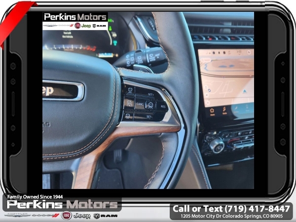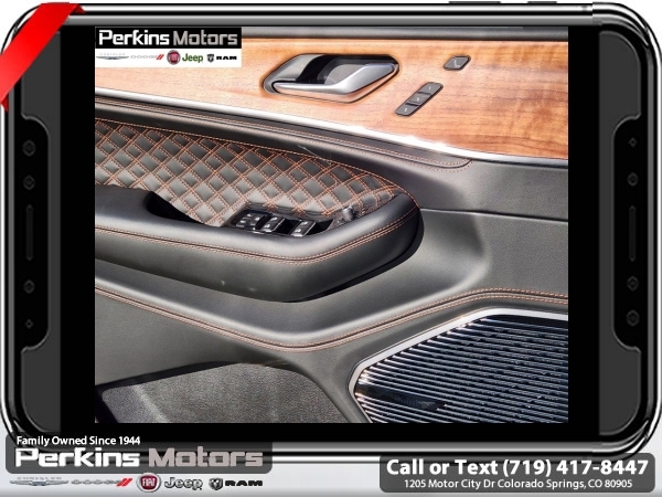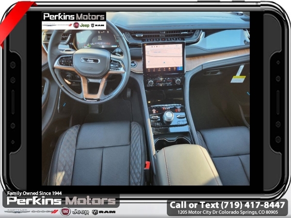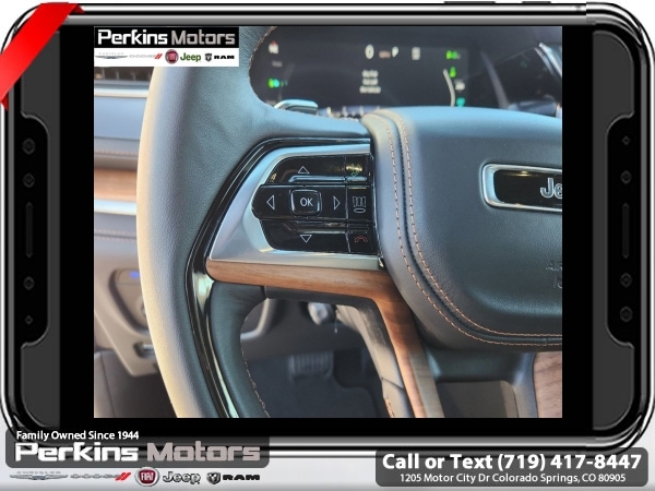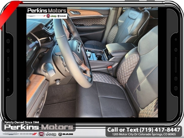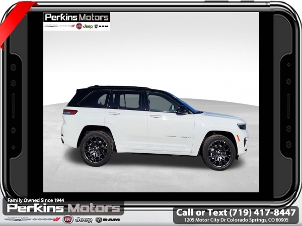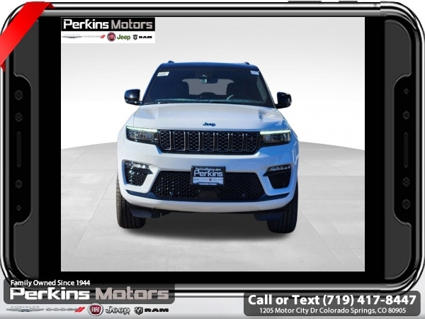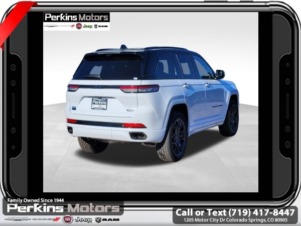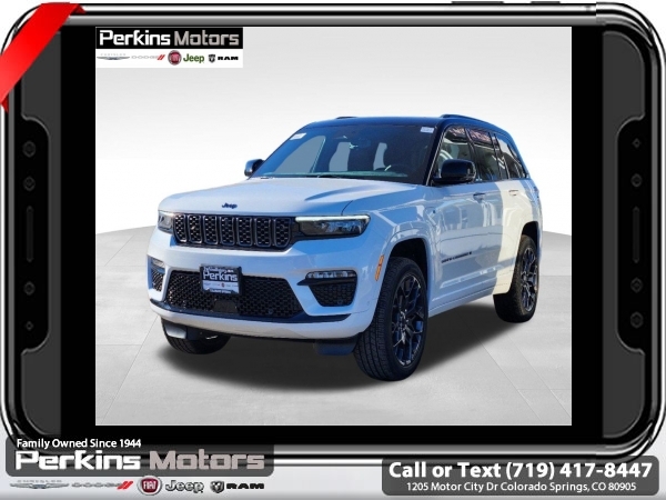 Factory MSRP: $86,740 $12,909 off MSRP! Priced below KBB Fair Purchase Price! Bright White Clearcoat 2025 Jeep Grand Cherokee Summit Reserve 4xe 4WD 8-Speed Automatic 2.0L I4 DOHC<br>2.0L I4 DOHC, 4WD.<br>Check us out at www.perkinsmotors.com to see our specials! Since opening our doors in 1944, we’ve been proud to serve Colorado Springs, CO, and the surrounding areas of Pueblo, Castle Rock and Denver, CO. Throughout this time of being family owned for 80 years, we’ve maintained a firm commitment to our customers: to offer a wide selection of New Chrysler, Dodge, Fiat, Jeep, and Ram vehicles and quality pre-owned vehicles, and provide a quick, no-hassle car-buying process that ensures everyone drives off the lot satisfied with their purchase.<br><br>Advanced Protech Group IV (Heads-Up Display, Night Vision/Pedestrian-Animal Detection, Rearview Autodim Digital Display Mirror, and Windshield Wiper De-Icer), High Altitude Package (Gloss Black Exterior Accents, Neutral Gray Exterior Accents, Painted Door Cladding, and Wheels: 21 x 9.0 Black Painted Aluminum), Luxury Tech Group V (2nd-Row Manual Window Shades and Wireless Charging Pad), Quick Order Package 27U Summit Reserve (Deluxe Headliner, Front Passenger Interactive Display, Palermo Leather Door Trim, Palermo Leather Seats, Summit Reserve, Summit Reserve Badge, Ventilated Rear Seats, and Wheels: 21 x 9 Machined Face/Painted Aluminum), Two Tone Paint Group, 2.0L I4 DOHC, 4WD, 19 Speakers, 3.70 Rear Axle Ratio, 4-Wheel Disc Brakes, ABS brakes, Adaptive suspension, Air Conditioning, Alloy wheels, AM/FM radio: SiriusXM with 360L, Anti-whiplash front head restraints, Audio memory, Auto High-beam Headlights, Auto-dimming door mirrors, Auto-dimming Rear-View mirror, Auto-leveling suspension, Automatic temperature control, Brake assist, Bumpers: body-color, Compass, Cruise Control, Delay-off headlights, Driver door bin, Driver vanity mirror, Dual front impact airbags, Dual front side impact airbags, Electronic Stability Control, Four wheel independent suspension, Front anti-roll bar, Front Bucket Seats, Front Center Armrest w/Storage, Front dual zone A/C, Front fog lights, Front License Plate Bracket, Front reading lights, Fully automatic headlights, Garage door transmitter, Genuine wood dashboard insert, Genuine wood door panel insert, Heated door mirrors, Heated front seats, Heated rear seats, Heated steering wheel, Heavy Duty Suspension, Illuminated entry, Knee airbag, Leather steering wheel, Low tire pressure warning, Memory seat, Model Year Tracking, Nappa Leather Seats, Navigation System, Occupant sensing airbag, Outside temperature display, Overhead airbag, Overhead console, Panic alarm, Passenger door bin, Passenger vanity mirror, Power door mirrors, Power driver seat, Power Liftgate, Power moonroof, Power passenger seat, Power steering, Power windows, Radio data system, Radio: Uconnect 5 Nav w/10.1 Display, Rain sensing wipers, Rear air conditioning, Rear anti-roll bar, Rear dual zone A/C, Rear reading lights, Rear seat center armrest, Rear window defroster, Rear window wiper, Remote keyless entry, Security system, Speed-Sensitive Wipers, Split folding rear seat, Spoiler, Steering wheel memory, Steering wheel mounted audio controls, Tachometer, Telescoping steering wheel, Tilt steering wheel, Traction control, Trip computer, Turn signal indicator mirrors, Variably intermittent wipers, Ventilated front seats, Voltmeter, and Wheels: 20 x 8.5 Fully Painted Aluminum Silver. Sale price includes all manufacture's incentives and dealer discounts. Sale price not available on lease or compatible with special APR. $2000 - 2025 National Retail Consumer Cash. Exp. 06/30/2025