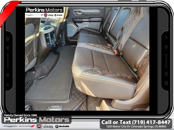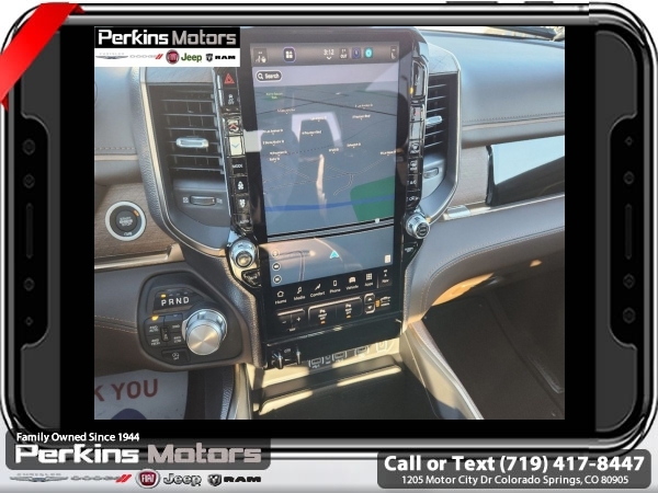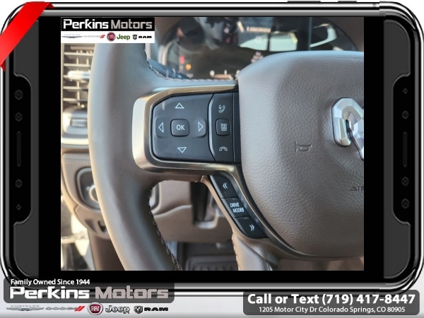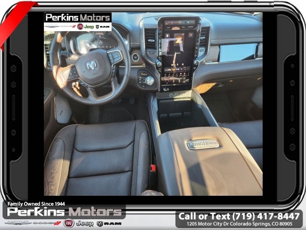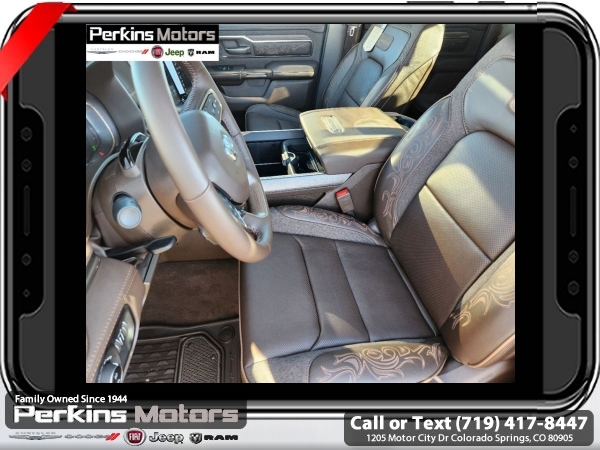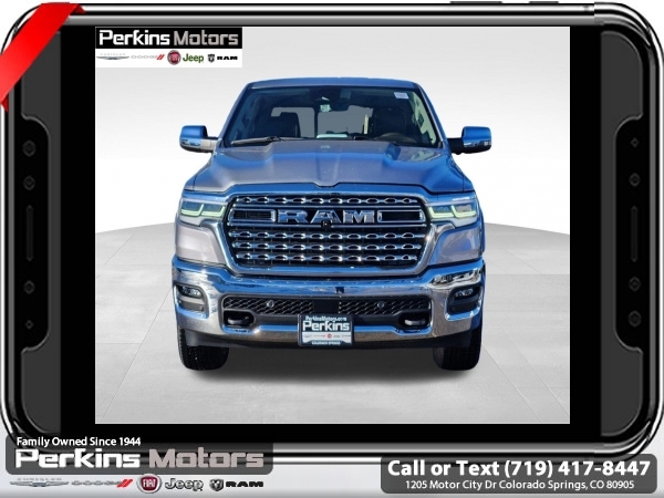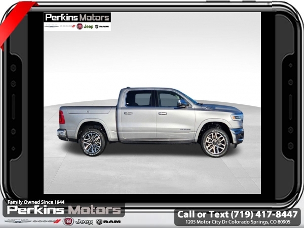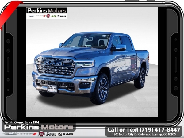 Factory MSRP: $85,140 $15,500 off MSRP! Priced below KBB Fair Purchase Price! Billet Silver Metallic Clearcoat 2025 Ram 1500 Limited 4WD 8-Speed Automatic 3.0L I6<br><br>Check us out at www.perkinsmotors.com to see our specials! Since opening our doors in 1944, we’ve been proud to serve Colorado Springs, CO, and the surrounding areas of Pueblo, Castle Rock and Denver, CO. Throughout this time of being family owned for 80 years, we’ve maintained a firm commitment to our customers: to offer a wide selection of New Chrysler, Dodge, Fiat, Jeep, and Ram vehicles and quality pre-owned vehicles, and provide a quick, no-hassle car-buying process that ensures everyone drives off the lot satisfied with their purchase.<br><br>Bed Utility Group (MOPAR 4 Adjustable Cargo Tie-Down Hooks and Truck Bed Cargo Divider), Limited Level An Equipment Group (12-Way/1-Way Trailer Connector, 14.4 Touchscreen Display, 240 Amp Alternator, 4G LTE Wi-Fi Hot Spot, Apple CarPlay, Connected Travel & Traffic Services, Connectivity - US/Canada, Disassociated Touchscreen Display, Drowsy Driver Detection, Evasive Steer Assist, For Details, Visit DriveUconnect.com, Google Android Auto, GPS Antenna Input, GPS Navigation, Hands-Free Active Driving Assist System, HD Radio, Heads-Up Display, Integrated Voice Command w/Bluetooth, Intersection Collision Assist System, LED CHMSL Lamp, Radio: Uconnect 5 Nav w/14.4 Display, SiriusXM w/360L, Smartphone As A Key Capable, Surround View Camera System, Traffic Sign Recognition, Tri-Fold Tonneau Cover, and USB Host Flip), Quick Order Package 22K Longhorn (Grille Surround 4 Chrome Texture 5 Chrome, Longhorn Badge, Longhorn Instrument Cluster Theme 3, Premium Door Trim Panel, Premium Filigree Leather Seats, and Warm Chrome Key Fob), 19 Speakers, 3.92 Rear Axle Ratio, 4-Wheel Disc Brakes, ABS brakes, Adjustable pedals, Air Conditioning, Alloy wheels, AM/FM radio: SiriusXM with 360L, Apple CarPlay/Android Auto, Audio memory, Auto High-beam Headlights, Auto Power-Folding Mirrors, Auto-dimming door mirrors, Auto-Dimming Exterior Driver Mirror, Auto-dimming Rear-View mirror, Auto-leveling suspension, Automatic temperature control, Bodyside moldings, Brake assist, Bumpers: chrome, Chrome Exterior Mirrors, Compass, Convex Wide-Angle Exterior Mirror Insert, Cruise Control, Delay-off headlights, Dome Dual LED Reading Lamp, Driver door bin, Driver vanity mirror, Dual front impact airbags, Dual front side impact airbags, Dual-Pane Panoramic Sunroof, Electronic Stability Control, Exterior 115V AC Outlet, Exterior Mirrors Courtesy Lamps, Exterior Mirrors w/Heating Element, Exterior Mirrors w/Memory, Exterior Mirrors w/Supplemental Signals, Front anti-roll bar, Front Bucket Seats, Front Center Armrest w/Storage, Front dual zone A/C, Front fog lights, Front License Plate Bracket, Front reading lights, Front wheel independent suspension, Fully automatic headlights, Garage door transmitter, Genuine wood console insert, Genuine wood dashboard insert, Genuine wood door panel insert, harman/kardon® Speakers, Heated door mirrors, Heated front seats, Heated rear seats, Heated steering wheel, Illuminated entry, Leather steering wheel, LED Dome/Reading Lamp, Low tire pressure warning, Manufacturer's Statement of Origin, Memory seat, Navigation System, Occupant sensing airbag, Outside temperature display, Overhead airbag, Overhead console, Panic alarm, ParkView Rear Back-Up Camera, Passenger door bin, Passenger vanity mirror, Pedal memory, Power door mirrors, Power driver seat, Power passenger seat, Power steering, Power windows, Premium Quilted Leather Bucket Seats, Radio data system, Radio: Uconnect 5 Nav w/12.0 Display, Rain sensing w Sale price includes all manufacture's incentives and dealer discounts. Sale price not available on lease or compatible with special APR. $1000 - 2025 National Truck Month Bonus Cash . Exp. 04/30/2025 $1500 - 2025 National Conquest Dealer Cash. Exp. 04/30/2025 $4000 - 2025 National Retail Consumer Cash. Exp. 0