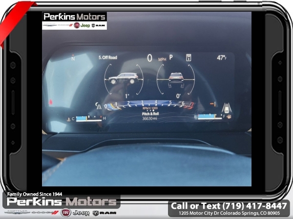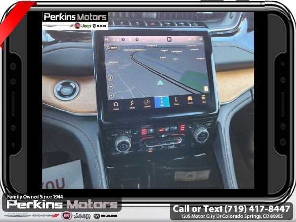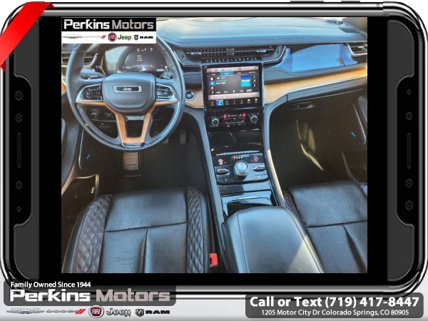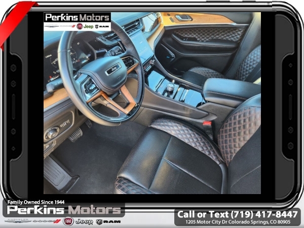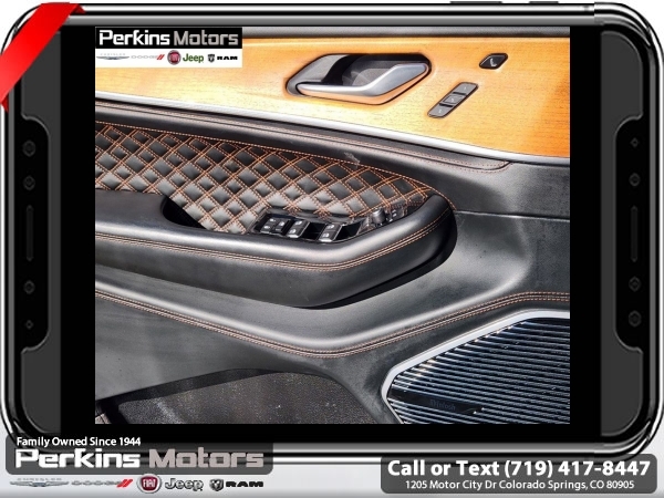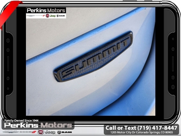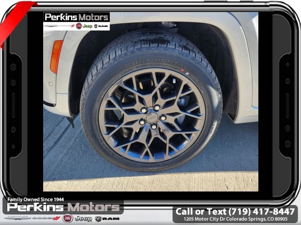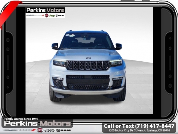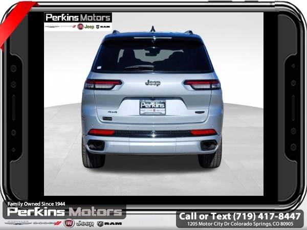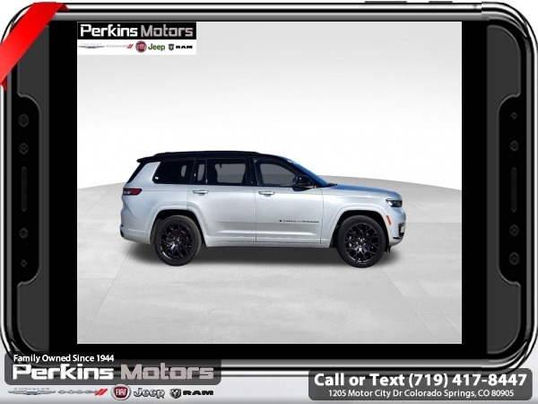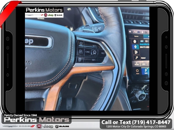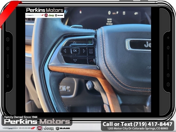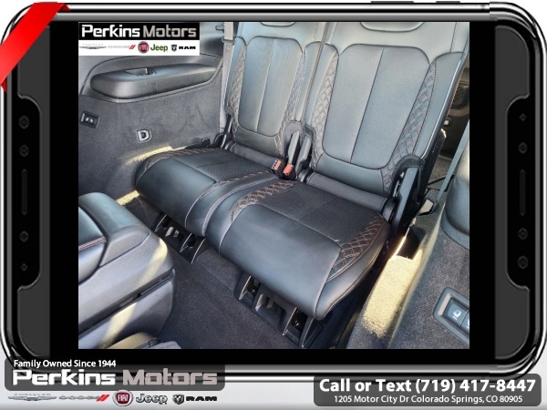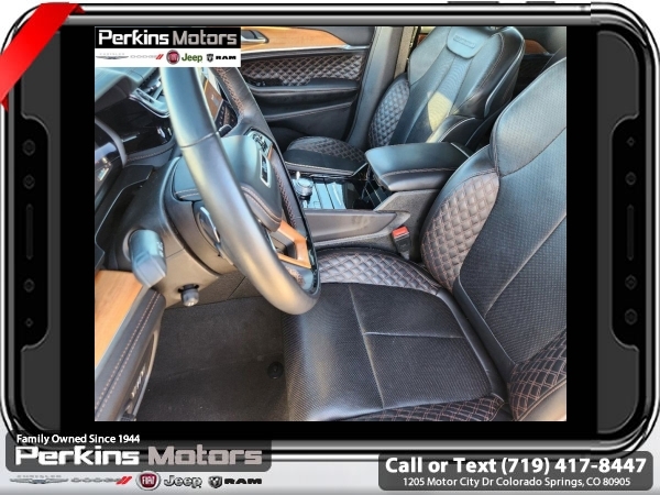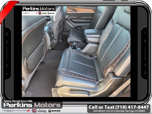 Silver Zynith 4WD 3.6L V6 24V VVT 8-Speed Automatic<br><br>2nd Row Manual Window Shades, Advanced Protech Group IV, Gloss Black Exterior Accents, Gloss Black Roof Rails, Heads-Up Display, High Altitude Package, Interior Rear Facing Camera, Luxury Tech Group V, Navigation System, Neutral Gray Exterior Accents, Night Vision/Pedestrian-Animal Detection, Painted Door Cladding, Rearview Autodim Digital Display Mirror, Wheels: 21 x 9 Black Painted Aluminum, Wireless Charging Pad.<br><br>Certified. FCA US LLC Certified Pre-Owned Details:<br><br> * Transferable Warranty<br> * Roadside Assistance<br> * Limited Warranty: 3 Month/3,000 Mile (whichever comes first) after new car warranty expires or from certified purchase date<br> * Includes First Day Rental, Car Rental Allowance, and Trip Interruption Benefits. SiriusXM 3 month trial subscription<br> * 125 Point Inspection<br> * Vehicle History<br> * Warranty Deductible: $100<br> * Powertrain Limited Warranty: 84 Month/100,000 Mile (whichever comes first) from original in-service date<br><br><br>CARFAX One-Owner. Clean CARFAX.<br><br>Check us out at www.perkinsmotors.com to see our specials! Since opening our doors in 1944, we’ve been proud to serve Colorado Springs, CO, and the surrounding areas of Pueblo, Castle Rock and Denver, CO. Throughout this time of being family owned for 80 years, we’ve maintained a firm commitment to our customers: to offer a wide selection of New Chrysler, Dodge, Fiat, Jeep, and Ram vehicles and quality pre-owned vehicles, and provide a quick, no-hassle car-buying process that ensures everyone drives off the lot satisfied with their purchase.<br><br><br>Advanced Protech Group IV (Heads-Up Display, Interior Rear Facing Camera, Night Vision/Pedestrian-Animal Detection, and Rearview Autodim Digital Display Mirror), High Altitude Package (Gloss Black Exterior Accents, Gloss Black Roof Rails, Neutral Gray Exterior Accents, Painted Door Cladding, and Wheels: 21 x 9 Black Painted Aluminum), Luxury Tech Group V (2nd Row Manual Window Shades and Wireless Charging Pad), Quick Order Package 23U Summit Reserve (19 Speakers High Performance Audio, 950 Watt Amplifier, Active Noise Control System, Deluxe Headliner, Front Passenger Interactive Display, Palermo Leather Door Trim, Palermo Leather Seats, Summit Reserve, Summit Reserve Badge, Ventilated Rear Seats, and Wheels: 21 x 9.0 Machined Face/Painted Aluminum), Two Tone Paint Group, FCA US LLC Certified Pre-Owned Certified, Navigation System, 10 Speakers, 3.45 Rear Axle Ratio, 3rd row seats: split-bench, 4-Wheel Disc Brakes, ABS brakes, Adaptive suspension, Air Conditioning, Alloy wheels, AM/FM radio: SiriusXM with 360L, Anti-whiplash front head restraints, Audio memory, Auto High-beam Headlights, Auto-dimming door mirrors, Auto-dimming Rear-View mirror, Auto-leveling suspension, Automatic temperature control, Brake assist, Bumpers: body-color, Compass, Cruise Control, Delay-off headlights, Driver door bin, Driver vanity mirror, Dual front impact airbags, Dual front side impact airbags, Electronic Stability Control, Emergency communication system, Four wheel independent suspension, Front anti-roll bar, Front Bucket Seats, Front Center Armrest w/Storage, Front dual zone A/C, Front fog lights, Front reading lights, Fully automatic headlights, Garage door transmitter, Genuine wood dashboard insert, Genuine wood door panel insert, Heated door mirrors, Heated front seats, Heated rear seats, Heated steering wheel, Illuminated entry, Knee airbag, Leather steering wheel, Low tire pressure warning, Memory seat, Nappa Leather Seats, Normal Duty Suspension, Occupant sensing airbag, Outside temperature display, Overhead airbag, Overhead console, Panic alarm, Passenger door bin, Passenger vanity mirror, Power door mirrors, Power driver seat, Power Fold Seatbacks, Power Liftgate, Power moonroof, Power passenger seat, Power steering, Power windows, Radio data system, Radio: Uconnect 5 Nav w/10.1 Display, Rain sensing