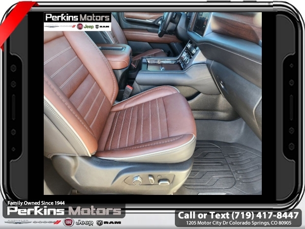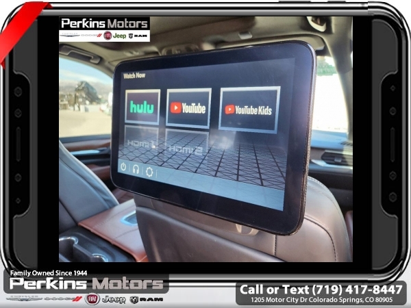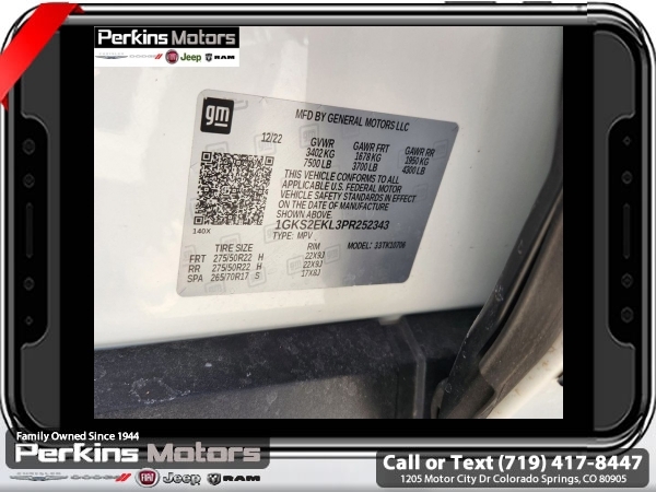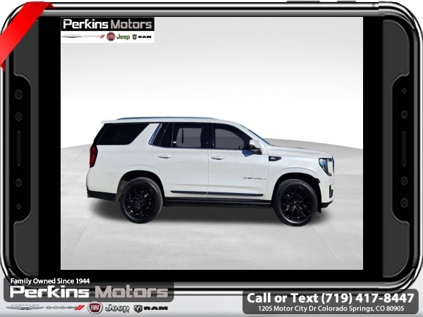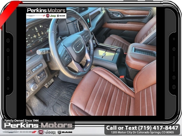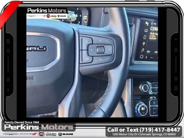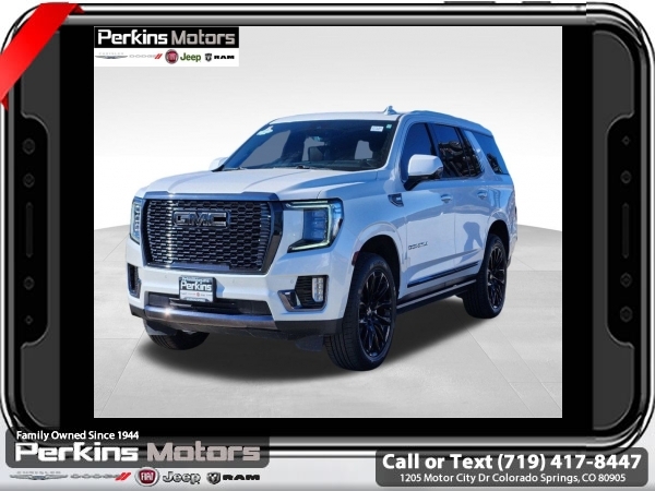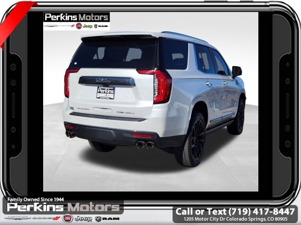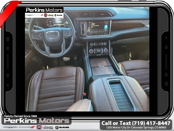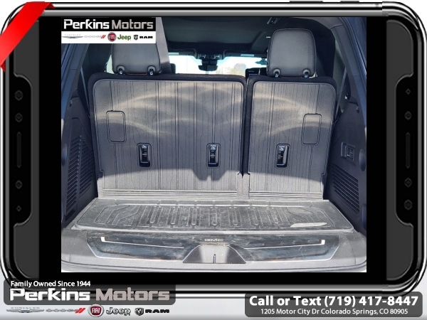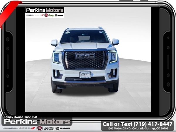 White Frost Tricoat 4WD EcoTec3 6.2L V8 10-Speed Automatic with Overdrive<br><br>4WD, Advanced Security Package, Advanced Technology Package, Air Ride Adaptive Suspension, Electronic Limited Slip Differential (eLSD), Enhanced Automatic Parking Assist, Extra Capacity Cooling System, Glass Breakage Sensor, Inside Rearview Auto-Dimming Rear Camera Mirror, Max Trailering Package, Navigation System, Premium Capability Package w/Active Response 4WD, Rear Camera Mirror Washer, Reverse Automatic Braking, Theft-Deterrent Alarm System, Vehicle Inclination Sensor, Vehicle Interior Movement Sensor.<br><br><br>CARFAX One-Owner. Clean CARFAX.<br><br>Check us out at www.perkinsmotors.com to see our specials! Since opening our doors in 1944, we’ve been proud to serve Colorado Springs, CO, and the surrounding areas of Pueblo, Castle Rock and Denver, CO. Throughout this time of being family owned for 80 years, we’ve maintained a firm commitment to our customers: to offer a wide selection of New Chrysler, Dodge, Fiat, Jeep, and Ram vehicles and quality pre-owned vehicles, and provide a quick, no-hassle car-buying process that ensures everyone drives off the lot satisfied with their purchase.<br><br><br>Advanced Security Package (Glass Breakage Sensor, Theft-Deterrent Alarm System, Vehicle Inclination Sensor, and Vehicle Interior Movement Sensor), Advanced Technology Package (Enhanced Automatic Parking Assist, Inside Rearview Auto-Dimming Rear Camera Mirror, Rear Camera Mirror Washer, and Reverse Automatic Braking), Max Trailering Package (Extra Capacity Cooling System), Premium Capability Package w/Active Response 4WD (Air Ride Adaptive Suspension and Electronic Limited Slip Differential (eLSD)), License Plate Front Mounting Package, Preferred Equipment Group 5SB (15 Diagonal Multi-Color Head-Up Display, 16-Way Power Seat Adjusters, 2 Presets For Outside Rearview Mirrors, 3 Years of GMC Connected Services, 3 Years of OnStar Safety & Security, 3rd Row 60/40 Power-Folding Split-Bench Seat, Adaptive Cruise Control, Bose Performance Series Sound System w/18 Speakers, Bright Front & Rear Door Sill Plates, Chrome Door Handles w/Body-Color Strip, Dual Exhaust System, Dual-Pane Panoramic Power Sunroof, Enhanced Automatic Emergency Braking, Floor Console, Hands-Free Power Programmable Rear Liftgate, HD Surround Vision, Heated & Ventilated Driver & Front Passenger Seats, Heated 2nd Row Outboard Position Seats, Heated Driver & Front Passenger Seats, Heated Steering Wheel, Hill Descent Control, Leather-Wrapped Steering Wheel, Outside Heated Power-Adjustable Mirrors, Power Release 2nd Row Bucket Seats, Power Tilt & Telescopic Steering Column, Power-Retractable Assist Steps, Rear Cross Traffic Alert, Rear Pedestrian Alert, Rear Seat Media System, Safety Alert Seat, Sport Pedal Cover Kit (LPO), Universal Home Remote, Vader Bodyside Moldings, and Wireless Charging), 4WD, Navigation System, 18 Speakers, 3 Years of OnStar Safety & Security (DISC), 3.23 Rear Axle Ratio, 3rd row seats: split-bench, 4-Wheel Disc Brakes, ABS brakes, Adaptive suspension, Air Conditioning, Alloy wheels, AM/FM radio: SiriusXM with 360L, AM/FM Stereo, Apple CarPlay/Android Auto, Auto High-beam Headlights, Auto-dimming door mirrors, Auto-dimming Rear-View mirror, Auto-leveling suspension, Automatic temperature control, Bodyside moldings, Brake assist, Bumpers: body-color, Compass, Cruise Control, Delay-off headlights, Driver door bin, Driver vanity mirror, Dual front impact airbags, Dual front side impact airbags, Electronic Stability Control, Emergency communication system: OnStar and GMC connected services capable, Four wheel independent suspension, Front anti-roll bar, Front Bucket Seats, Front Center Armrest, Front dual zone A/C, Front fog lights, Front reading lights, Full Grain Leather Seats, Fully automatic headlights, Garage door transmitter, Headphones, Heads-Up Display, Heated door mirrors, Heated front seats, Heated rear seats, Heated steering wheel, Hitch Guidance w/Hitch