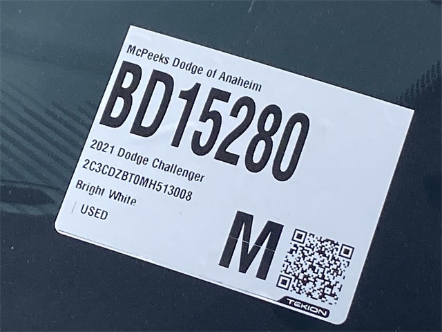 Certified. Odometer is 25222 miles below market average! Clean CARFAX. CARFAX One-Owner. INTERIOR & EXTERIOR PROFESSIONALLY DETAILED FOR DELIVERY, MCPEEK CHRYSLER DODGE JEEP RAM FAMILY OWNED AND OPERATED SINCE 1961 !!!!!.White Knuckle Clearcoat 2021 Dodge Challenger R/T RWD 8-Speed AutomaticDodge Details: * Warranty Deductible: $100 * Vehicle History * Limited Warranty: 3 Month/3,000 Mile (whichever comes first) after new car warranty expires or from certified purchase date (for FCA US LLC Certified Pre-Owned program) * Transferable Warranty (for FCA US LLC Certified Pre-Owned program) * Powertrain Limited Warranty: 84 Month/100,000 Mile (whichever comes first) from original in-service date (for FCA US LLC Certified Pre-Owned program) * Includes First Day Rental, Car Rental Allowance, and Trip Interruption Benefits. SiriusXM 3 month trial subscription. (for FCA US LLC Certified Pre-Owned program), Vehicles Up to 120,000 Miles and 5 Model Years Between 75,001 and 120,000 Miles. 3 Month/3,000 Mile Maximum Care Limited Warranty, Whichever Comes First, Measured From Certified Pre-Owned Purchase Date. Thorough Reconditioning Process Using Authentic Mopar Parts. Car Rental Allowance, 3-Month Trial Subscription for SiriusXM GuardianTM and Satellite Radio (Excluding Hellcat Vehicles) (for Certified Pre-Owned Go program) * Roadside Assistance * 125 Point InspectionReceive Free lube and oil filter changes for up to 45,000 miles for 3 years!!! McPeek's Dodge of Anahiem 1221 S. Auto Center Drive Anahiem, CA 92806 714-262-4902.
