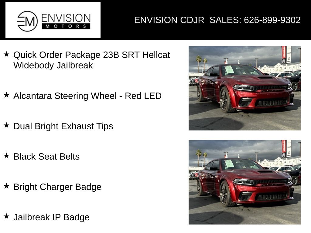 WE SPECIALIZE IN ALL CREDIT PROFILES! See what we can do for you! Call to find out (626) 899-9302.CARFAX One-Owner. Clean CARFAX.Odometer is 2287 miles below market average! Hammer-Head Gray/Black Leather, Alcantara Steering Wheel - Red LED, Black Seat Belts, Bright Charger Badge, Dual Bright Exhaust Tips, Jailbreak IP Badge, Quick Order Package 23B SRT Hellcat Widebody Jailbreak.Octane Red Pearlcoat2023 Dodge Charger SRT Hellcat Widebody RWD 8-Speed Automatic 6.2L 8-Cylinder SMPI Supercharged OHV**********All Pricing and Advertised Prices for any/all vehicles offered for sale does not include dealer installed accessories which can be purchased for an additional cost.********** The Factory Rebates may not be available on this vehicle if you elect to take advantage of a Special Alternative APR or Special Lease program. Some Factory Rebates are California Resident specific and may vary for residents of other states. NO sales to Dealers, Brokers or Exporters. For out of state purchase, customers must be present to purchase. If shipping is required, dealership must facilitate; no exceptions. Please contact us for special Multi-Vehicle or Fleet pricing. Prices are plus government fees and taxes, any finance charges, $85 documentary fee, $29 electronic registration fee, any emission testing charge and $1.75 per new tire state tire fee. *** We make every effort to provide accurate information, but please verify before purchasing. Leasing & financing available on approved credit. Trade-ins accepted. Subject to prior sale.