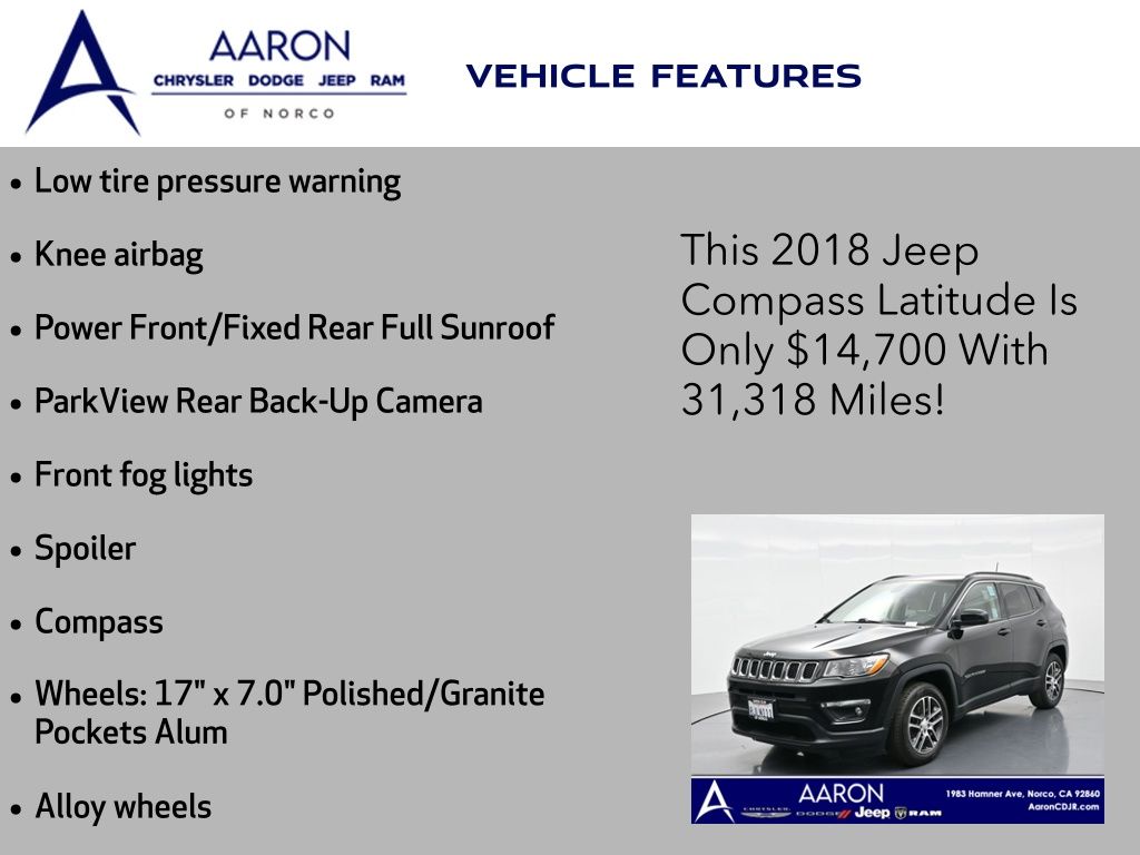 Priced below KBB Fair Purchase Price!FACTORY WARRANTY, BELOW AVERAGE ODOMETER, FRESH OIL CHANGE, NEW FILTERS, NEW WIPERS, NEW BATTERY, Compass Latitude, 4D Sport Utility, 2.4L I4, 6-Speed Aisin Automatic, FWD, Alloy wheels, Compass, Front fog lights, Knee airbag, Low tire pressure warning, ParkView Rear Back-Up Camera, Power Front/Fixed Rear Full Sunroof, Quick Order Package 28K Sun & Wheel, Radio: Uconnect 3 w/5" Display, Spoiler, Wheels: 17" x 7.0" Polished/Granite Pockets Alum.For help with any Vehicle needs please call us directly at 951-621-1288.Clean CARFAX.Awards: * 2018 KBB.com 10 Best All-Wheel-Drive Vehicles Under $25,000 * 2018 KBB.com 10 Most Awarded Brands