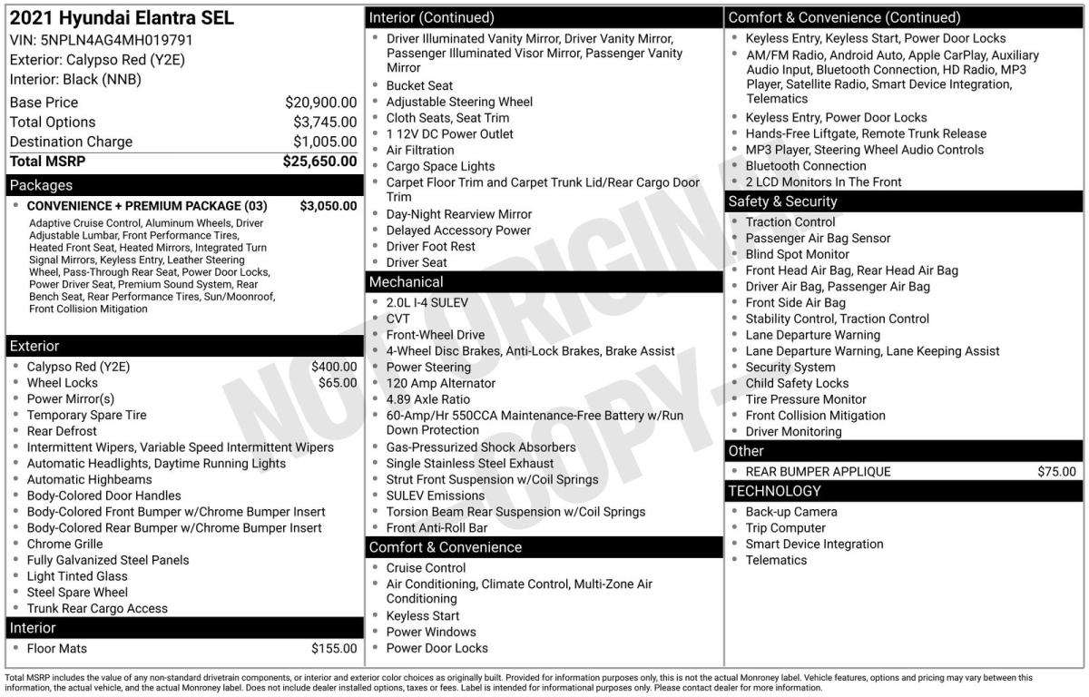Discover the perfect blend of style, technology, and performance in this 2021 Hyundai Elantra SEL. With its sleek exterior, advanced features, and exceptional fuel efficiency, this sedan is the ideal choice for the discerning driver.Highlighted by the Convenience + Premium Package, this Elantra SEL offers a wealth of premium amenities:• Wireless Device Charging• Smart Cruise Control with Stop & Go• Full 10.25" LCD TFT Cluster• Heated Front Seats• Bose Premium Audio System• Power SunroofThe Elantra's striking Calypso Red exterior exudes confidence and style, while the dark chrome accents and alloy wheels add a touch of sophistication. Step inside and you'll be greeted by a spacious and well-appointed cabin, featuring a leather-wrapped steering wheel, power driver's seat with lumbar support, and a host of connectivity and safety technologies.Under the hood, the 2.0L 4-cylinder engine delivers an impressive 31 city/41 highway MPG, making this Elantra an exceptional value for the modern driver. With its responsive handling and smooth CVT transmission, this sedan provides a refined and engaging driving experience.But the true standout feature of this Elantra SEL is its comprehensive suite of advanced safety systems. From Forward Collision Avoidance Assist to Smart Cruise Control, this vehicle is designed to keep you and your loved ones secure on the road. The Hyundai Digital Key feature also adds a convenient touch, allowing you to access and start your car with your smartphone.With its one-owner CARFAX history and low mileage, this 2021 Hyundai Elantra SEL represents an exceptional opportunity. Don't miss your chance to experience the perfect balance of style, technology, and performance. Contact us today to schedule a test drive and discover why this Elantra should be your next vehicle.