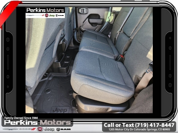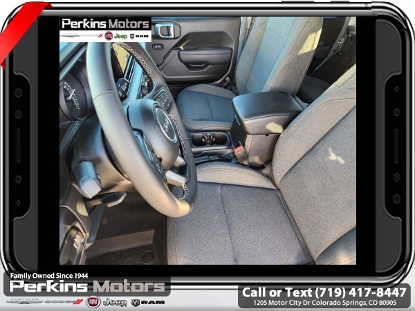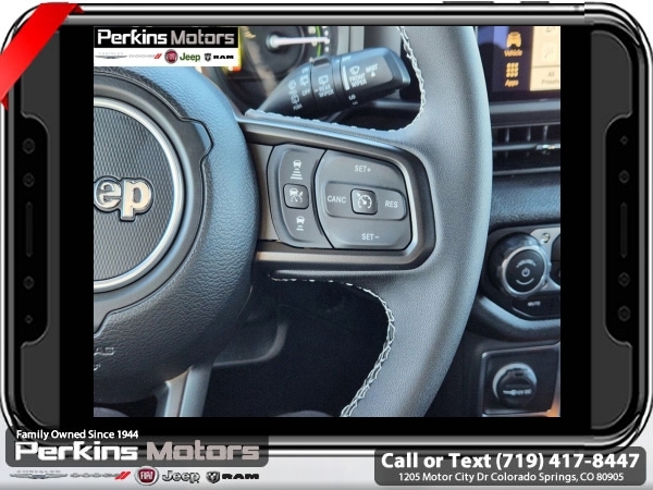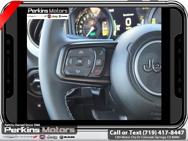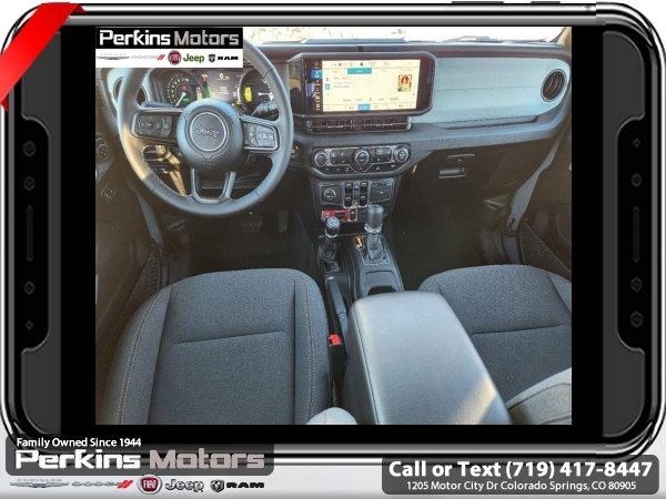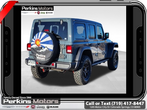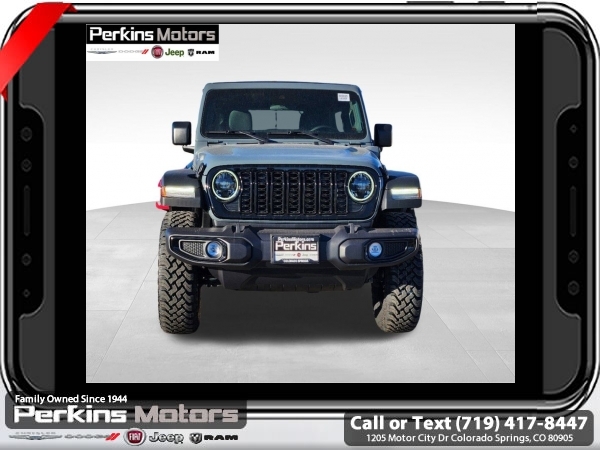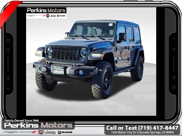 Factory MSRP: $66,200 $10,500 off MSRP! Anvil Clear Coat 2025 Jeep Wrangler Willys 4xe 4WD 8-Speed Automatic 2.0L I4 DOHC<br>2.0L I4 DOHC.<br>Check us out at www.perkinsmotors.com to see our specials! Since opening our doors in 1944, we’ve been proud to serve Colorado Springs, CO, and the surrounding areas of Pueblo, Castle Rock and Denver, CO. Throughout this time of being family owned for 80 years, we’ve maintained a firm commitment to our customers: to offer a wide selection of New Chrysler, Dodge, Fiat, Jeep, and Ram vehicles and quality pre-owned vehicles, and provide a quick, no-hassle car-buying process that ensures everyone drives off the lot satisfied with their purchase.<br><br>Convenience Group (2-Door Passive Entry, Front Door Locks and Universal Garage Door Opener), Quick Order Package 29W Willys 4xe (4-Wheel Drive Swing Gate Decal, Auxiliary Switches, Black Grille, Conventional Differential Front Axle, Front LED Fog Lamps, and Willys 4xe Hood Decal), 2.0L I4 DOHC, 3.73 Rear Axle Ratio, 4-Wheel Disc Brakes, 8 Speakers, ABS brakes, Air Conditioning, Alloy wheels, Apple CarPlay/Android Auto, Brake assist, Cloth Low-Back Bucket Seats, Compass, Cruise Control, Delay-off headlights, Driver door bin, Driver vanity mirror, Dual front impact airbags, Dual front side impact airbags, Electronic Stability Control, Front anti-roll bar, Front Bucket Seats, Front Center Armrest w/Storage, Front fog lights, Front License Plate Bracket (DISC), Front reading lights, Fully automatic headlights, Heated door mirrors, Illuminated entry, Integrated roll-over protection, Jeep Trail Rated Kit, Low tire pressure warning, MOPAR Cargo Tub Liner, MOPAR Doors Off Mirror Kit, MOPAR Hinge-Gate Reinforcement, MOPAR Plastic Door Sill Guards, Occupant sensing airbag, Outside temperature display, Overhead airbag, Panic alarm, ParkView Rear Back-Up Camera, Passenger door bin, Passenger vanity mirror, Power door mirrors, Power steering, Power windows, Radio data system, Radio: Uconnect 5 w/12.3 Display, Rear anti-roll bar, Rear reading lights, Rear Window Defroster, Remote keyless entry, Security system, Sky 1-Touch Power Top, Split folding rear seat, Sport Suspension, Steering wheel mounted audio controls, Tachometer, Telescoping steering wheel, Tilt steering wheel, Traction control, Trip computer, Variably intermittent wipers, Voltmeter, and Wheels: 20 x 8 Machined/Painted Gray. Sale price includes all manufacture's incentives and dealer discounts. Sale price not available on lease or compatible with special APR. $500 - 2025 National Presidents Day Bonus Cash. Exp. 03/03/2025 $6500 - 2025 National Retail Consumer Cash. Exp. 03/03/2025