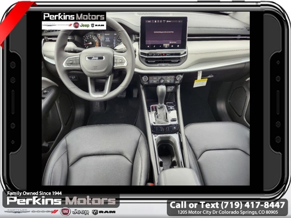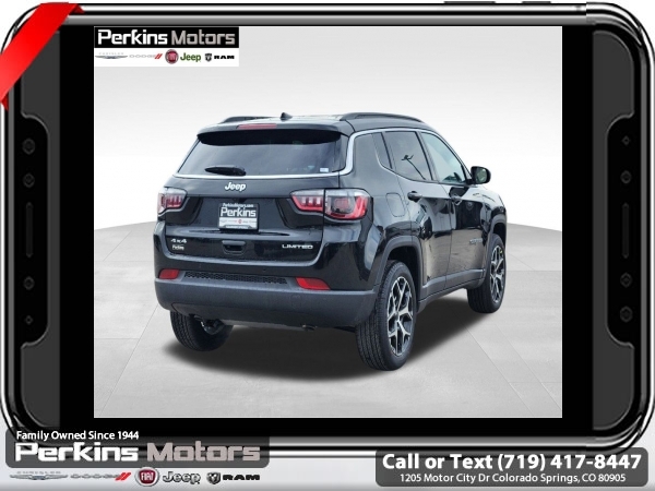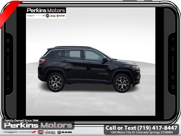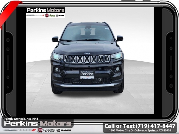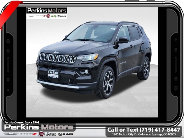 Factory MSRP: $34,435 $4,000 off MSRP! Priced below KBB Fair Purchase Price! Diamond Black Crystal Pearlcoat 2025 Jeep Compass Limited 4WD 8-Speed Automatic 2.0L I4 DOHC<br>4WD.<br>Check us out at www.perkinsmotors.com to see our specials! Since opening our doors in 1944, we’ve been proud to serve Colorado Springs, CO, and the surrounding areas of Pueblo, Castle Rock and Denver, CO. Throughout this time of being family owned for 80 years, we’ve maintained a firm commitment to our customers: to offer a wide selection of New Chrysler, Dodge, Fiat, Jeep, and Ram vehicles and quality pre-owned vehicles, and provide a quick, no-hassle car-buying process that ensures everyone drives off the lot satisfied with their purchase.<br><br>Quick Order Package 29G, 4WD, 10.1 Touchscreen Display, 3.73 Final Drive Ratio, 4-Wheel Disc Brakes, 6 Speakers, ABS brakes, Air Conditioning, Alloy wheels, AM/FM radio: SiriusXM, Auto High-beam Headlights, Auto-dimming Rear-View mirror, Automatic temperature control, Brake assist, Bumpers: body-color, Compass, Cruise Control, Delay-off headlights, Driver door bin, Driver vanity mirror, Dual front impact airbags, Dual front side impact airbags, Electronic Stability Control, Emergency communication system: Jeep Connect, Four wheel independent suspension, Front anti-roll bar, Front Bucket Seats, Front Center Armrest w/Storage, Front dual zone A/C, Front fog lights, Front License Plate Bracket, Front reading lights, Fully automatic headlights, Heated door mirrors, Heated front seats, Illuminated entry, Knee airbag, Leather Shift Knob, Leather steering wheel, Leatherette Seats, Low tire pressure warning, Occupant sensing airbag, Outside temperature display, Overhead airbag, Overhead console, Panic alarm, ParkView Rear Back-Up Camera, Passenger door bin, Passenger vanity mirror, Power door mirrors, Power driver seat, Power steering, Power windows, Radio: Uconnect 5 w/10.1 Display, Rain sensing wipers, Rear anti-roll bar, Rear seat center armrest, Rear window defroster, Rear window wiper, Remote keyless entry, Security system, Split folding rear seat, Spoiler, Steering wheel mounted audio controls, Tachometer, Telescoping steering wheel, Tilt steering wheel, Traction control, Trip computer, Turn signal indicator mirrors, Variably intermittent wipers, and Wheels: 18 x 7 Painted Diamond Cut Aluminum.<br><br>24/32 City/Highway MPG Sale price includes all manufacture's incentives and dealer discounts. Sale price not available on lease or compatible with special APR. $1500 - 2025 National Jeep Celebration Event Retail Bonus Cash . Exp. 03/31/2025 $500 - 2025 National Retail Consumer Cash. Exp. 03/31/2025