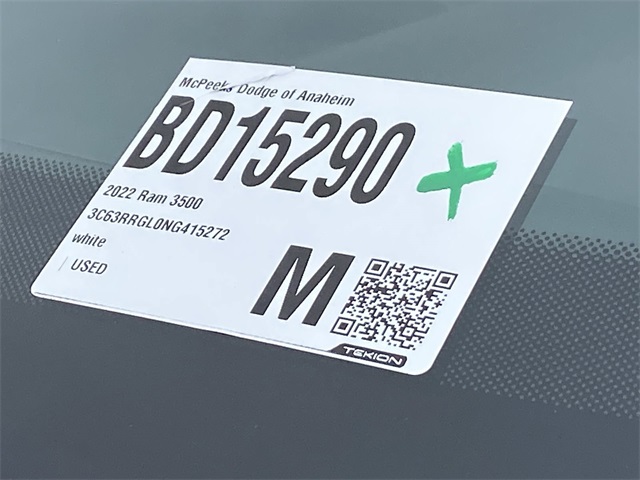 Certified. Clean CARFAX. CARFAX One-Owner. 12" Touchscreen Display, 2 Way Rear Headrest Seat, 220 Amp Alternator, 4 Way Front Headrests, 4-Wheel Disc Brakes, 40/20/40 Split Bench Seat, 4G LTE Wi-Fi Hot Spot, 50 Gallon Fuel Tank, 5th Wheel/Gooseneck Towing Prep Group, 6 Speakers, 6000# Front Axle w/Hub Ext, ABS brakes, Active Noise Control System, Air Conditioning, Air Conditioning ATC w/Dual Zone Control, Alexa Built-In, All R1 High Radios, All Radio Equipped Vehicles, Apple CarPlay, Auto-Dimming Rear-View Mirror, Black Exterior Mirrors, Box & Rear Fender Clearance Lamps, Brake assist, Bright Front Bumper, Bright Rear Bumper, Bright Wheel Skins, Carpet Floor Covering, Center Hub, Chrome Appearance Group, Chrome Grille Surround, Clearance Lamps, Cloth 40/20/40 Bench Seat, Cluster 3.5" TFT Color Display, Cluster 7.0" TFT Color Display, Cold Weather Group, Compass, Connected Travel & Traffic Services, Connectivity - US/Canada, Convenience Group, Dash Pass Thru Wire Circuits, Delay-off headlights, Disassociated Touchscreen Display, Driver door bin, Dual front impact airbags, Dual front side impact airbags, Dual Rear Wheels, Electric Shift-On-The-Fly Transfer Case, Electronic Stability Control, Electronically Controlled Throttle, Emergency communication system: SiriusXM Guardian, Engine Block Heater, For Details Visit DriveUconnect.com, For More Info, Call 800-643-2112, Front anti-roll bar, Front Armrest w/Cupholders, Front Center Armrest w/Storage, Front reading lights, Fully automatic headlights, Global Telematics Box Module (TBM), Google Android Auto, GPS Antenna Input, GPS Navigation, HD Radio, HD Vinyl 40/20/40 Split Bench Seat, Heated door mirrors, I/P Mounted Auxiliary Switches, Illuminated entry, Integrated Voice Command w/Bluetooth, Low tire pressure warning, Manual Adjust 4-Way Driver Seat, Manual Adjust 4-Way Front Passenger Seat, Matte Black Mesh w/Chrome Grille, MOPAR Winter Front Grille Cover, Occupant sensing airbag, Off-Road Information Pages, Outside temperature display, Overhead airbag, Overhead console, ParkView Rear Back-Up Camera, Passenger door bin, Passenger vanity mirror, Power door mirrors, Power steering, Power windows, Quick Order Package 2HA Tradesman, Radio data system, Radio: Uconnect 3 w/5" Display, Radio: Uconnect 5 Nav w/12.0" Display, Rear Folding Seat, Rear Power Sliding Window, Rear step bumper, Rear Wheelhouse Liners, Rear Window Defroster, Selectable Tire Fill Alert, SiriusXM Radio Service, SiriusXM w/360L, Speed control, Storage Tray, Tachometer, Tilt steering wheel, Tinted Acoustic Windshield Glass, Tip Start, Traction control, Tradesman Level 2 Equipment Group, Trailer Brake Control, Trailer Light Check, Turn signal indicator mirrors, Variably intermittent wipers, Voltmeter, Wheels: 17" x 6.0" Steel Argent, Wheels: 18" x 8.0" Steel.Bright White Clearcoat 2022 Ram 3500 Tradesman 4WD 6-Speed AutomaticFCA US LLC Certified Pre-Owned Details: * Vehicles Up to 75,000 Miles and/or 5 Model Years. 24-Hour Towing & Roadside Assistance, Car Rental Allowance, CARFAX® Vehicle History ReportTM and an Introductory 3-month Subscription to SiriusXM® Satellite Radio & Certified Warranty Upgrades * Limited Warranty: 3 Month/3,000 Mile (whichever comes first) after new car warranty expires or from certified purchase date * Vehicle History * Warranty Deductible: $100 * Transferable Warranty * Powertrain Limited Warranty: 84 Month/100,000 Mile (whichever comes first) from original in-service date * 125 Point Inspection * Roadside AssistanceReceive Free lube and oil filter changes for up to 45,000 miles for 3 years!!! McPeek's Dodge of Anahiem 1221 S. Auto Center Drive Anahiem, CA 92806 714-262-4902.