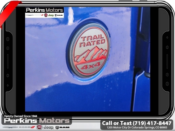 Ocean Blue Metallic Clearcoat 4WD 3.6L V6 24V VVT 8-Speed Automatic<br><br>1-Year SiriusXM Guardian Trial, 240 Amp Alternator, 4G LTE Wi-Fi Hot Spot, 5-Year SiriusXM Traffic Service, 5-Year SiriusXM Travel Link Service, 7 & 4 Pin Wiring Harness, 700 Amp Maintenance Free Battery, 8.4 Radio & Premium Audio Group, 8.4 Touchscreen Display, Auto-Dimming Rear-View Mirror, Automatic temperature control, Auxiliary Switches, Class II Receiver Hitch, Cold Weather Group, Daytime Running Lamps LED Accents, Emergency/Assistance Call, For Details, Visit DriveUconnect.ca, Front LED Fog Lamps, GPS Navigation, HD Radio, Heated Front Seats, Heated Steering Wheel, LED Lighting Group, LED Reflector Headlamps, LED Taillamps, Quick Order Package 24R, Radio: Uconnect 4C Nav w/8.4 Display, SiriusXM Traffic Plus, SiriusXM Travel Link, Trailer Tow & HD Electrical Group.<br><br><br>CARFAX One-Owner. Clean CARFAX.<br><br>Check us out at www.perkinsmotors.com to see our specials! Since opening our doors in 1944, we’ve been proud to serve Colorado Springs, CO, and the surrounding areas of Pueblo, Castle Rock and Denver, CO. Throughout this time of being family owned for 80 years, we’ve maintained a firm commitment to our customers: to offer a wide selection of New Chrysler, Dodge, Fiat, Jeep, and Ram vehicles and quality pre-owned vehicles, and provide a quick, no-hassle car-buying process that ensures everyone drives off the lot satisfied with their purchase.<br><br><br>Awards:<br> * Motor Trend Automobiles of the year<br><br>8.4 Radio & Premium Audio Group (1-Year SiriusXM Guardian Trial, 4G LTE Wi-Fi Hot Spot, 5-Year SiriusXM Traffic Service, 5-Year SiriusXM Travel Link Service, 8.4 Touchscreen Display, Auto-Dimming Rear-View Mirror, Emergency/Assistance Call, For Details, Visit DriveUconnect.ca, GPS Navigation, HD Radio, Radio: Uconnect 4C Nav w/8.4 Display, SiriusXM Traffic Plus, and SiriusXM Travel Link), Cold Weather Group (Heated Front Seats and Heated Steering Wheel), LED Lighting Group (Daytime Running Lamps LED Accents, Front LED Fog Lamps, LED Reflector Headlamps, and LED Taillamps), Quick Order Package 24R, Trailer Tow & HD Electrical Group (240 Amp Alternator, 7 & 4 Pin Wiring Harness, 700 Amp Maintenance Free Battery, Auxiliary Switches, and Class II Receiver Hitch), Automatic temperature control, 4-Wheel Disc Brakes, 4.10 Rear Axle Ratio, 8 Speakers, ABS brakes, Air Conditioning, Alloy wheels, Alpine Premium Audio System, AM/FM radio: SiriusXM, Apple CarPlay/Android Auto, Brake assist, Compass, Cruise Control, Delay-off headlights, Driver door bin, Driver vanity mirror, Dual front impact airbags, Dual front side impact airbags, Electronic Stability Control, Front anti-roll bar, Front Bucket Seats, Front Center Armrest w/Storage, Front dual zone A/C, Front fog lights, Front reading lights, Fully automatic headlights, Garage door transmitter, Heated door mirrors, Illuminated entry, Integrated roll-over protection, Leather steering wheel, Low tire pressure warning, Non-Lock Fuel Cap w/o Discriminator, Occupant sensing airbag, Outside temperature display, Panic alarm, ParkView Rear Back-Up Camera, Passenger door bin, Passenger vanity mirror, Performance Suspension, Power door mirrors, Power steering, Power windows, Premium Cloth Low-Back Bucket Seats, Radio data system, Radio: Uconnect 4 w/7 Display, Rear anti-roll bar, Rear reading lights, Remote keyless entry, Remote Start System, Security system, Split folding rear seat, Steering wheel mounted audio controls, Tachometer, Telescoping steering wheel, Tilt steering wheel, Traction control, Trip computer, Variably intermittent wipers, Voltmeter, Wheels: 17 x 7.5 Machined w/Black Pockets, and Wheels: 17 x 7.5 Polished w/Black Pockets (DISC)