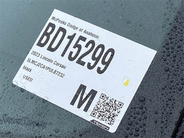 22/30 City/Highway MPG Odometer is 662 miles below market average! Clean CARFAX. CARFAX One-Owner. INTERIOR & EXTERIOR PROFESSIONALLY DETAILED FOR DELIVERY, MCPEEK CHRYSLER DODGE JEEP RAM FAMILY OWNED AND OPERATED SINCE 1961 !!!!!, 10 Speakers, 19" Bright Machined Aluminum Wheels, 3.81 Axle Ratio, 4-Wheel Disc Brakes, ABS brakes, Air Conditioning, Alloy wheels, AM/FM radio: SiriusXM, Auto High-beam Headlights, Auto-dimming Rear-View mirror, Automatic temperature control, Brake assist, Bumpers: body-color, Compass, Delay-off headlights, Driver door bin, Driver vanity mirror, Dual front impact airbags, Dual front side impact airbags, Electronic Stability Control, Emergency communication system: SYNC 4 911 Assist, Equipment Group 200A, Four wheel independent suspension, Front anti-roll bar, Front Bucket Seats, Front Center Armrest, Front dual zone A/C, Front reading lights, Fully automatic headlights, Heated door mirrors, Heated front seats, Illuminated entry, Knee airbag, Leather steering wheel, Lincoln Premium Audio System Subwoofer Delete, Low tire pressure warning, Memory seat, Navigation system: Connected Navigation (3-year trial), Occupant sensing airbag, Outside temperature display, Overhead airbag, Overhead console, Panic alarm, Passenger door bin, Passenger vanity mirror, Power door mirrors, Power driver seat, Power Liftgate, Power passenger seat, Power steering, Power windows, Premium Leather Heated Comfort Seats, Radio data system, Radio: Lincoln Premium Audio System w/MP3, Rear anti-roll bar, Rear Parking Sensors, Rear reading lights, Rear seat center armrest, Rear window defroster, Rear window wiper, Remote keyless entry, Roof rack: rails only, Security system, SiriusXM Radio, Speed control, Speed-sensing steering, Speed-Sensitive Wipers, Split folding rear seat, Spoiler, Steering wheel mounted A/C controls, Steering wheel mounted audio controls, SYNC 4 Communications & Entertainment System, Tachometer, Telescoping steering wheel, Tilt steering wheel, Traction control, Trip computer, Variably intermittent wipers.Black Metallic 2023 Lincoln Corsair Reserve FWD 8-Speed AutomaticReceive Free lube and oil filter changes for up to 45,000 miles for 3 years!!! McPeek's Dodge of Anahiem 1221 S. Auto Center Drive Anahiem, CA 92806 714-262-4902.
