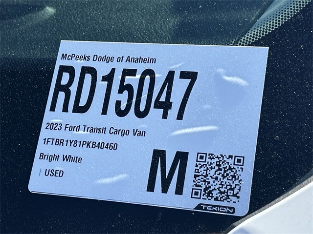 Clean CARFAX. INTERIOR & EXTERIOR PROFESSIONALLY DETAILED FOR DELIVERY, MCPEEK CHRYSLER DODGE JEEP RAM FAMILY OWNED AND OPERATED SINCE 1961 !!!!!, 2 Additional Keys (4 Total), 3.73 Axle Ratio, 4 Speakers, 4-Wheel Disc Brakes, 6 Cargo Tie-Down Hooks, ABS brakes, Air Conditioning, AM/FM radio, AM/FM Stereo, Auto High-beam Headlights, Auto Start-Stop Delete, Brake assist, Chrome High-Intensity Discharge (HID) Headlamps, Cruise Control w/Adjustable Spd Limiting Device (ASLD), Dark Palazzo Gray Vinyl Bucket Seats, Delay-off headlights, Driver door bin, Driver's Seat Mounted Armrest, Dual front impact airbags, Dual front side impact airbags, Ebony Cloth Bucket Seats w/Armrests, Electronic Stability Control, Exterior Parking Camera Rear, Exterior Upgrade Package, Fixed Rr Cargo Door & 2nd Row Passenger-Side Glass, Front anti-roll bar, Front Bucket Seats, Front Fog Lamps, Front License Plate Bracket, Front reading lights, Front wheel independent suspension, Fully automatic headlights, Honeycomb Mesh Grille w/Chrome Surround, Illuminated entry, Low tire pressure warning, Occupant sensing airbag, Order Code 101A, Overhead airbag, Panic alarm, Passenger cancellable airbag, Passenger door bin, Passenger-Side B-Pillar Assist Handle, Power door mirrors, Power steering, Power windows, Radio: AM/FM Stereo w/SYNC 3, Rear-Window Defroster, Rearview Mirror, Remote keyless entry, Short-Arm Manual-Folding Power Adjust Mirrors, Steering wheel mounted audio controls, Tachometer, Telescoping steering wheel, Tilt steering wheel, Traction control, Variably intermittent wipers, Vinyl Front Bucket Seats, Wheels: 16" Silver Steel w/Black Hubcap, Wheels: 16" Steel w/Full Silver Cover, Wi-Fi 4G LTE Hotspot Delete, Wiper Activated Headlamps.Oxford White 2023 Ford Transit-250 Base RWD 10-Speed Automatic with OverdriveReceive Free lube and oil filter changes for up to 45,000 miles for 3 years!!! McPeek's Dodge of Anahiem 1221 S. Auto Center Drive Anahiem, CA 92806 714-262-4902.