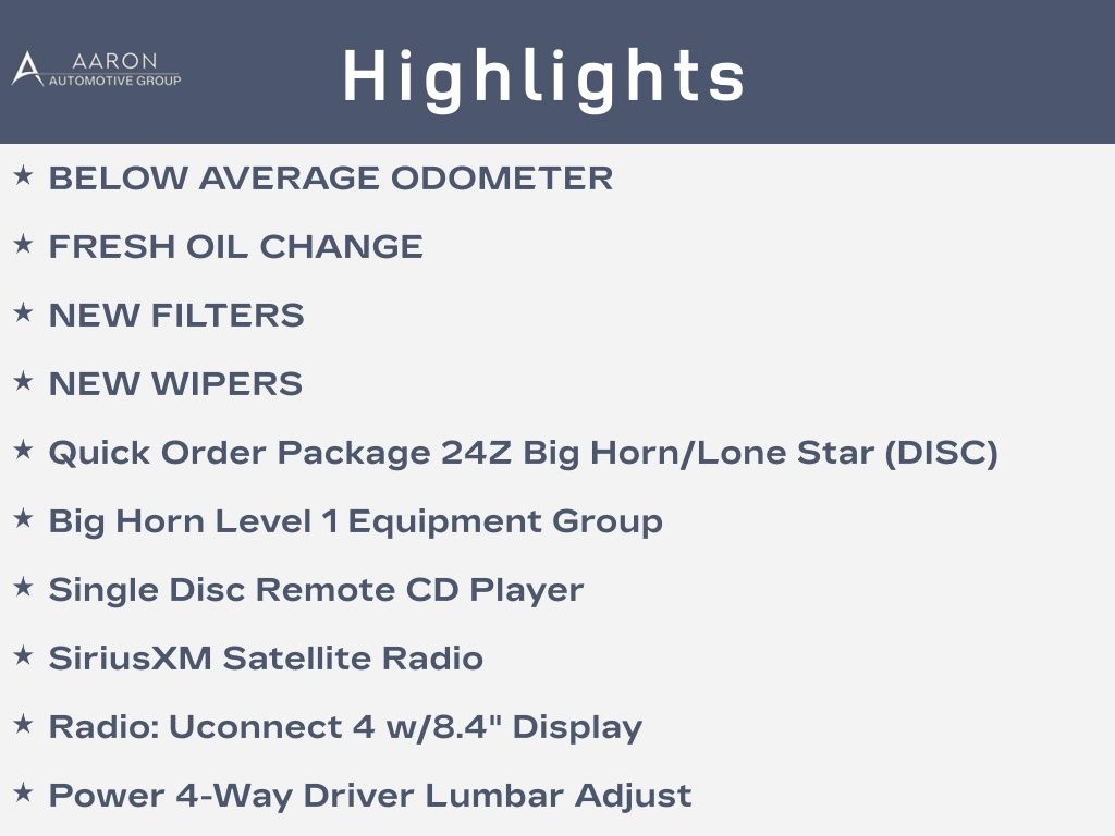 Priced below KBB Fair Purchase Price!BELOW AVERAGE ODOMETER, FRESH OIL CHANGE, NEW FILTERS, NEW WIPERS, 1500 Big Horn/Lone Star, 4D Crew Cab, HEMI 5.7L V8 Multi Displacement VVT, RWD, Alloy wheels, Auto-Dimming Rear-View Mirror, Big Horn IP Badge, Big Horn Level 1 Equipment Group, Class IV Receiver Hitch, Cluster 3.5" TFT Color Display, Exterior Mirrors w/Supplemental Signals, Foam Bottle Insert (Door Trim Panel), Glove Box Lamp, ParkView Rear Back-Up Camera, Power 4-Way Driver Lumbar Adjust, Power 8-Way Driver Seat, Power Adjustable Pedals, Power Heated Fold Away Mirrors, Quick Order Package 24Z Big Horn/Lone Star (DISC), Radio: Uconnect 4 w/8.4" Display, Rear Dome w/On/Off Switch Lamp, Rear Power Sliding Window, Rear Window Defroster, Single Disc Remote CD Player, SiriusXM Satellite Radio, Steering Wheel Mounted Audio Controls, Sun Visors w/Illuminated Vanity Mirrors, Universal Garage Door Opener.CARFAX One-Owner.Awards: * Motor Trend Automobiles of the year * 2019 KBB.com 10 Best Road Trip Cars * 2019 KBB.com 10 Favorite New-for-2019 Cars * NACTOY 2019 North American Truck of the Year * 2019 KBB.com Best Auto Tech Awards