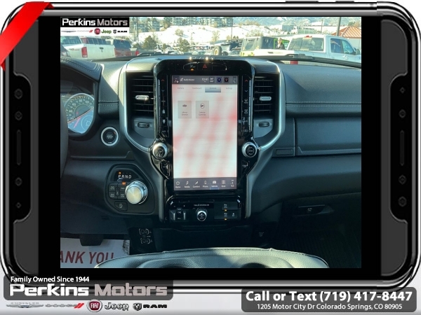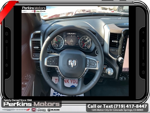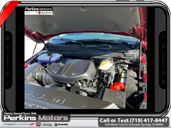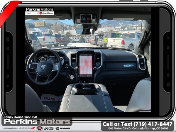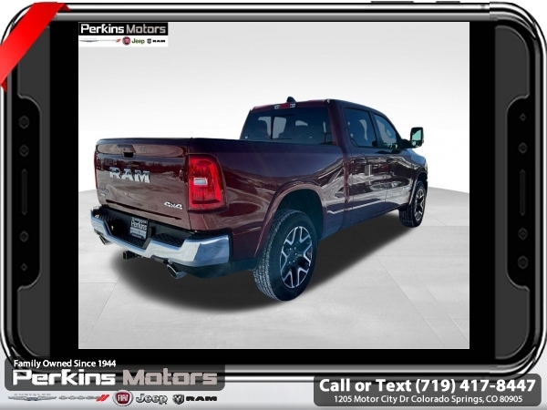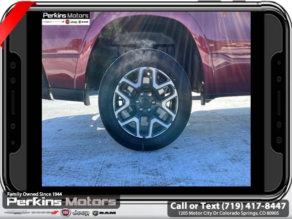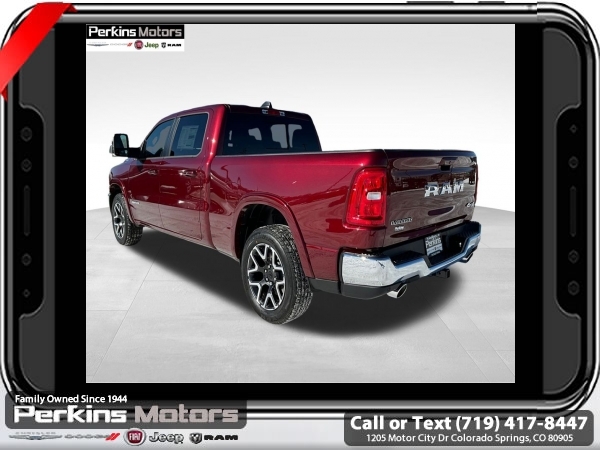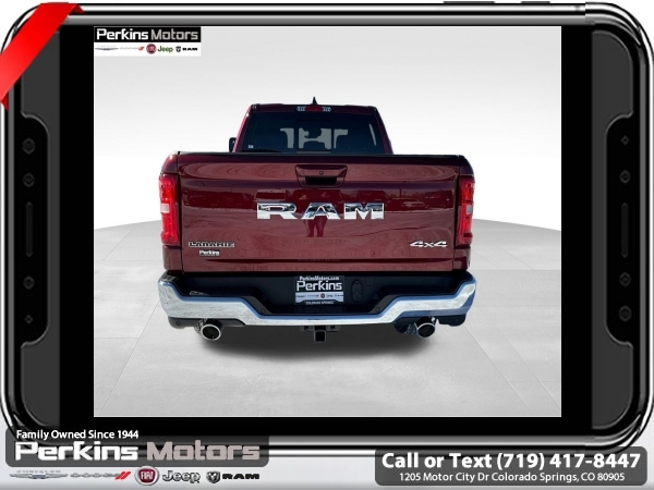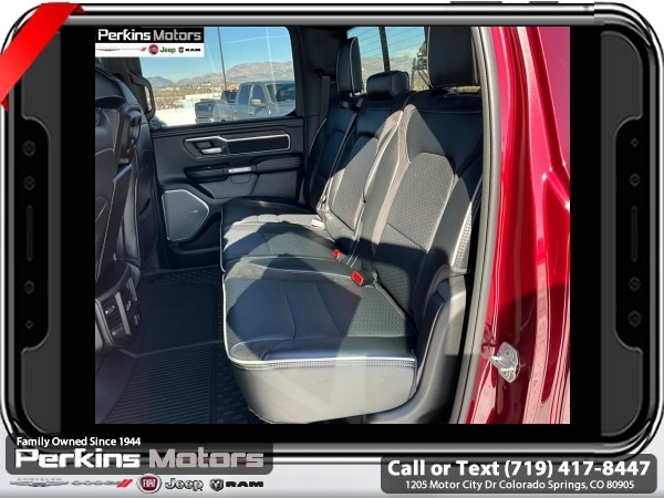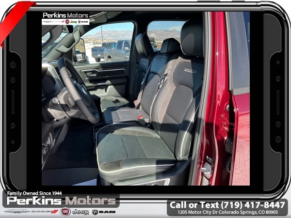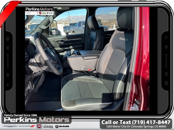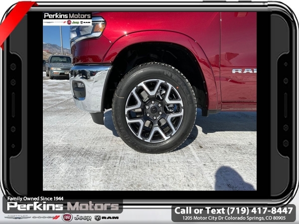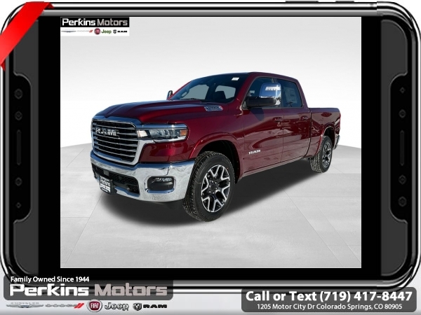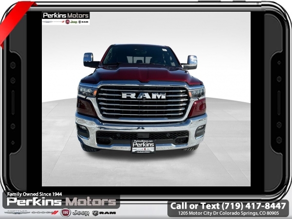 Factory MSRP: $69,560 $15,488 off MSRP! Priced below KBB Fair Purchase Price! Delmonico Red Pearlcoat 2025 Ram 1500 Laramie 4WD 8-Speed Automatic 3.0L I6<br><br>Check us out at www.perkinsmotors.com to see our specials! Since opening our doors in 1944, we’ve been proud to serve Colorado Springs, CO, and the surrounding areas of Pueblo, Castle Rock and Denver, CO. Throughout this time of being family owned for 80 years, we’ve maintained a firm commitment to our customers: to offer a wide selection of New Chrysler, Dodge, Fiat, Jeep, and Ram vehicles and quality pre-owned vehicles, and provide a quick, no-hassle car-buying process that ensures everyone drives off the lot satisfied with their purchase.<br><br>Laramie Level 1 Equipment Group (Rain Sensitive Windshield Wipers and Remote Tailgate Release), Quick Order Package 21H Laramie, Trailer Tow Group (Auto Power-Folding Mirrors, Auto-Dimming Exterior Driver Mirror, Auto-Dimming Exterior Passenger Mirror, Black Exterior Mirrors, Chrome Exterior Mirrors, Exterior Mirrors Courtesy Lamps, Exterior Mirrors w/Heating Element, Exterior Mirrors w/Memory, Exterior Mirrors w/Supplemental Signals, Forward & Reverse Utility Lights, Mirror Clearance/Running Lights, Power Telescoping Mirrors, Power-Adjustable Convex Aux Mirrors, Trailer Brake Control, Trailer Light Check, Trailer Reverse Steering Control, Trailer Tire Pressure Monitoring System, and Trailer Tow Mirrors), 10 Speakers, 3 Rear Seat Head Restraints, 3.55 Rear Axle Ratio, 3.92 Rear Axle Ratio, 4 Way Front Headrests, 4-Wheel Disc Brakes, 4G LTE Wi-Fi Hot Spot, ABS brakes, Air Conditioning, Alloy wheels, AM/FM radio: SiriusXM with 360L, Anti-Spin Differential Rear Axle, Apple CarPlay, Apple CarPlay/Android Auto, Audio memory, Auto High-beam Headlights, Auto-dimming door mirrors, Auto-dimming Rear-View mirror, Automatic temperature control, Brake assist, Bumpers: chrome, Compass, Connected Travel & Traffic Services, Connectivity - US/Canada, Convex Wide-Angle Exterior Mirror Insert, Cruise Control, Delay-off headlights, Driver door bin, Driver Seat Memory, Driver vanity mirror, Dual front impact airbags, Dual front side impact airbags, Electronic Stability Control, Front anti-roll bar, Front Center Armrest w/Storage, Front dual zone A/C, Front fog lights, Front License Plate Bracket, Front reading lights, Front Seat Back Map Pockets, Front wheel independent suspension, Fully automatic headlights, Garage door transmitter, Google Android Auto, GPS Antenna Input, GPS Navigation, HD Radio, Heated door mirrors, Heated Front Seats, Heated front seats, Heated rear seats, Heated Steering Wheel, Heated steering wheel, Illuminated entry, Integrated Voice Command w/Bluetooth, Leather steering wheel, Leather Trim 40/20/40 Bench Seat, Low tire pressure warning, Manufacturer's Statement of Origin, Memory seat, MOPAR Front & Rear Rubber Floor Mats, Navigation System, Occupant sensing airbag, Outside temperature display, Overhead airbag, Overhead console, Panic alarm, ParkView Rear Back-Up Camera, Passenger door bin, Passenger vanity mirror, Power 2-Way Driver Lumbar Adjust, Power 2-Way Passenger Lumbar Adjust, Power Adjust 8-Way Front Passenger Seat, Power door mirrors, Power driver seat, Power passenger seat, Power steering, Power windows, Radio data system, Radio: Uconnect 5 Nav w/12.0 Display, RAM Grille Badge - Chrome, Rear anti-roll bar, Rear reading lights, Rear seat center armrest, Rear step bumper, Remote keyless entry, Security system, SiriusXM w/360L, Split folding rear seat, Steering wheel mounted audio controls, Tachometer, Telescoping steering wheel, Tilt steering wheel, Traction control, Trip computer, Turn signal indicator mirrors, USB Host Flip, Variably intermitten Sale price includes all manufacture's incentives and dealer discounts. Sale price not available on lease or compatible with special APR. $3000 - 2025 National Retail Consumer Cash. Exp. 06/30/2025 $7092 - 2025 National Minimum Employee Pricing Discount. Exp. 0
