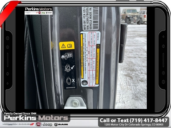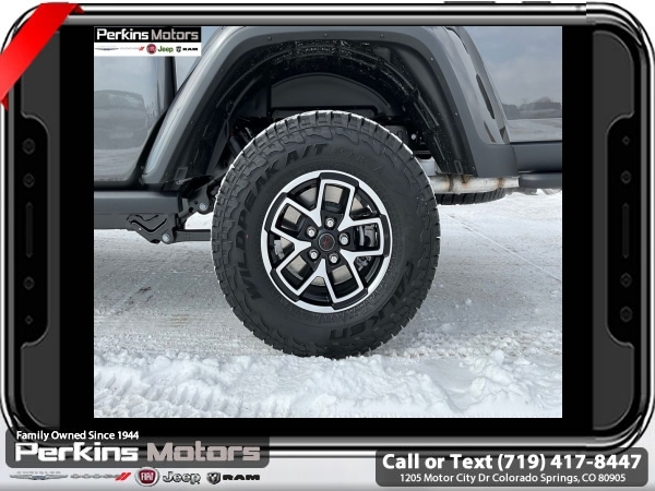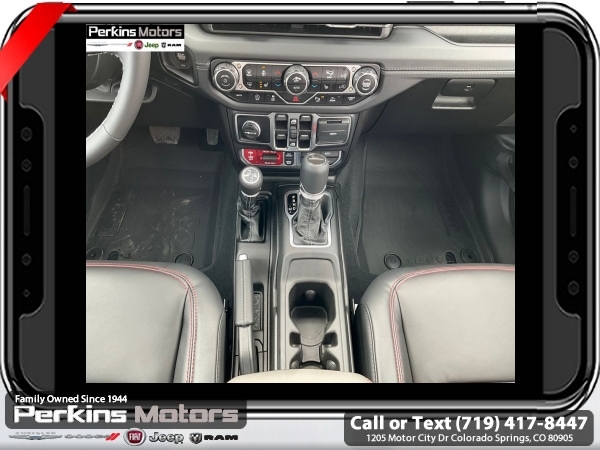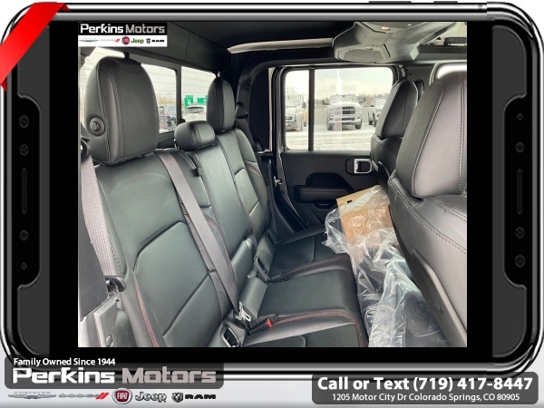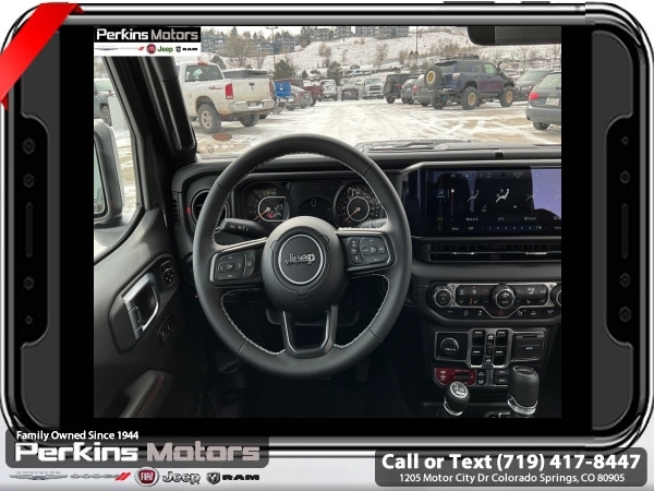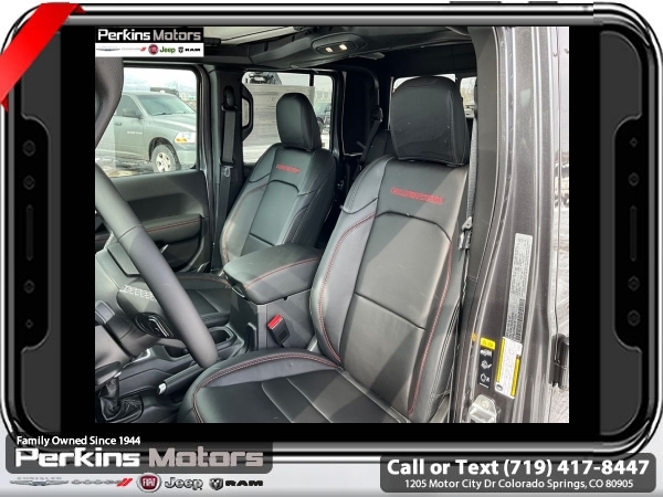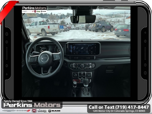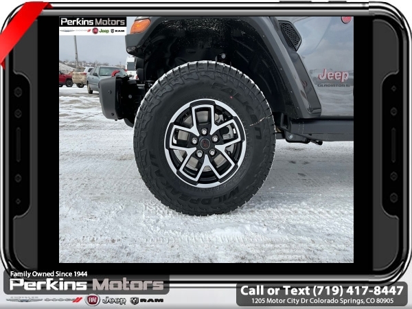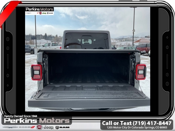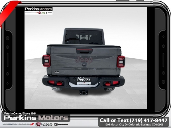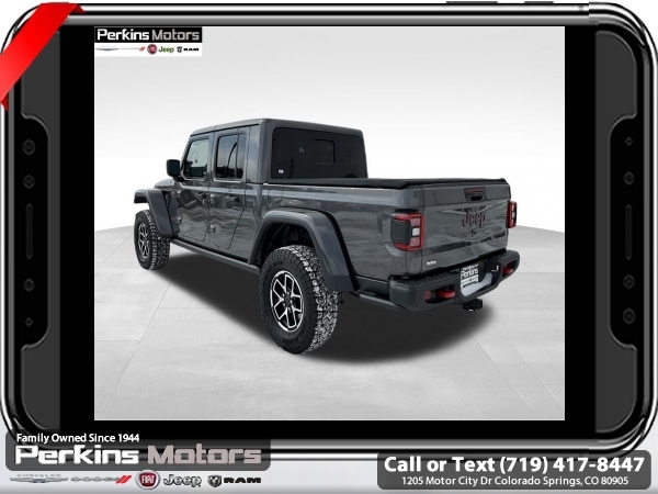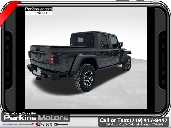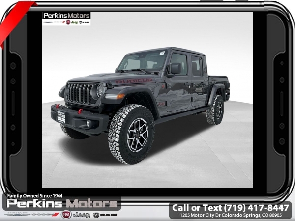 Factory MSRP: $66,995 $8,000 off MSRP! Priced below KBB Fair Purchase Price! Granite Crystal Metallic Clearcoat 2025 Jeep Gladiator Rubicon 4WD 8-Speed Automatic 3.6L V6 24V VVT<br><br>Check us out at www.perkinsmotors.com to see our specials! Since opening our doors in 1944, we’ve been proud to serve Colorado Springs, CO, and the surrounding areas of Pueblo, Castle Rock and Denver, CO. Throughout this time of being family owned for 80 years, we’ve maintained a firm commitment to our customers: to offer a wide selection of New Chrysler, Dodge, Fiat, Jeep, and Ram vehicles and quality pre-owned vehicles, and provide a quick, no-hassle car-buying process that ensures everyone drives off the lot satisfied with their purchase.<br><br>Cargo Group w/Trail Rail System (Exterior 115V AC Outlet, Lockable Rear Underseat Storage, Roll-Up Tonneau Cover, and Trail Rails), Quick Order Package 24Y Rubicon X (4G LTE Wi-Fi Hot Spot, Alexa Built-In, Alpine Premium Audio System, Apple CarPlay, Auto High Beam Headlamp Control, Auto-Dimming Rear-View Mirror, Blind Spot & Cross Path Detection, Bluetooth Wireless Speaker, Body Color 3-Piece Hard Top, Body Color Rubicon Highline Flare, Connected Travel & Traffic Services, Connectivity - US/Canada, Freedom Panel Storage Bag, Full Length Floor Console Premium Armrest, Google Android Auto, GPS Navigation, Heated Front Seats, Heated Steering Wheel, Integrated Off-Road Camera, Integrated Voice Command w/Bluetooth, Leather Wrapped Park Brake Handle, Leather Wrapped Shift Knob, MOPAR Hardtop Headliner, ParkSense Rear Park Assist System, Power 4-Way Driver Lumbar Adjust, Power 4-Way Passenger Lumbar Adjust, Power Adjust 8-Way Driver Seat, Power Adjust 8-Way Front Passenger Seat, Power Adjust Nappa Leather Seats, Premium Door Trim Panel, Radio: Uconnect 5 Nav w/12.3 Display, Rear Armrest w/Cupholder Seat, Rear Sliding Window, Rear Window Defroster, SiriusXM Radio Service, SiriusXM w/360L, Steel Front Bumper, Universal Garage Door Opener, and USB Host Flip), 12.3 Touchscreen Display, 4-Wheel Disc Brakes, 4.10 Rear Axle Ratio, 8 Speakers, 97 MPH Vehicle Max Speed Calibration, ABS brakes, Air Conditioning, Alloy wheels, AM/FM radio: SiriusXM, Apple CarPlay/Android Auto, Automatic temperature control, Brake assist, Cloth Low-Back Bucket Seats, Compass, Cruise Control, Delay-off headlights, Driver door bin, Driver vanity mirror, Dual front impact airbags, Dual front side impact airbags, Electronic Stability Control, Emergency communication system: Jeep Connect, Front anti-roll bar, Front Bucket Seats, Front Center Armrest w/Storage, Front dual zone A/C, Front fog lights, Front License Plate Bracket, Front reading lights, Fully automatic headlights, Heated door mirrors, Illuminated entry, Integrated roll-over protection, Jeep Trail Rated Kit, Low tire pressure warning, MOPAR All-Weather Slush Mats, MOPAR Doors Off Mirror Kit, MOPAR Plastic Door Sill Guards, MOPAR Spray In Bedliner, Occupant sensing airbag, Outside temperature display, Overhead airbag, Panic alarm, Passenger door bin, Passenger vanity mirror, Performance Suspension, Power door mirrors, Power steering, Power windows, Radio data system, Radio: Uconnect 5 w/12.3 Display, Rear anti-roll bar, Rear reading lights, Remote keyless entry, Security system, Split folding rear seat, Steering wheel mounted audio controls, Tachometer, Telescoping steering wheel, Tilt steering wheel, Traction control, Trip computer, Variably intermittent wipers, Voltmeter, and Wheels: 17 x 7.5 Machined/Painted Black. Sale price includes all manufacture's incentives and dealer discounts. Sale price not available on lease or compatible with special APR. $4000 - 2025 National Jeep Celebration Event Bonus Cash . Exp. 03/31/2025