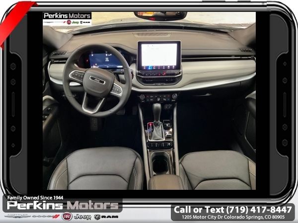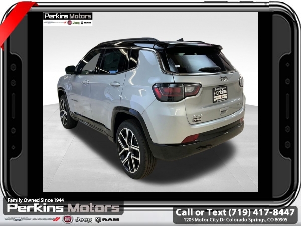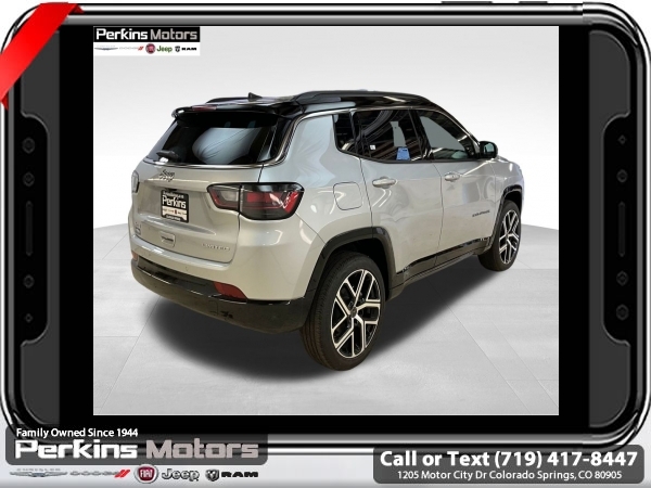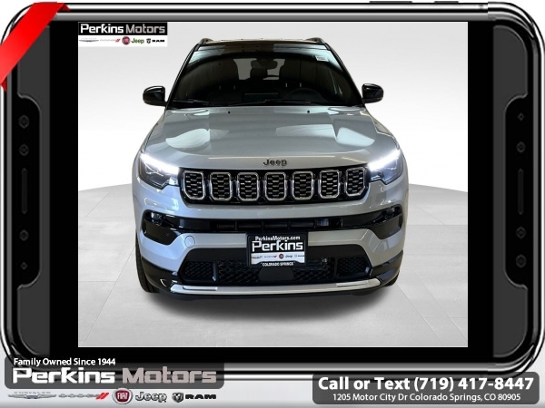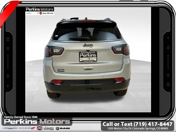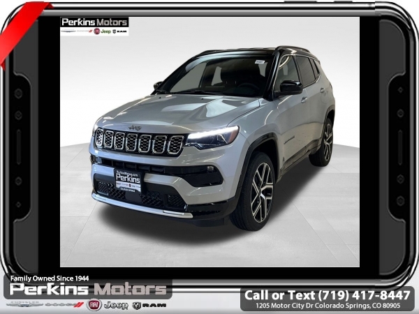 Factory MSRP: $38,110 $4,794 off MSRP! Silver Zynith Metallic Clearcoat 2025 Jeep Compass Limited 4WD 8-Speed Automatic 2.0L I4 DOHC<br>4WD.<br>Check us out at www.perkinsmotors.com to see our specials! Since opening our doors in 1944, we’ve been proud to serve Colorado Springs, CO, and the surrounding areas of Pueblo, Castle Rock and Denver, CO. Throughout this time of being family owned for 80 years, we’ve maintained a firm commitment to our customers: to offer a wide selection of New Chrysler, Dodge, Fiat, Jeep, and Ram vehicles and quality pre-owned vehicles, and provide a quick, no-hassle car-buying process that ensures everyone drives off the lot satisfied with their purchase.<br><br>Elite Group (10.1 Touchscreen Display, 2nd Row USB Type A/C Charge Only, Alexa Built-In, Cluster 10.25 TFT Color Display, Connected Travel & Traffic Services, Diamond Black Door Cladding, Diamond Black Exterior Sill, Diamond Black Fascias, Diamond Black Wheel Flares, Driver Seat Memory, Foot Activated Open 'N Go Liftgate, GPS Navigation, HD Radio, Integrated Voice Command w/Bluetooth, LED Low/Highbeam Projector Headlamps, Power 2-Way Passenger Lumbar Adjust, Power 8-Way Adjust Front Passenger Seat, Power Liftgate, Premium Leather Trimmed Bucket Seats, Premium LED Fog Lamps, Premium Taillamps, Reversible Carpet/Vinyl Cargo Mat, SiriusXM w/360L, Ventilated Front Seats, and Wheels: 19 x 7.5 Painted Diamond Cut Aluminum), Quick Order Package 29G, 4WD, 3.73 Final Drive Ratio, 4-Wheel Disc Brakes, 6 Speakers, ABS brakes, Air Conditioning, Alloy wheels, AM/FM radio: SiriusXM, Auto High-beam Headlights, Auto-dimming Rear-View mirror, Automatic temperature control, Brake assist, Bumpers: body-color, Compass, Cruise Control, Delay-off headlights, Driver door bin, Driver vanity mirror, Dual front impact airbags, Dual front side impact airbags, Electronic Stability Control, Emergency communication system: Jeep Connect, Four wheel independent suspension, Front anti-roll bar, Front Bucket Seats, Front Center Armrest w/Storage, Front dual zone A/C, Front fog lights, Front License Plate Bracket, Front reading lights, Fully automatic headlights, Heated door mirrors, Heated front seats, Illuminated entry, Knee airbag, Leather Shift Knob, Leather steering wheel, Leatherette Seats, Low tire pressure warning, Occupant sensing airbag, Outside temperature display, Overhead airbag, Overhead console, Panic alarm, ParkView Rear Back-Up Camera, Passenger door bin, Passenger vanity mirror, Power door mirrors, Power driver seat, Power steering, Power windows, Radio: Uconnect 5 w/10.1 Display, Rain sensing wipers, Rear anti-roll bar, Rear seat center armrest, Rear window defroster, Rear window wiper, Remote keyless entry, Security system, Split folding rear seat, Spoiler, Steering wheel mounted audio controls, Tachometer, Telescoping steering wheel, Tilt steering wheel, Traction control, Trip computer, Turn signal indicator mirrors, Variably intermittent wipers, and Wheels: 18 x 7 Painted Diamond Cut Alum (DISC)<br><br>24/32 City/Highway MPG