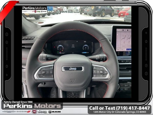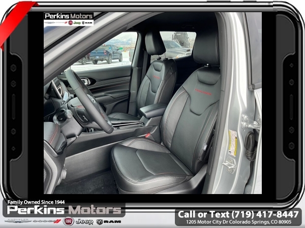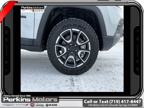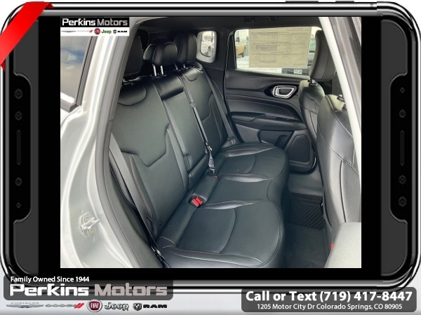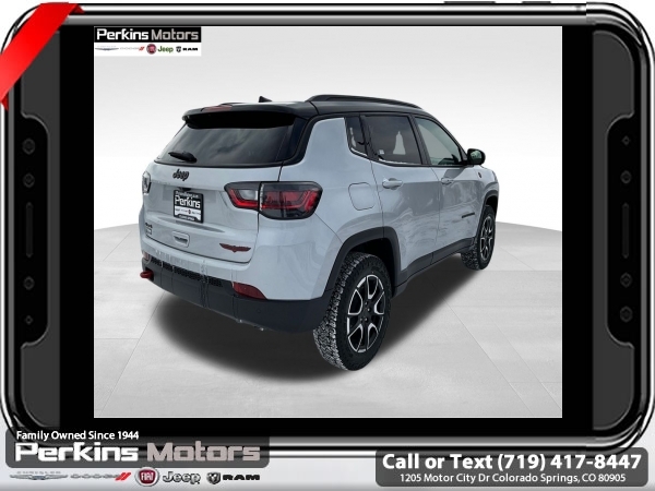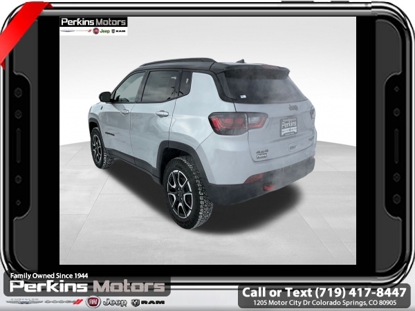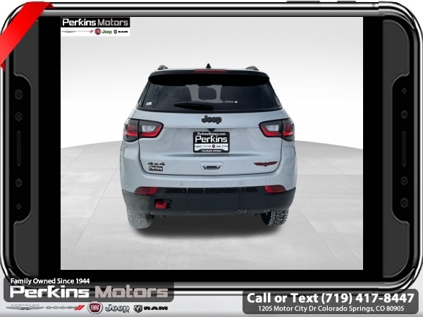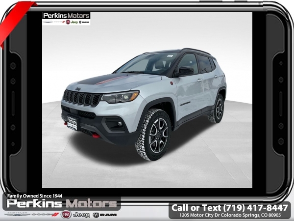 Factory MSRP: $38,560 $4,809 off MSRP! Silver Zynith Metallic Clearcoat 2025 Jeep Compass Trailhawk 4WD 8-Speed Automatic 2.0L I4 DOHC<br>4WD.<br>Check us out at www.perkinsmotors.com to see our specials! Since opening our doors in 1944, we’ve been proud to serve Colorado Springs, CO, and the surrounding areas of Pueblo, Castle Rock and Denver, CO. Throughout this time of being family owned for 80 years, we’ve maintained a firm commitment to our customers: to offer a wide selection of New Chrysler, Dodge, Fiat, Jeep, and Ram vehicles and quality pre-owned vehicles, and provide a quick, no-hassle car-buying process that ensures everyone drives off the lot satisfied with their purchase.<br><br>Quick Order Package 29E, Trailhawk Elite Group (10.1 Touchscreen Display, 2nd Row USB Type A/C Charge Only, Alexa Built-In, Cluster 10.25 TFT Color Display, Connected Travel & Traffic Services, Driver Seat Memory, Foot Activated Open 'N Go Liftgate, GPS Navigation, HD Radio, Heated Front Seats, Heated Steering Wheel, Integrated Voice Command w/Bluetooth, LED Low/Highbeam Projector Headlamps, Power 2-Way Driver Lumbar Adjust, Power 2-Way Passenger Lumbar Adjust, Power 8-Way Adjust Front Passenger Seat, Power Adjust 8-Way Driver Seat, Power Liftgate, Premium Leather Trimmed Bucket Seats, Premium LED Fog Lamps, Premium Taillamps, Remote Start System, Reversible Carpet/Vinyl Cargo Mat, SiriusXM w/360L, Ventilated Front Seats, and Windshield Wiper De-Icer), 4WD, 4-Wheel Disc Brakes, 4.398 Final Drive Ratio, 6 Speakers, ABS brakes, Air Conditioning, Alloy wheels, AM/FM radio: SiriusXM, Auto High-beam Headlights, Auto-dimming Rear-View mirror, Automatic temperature control, Brake assist, Bumpers: body-color, Compass, Cruise Control, Delay-off headlights, Driver door bin, Driver vanity mirror, Dual front impact airbags, Dual front side impact airbags, Electronic Stability Control, Emergency communication system: Jeep Connect, Four wheel independent suspension, Front anti-roll bar, Front Bucket Seats, Front Center Armrest w/Storage, Front dual zone A/C, Front fog lights, Front License Plate Bracket, Front reading lights, Fully automatic headlights, Heated door mirrors, Illuminated entry, Knee airbag, Leather Shift Knob, Leather steering wheel, Low tire pressure warning, Occupant sensing airbag, Outside temperature display, Overhead airbag, Overhead console, Panic alarm, ParkView Rear Back-Up Camera, Passenger door bin, Passenger vanity mirror, Power door mirrors, Power steering, Power windows, Premium Cloth/Leather Trim Bucket Seats, Radio: Uconnect 5 w/10.1 Display, Rain sensing wipers, Rear anti-roll bar, Rear seat center armrest, Rear window defroster, Rear window wiper, Remote keyless entry, Security system, Split folding rear seat, Spoiler, Steering wheel mounted audio controls, Tachometer, Telescoping steering wheel, Tilt steering wheel, Traction control, Trip computer, Turn signal indicator mirrors, Variably intermittent wipers, and Wheels: 17 x 6.5 Painted Black Aluminum.<br><br>24/32 City/Highway MPG