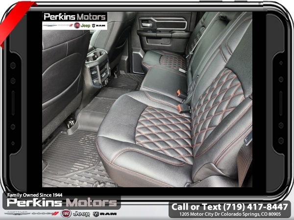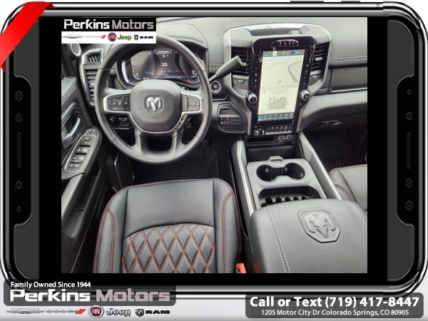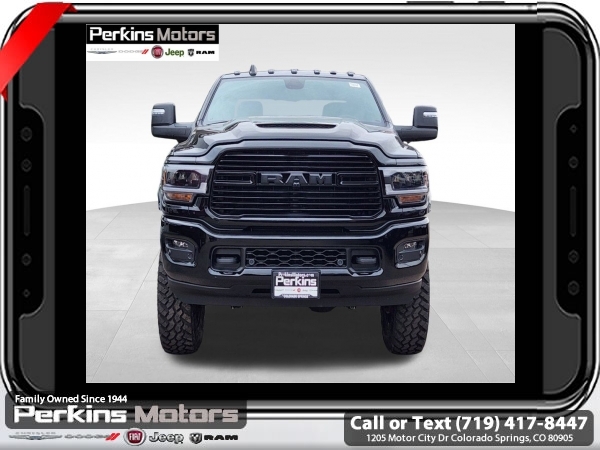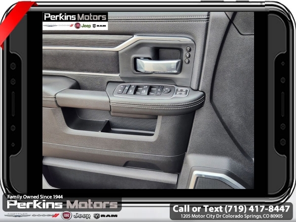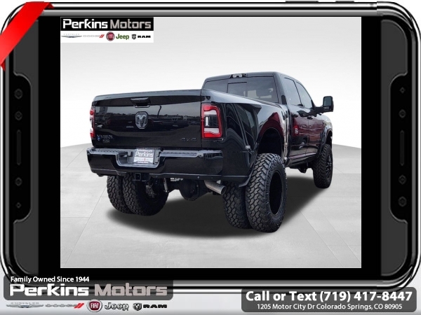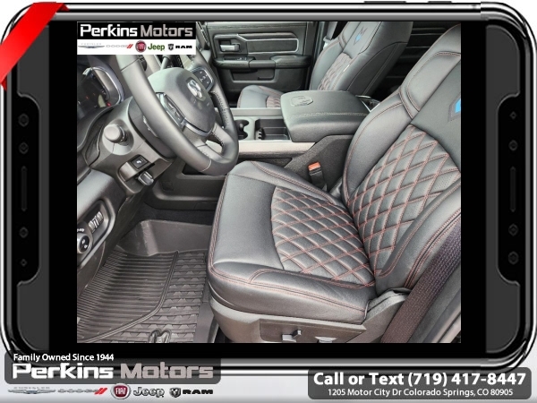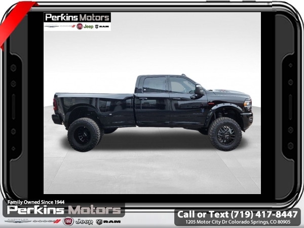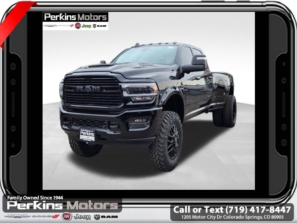 Factory MSRP: $95,185 Diamond Black Crystal Pearlcoat 2024 Ram 3500 Laramie 4WD Aisin 6-Speed Automatic 6.7L I6<br><br>Check us out at www.perkinsmotors.com to see our specials! Since opening our doors in 1944, we’ve been proud to serve Colorado Springs, CO, and the surrounding areas of Pueblo, Castle Rock and Denver, CO. Throughout this time of being family owned for 80 years, we’ve maintained a firm commitment to our customers: to offer a wide selection of New Chrysler, Dodge, Fiat, Jeep, and Ram vehicles and quality pre-owned vehicles, and provide a quick, no-hassle car-buying process that ensures everyone drives off the lot satisfied with their purchase.<br><br>Bed Utility Group (LED Bed Lighting and MOPAR Spray In Bedliner), Cold Weather Group (Engine Block Heater), Laramie Level B Equipment Group (2nd Row In Floor Storage Bins, 4G LTE Wi-Fi Hot Spot, Alexa Built-In, Apple CarPlay, Auto Adjust In Reverse Exterior Mirrors, Auto-Dimming Exterior Mirrors, Blind Spot & Cross Path Detection, Center Hub, Chrome Exterior Mirrors, Connected Travel & Traffic Services, Connectivity - US/Canada, Disassociated Touchscreen Display, Exterior Mirrors Courtesy Lamps, Exterior Mirrors w/Heating Element, Exterior Mirrors w/Supplemental Signals, Foam Bottle Insert (Door Trim Panel), For Details Visit DriveUconnect.com, For More Info, Call 800-643-2112, Forward & Reverse Utility Lights, Global Telematics Box Module (TBM), Google Android Auto, GPS Antenna Input, GPS Navigation, HD Radio, Integrated Voice Command w/Bluetooth, LED Reflector Headlamps, LED Tail Lamps, Off-Road Information Pages, ParkSense Front/Rear Park Assist System, Power Adjust Mirrors, Power Heat Fold Memory Telescopic Mirrors, Power-Adjustable Convex Aux Mirrors, Radio: Uconnect 5 Nav w/12.0 Display, Rain Sensitive Windshield Wipers, Selectable Tire Fill Alert, SiriusXM Radio Service, SiriusXM w/360L, and Trailer Tow Pages), Night Edition (Black Exterior Truck Badging, Black Headlamp Bezels, Black Interior Accents, and Body Color Grille Surround), Quick Order Package 21H Laramie, Tow-Mode Digital Rearview Mirror Package (Digital Rearview Mirror and Tow-Mode Camera (Wired)), Towing Technology Group (CTR Stop Lamp w/Cargo View Camera and Surround View Camera System), 10 Speakers, 115V Auxiliary Rear Power Outlet, 2 Way Rear Headrest Seat, 220 Amp Alternator, 3.73 Axle Ratio, 4 Way Front Headrests, 4-Wheel Disc Brakes, 4.10 Axle Ratio, 50 Gallon Fuel Tank, 5th Wheel/Gooseneck Towing Prep Group, 6000# Front Axle w/Hub Ext, 8.4 Touchscreen Display, ABS brakes, Active Noise Control System, Air Conditioning, Alloy wheels, AM/FM radio: SiriusXM with 360L, Apple CarPlay/Android Auto, Auto-dimming Rear-View mirror, Automatic temperature control, Brake assist, Bumpers: body-color, Clearance Lamps, Cluster 12 TFT Color Display, Compass, Cruise Control, Delay-off headlights, Driver door bin, Driver vanity mirror, Dual front impact airbags, Dual front side impact airbags, Dual Rear Wheels, Electronic Stability Control, Electronically Controlled Throttle, Folding Flat Load Floor Storage, Front anti-roll bar, Front Center Armrest w/Storage, Front dual zone A/C, Front License Plate Bracket, Front reading lights, Front Seat Back Map Pockets, Fully automatic headlights, Garage door transmitter, Heated door mirrors, Heated Front Seats, Heated front seats, Heated Steering Wheel, Heated steering wheel, High Back Seats, I/P Mounted Auxiliary Switches, Illuminated entry, Integrated Center Stack Radio, Leather steering wheel, Leather Trim 40/20/40 Bench Seat, Low tire pressure warning, MOPAR Front & Rear Rubber Floor Mats, Navigation System, Occupant sensing airbag, Out Sale price includes all manufacture's incentives and dealer discounts. Sale price not available on lease or compatible with special APR. $1500 - 2024 National Stellantis Loyalty Bonus Cash . Exp. 06/30/2025 $8141 - 2024 National Minimum Employee Pricing Discount . Exp. 06/30/2025 Price includes $26,995 in dealer added a