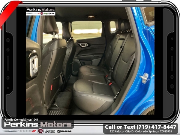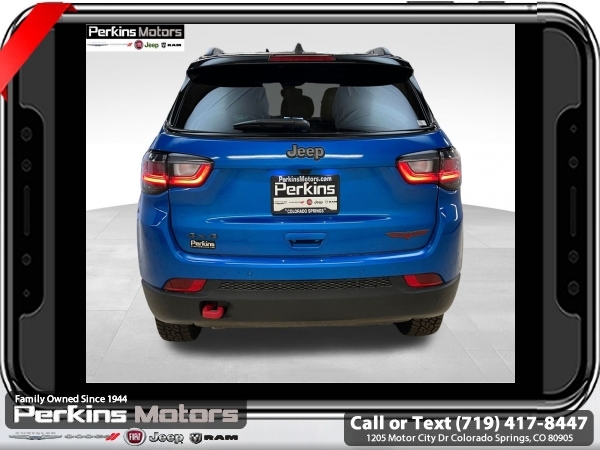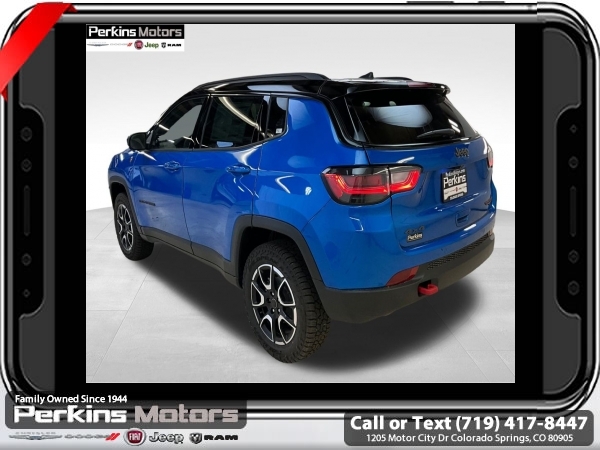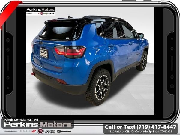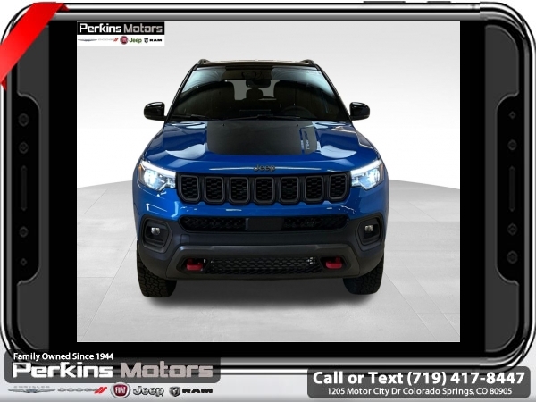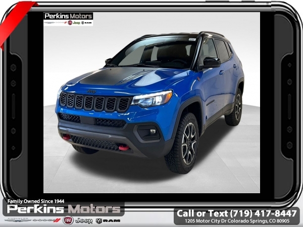 Factory MSRP: $38,560 $4,809 off MSRP! Hydro Blue Pearlcoat 2025 Jeep Compass Trailhawk 4WD 8-Speed Automatic 2.0L I4 DOHC<br>4WD.<br>Check us out at www.perkinsmotors.com to see our specials! Since opening our doors in 1944, we’ve been proud to serve Colorado Springs, CO, and the surrounding areas of Pueblo, Castle Rock and Denver, CO. Throughout this time of being family owned for 80 years, we’ve maintained a firm commitment to our customers: to offer a wide selection of New Chrysler, Dodge, Fiat, Jeep, and Ram vehicles and quality pre-owned vehicles, and provide a quick, no-hassle car-buying process that ensures everyone drives off the lot satisfied with their purchase.<br><br>Quick Order Package 29E, Trailhawk Elite Group (10.1 Touchscreen Display, 2nd Row USB Type A/C Charge Only, Alexa Built-In, Cluster 10.25 TFT Color Display, Connected Travel & Traffic Services, Driver Seat Memory, Foot Activated Open 'N Go Liftgate, GPS Navigation, HD Radio, Heated Front Seats, Heated Steering Wheel, Integrated Voice Command w/Bluetooth, LED Low/Highbeam Projector Headlamps, Power 2-Way Driver Lumbar Adjust, Power 2-Way Passenger Lumbar Adjust, Power 8-Way Adjust Front Passenger Seat, Power Adjust 8-Way Driver Seat, Power Liftgate, Premium Leather Trimmed Bucket Seats, Premium LED Fog Lamps, Premium Taillamps, Remote Start System, Reversible Carpet/Vinyl Cargo Mat, SiriusXM w/360L, Ventilated Front Seats, and Windshield Wiper De-Icer), 4WD, 4-Wheel Disc Brakes, 4.398 Final Drive Ratio, 6 Speakers, ABS brakes, Air Conditioning, Alloy wheels, AM/FM radio: SiriusXM, Auto High-beam Headlights, Auto-dimming Rear-View mirror, Automatic temperature control, Brake assist, Bumpers: body-color, Compass, Cruise Control, Delay-off headlights, Driver door bin, Driver vanity mirror, Dual front impact airbags, Dual front side impact airbags, Electronic Stability Control, Emergency communication system: Jeep Connect, Four wheel independent suspension, Front anti-roll bar, Front Bucket Seats, Front Center Armrest w/Storage, Front dual zone A/C, Front fog lights, Front License Plate Bracket, Front reading lights, Fully automatic headlights, Heated door mirrors, Illuminated entry, Knee airbag, Leather Shift Knob, Leather steering wheel, Low tire pressure warning, Occupant sensing airbag, Outside temperature display, Overhead airbag, Overhead console, Panic alarm, ParkView Rear Back-Up Camera, Passenger door bin, Passenger vanity mirror, Power door mirrors, Power steering, Power windows, Premium Cloth/Leather Trim Bucket Seats, Radio: Uconnect 5 w/10.1 Display, Rain sensing wipers, Rear anti-roll bar, Rear seat center armrest, Rear window defroster, Rear window wiper, Remote keyless entry, Security system, Split folding rear seat, Spoiler, Steering wheel mounted audio controls, Tachometer, Telescoping steering wheel, Tilt steering wheel, Traction control, Trip computer, Turn signal indicator mirrors, Variably intermittent wipers, and Wheels: 17 x 6.5 Painted Black Aluminum.<br><br>24/32 City/Highway MPG
