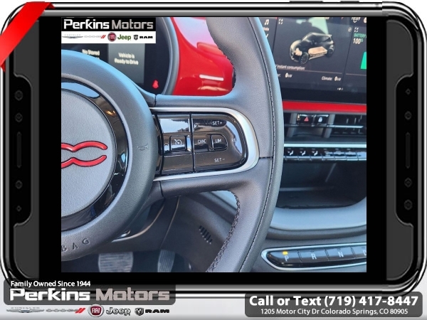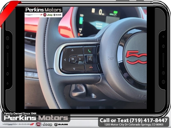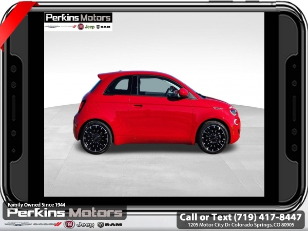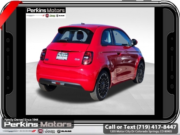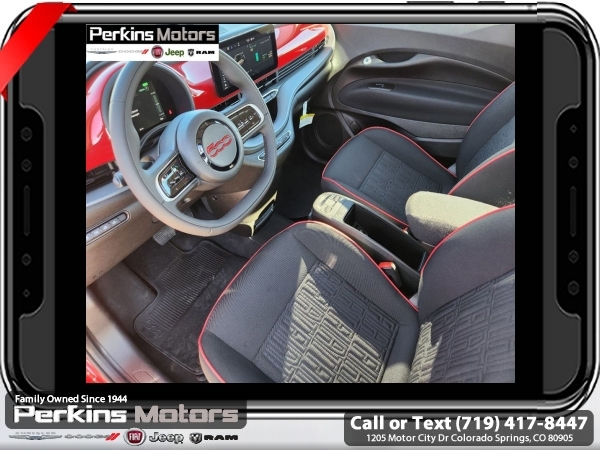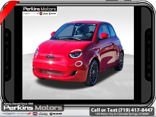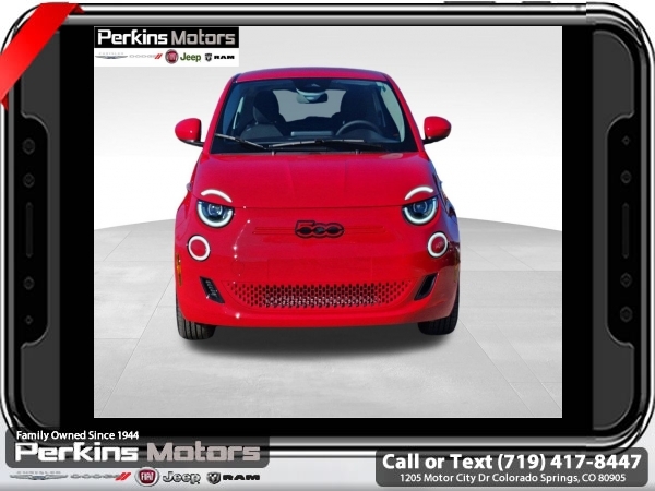 Factory MSRP: $34,095 Red by (Red) 2024 Fiat 500e Battery Electric FWD 1-Speed Automatic Electric<br><br>Check us out at www.perkinsmotors.com to see our specials! Since opening our doors in 1944, we’ve been proud to serve Colorado Springs, CO, and the surrounding areas of Pueblo, Castle Rock and Denver, CO. Throughout this time of being family owned for 80 years, we’ve maintained a firm commitment to our customers: to offer a wide selection of New Chrysler, Dodge, Fiat, Jeep, and Ram vehicles and quality pre-owned vehicles, and provide a quick, no-hassle car-buying process that ensures everyone drives off the lot satisfied with their purchase.<br><br>Quick Order Package 21A 500e Inspi(red), 6 Speakers, ABS brakes, Air Conditioning, Alloy wheels, AM/FM radio: SiriusXM, Anti-whiplash front head restraints, Automatic temperature control, Brake assist, Bumpers: body-color, Cloth Bucket Seats w/Red Accents, Compass, Cruise Control, Delay-off headlights, Driver door bin, Dual front impact airbags, Dual front side impact airbags, Electronic Stability Control, Front anti-roll bar, Front Bucket Seats, Front Center Armrest, Front dual zone A/C, Front reading lights, Front wheel independent suspension, Fully automatic headlights, Illuminated entry, Knee airbag, Low tire pressure warning, Manufacturer's Statement of Origin, Navigation System, Occupant sensing airbag, Outside temperature display, Overhead airbag, Overhead console, Panic alarm, ParkView Rear Back-Up Camera, Passenger door bin, Passenger vanity mirror, Power door mirrors, Power steering, Power windows, Premium audio system: Uconnect 5.0, Radio data system, Radio: Uconnect 5 Nav w/10.25 Display, Rain sensing wipers, Rear anti-roll bar, Rear window defroster, Rear window wiper, Remote keyless entry, Security system, Split folding rear seat, Spoiler, Sport steering wheel, Steering wheel mounted audio controls, Telescoping steering wheel, Tilt steering wheel, Traction control, Trip computer, Variably intermittent wipers, and Wheels: 17 x 7.0 Aluminum Multi-Spoke.