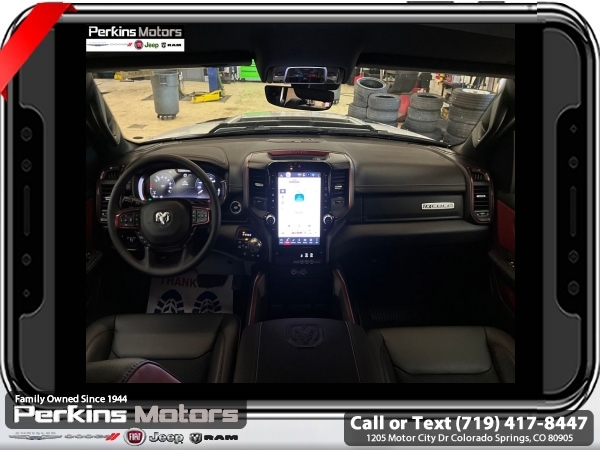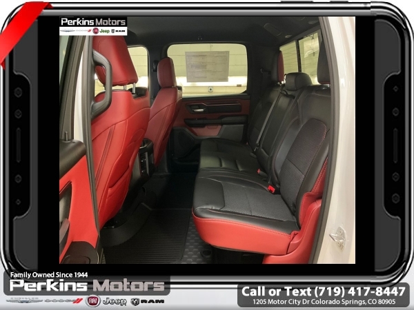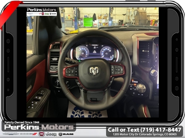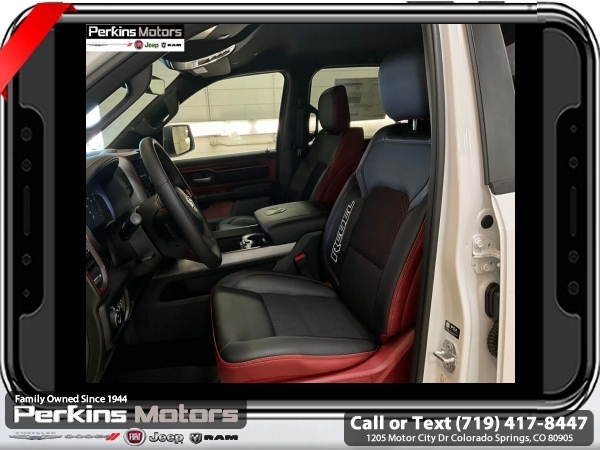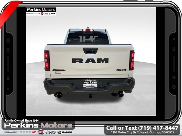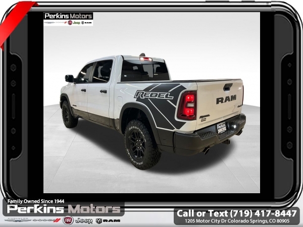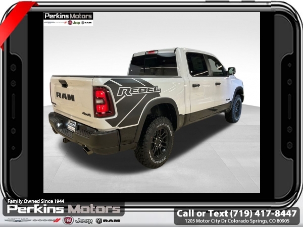Factory MSRP: $67,130 $12,500 off MSRP! Priced below KBB Fair Purchase Price! Bright White Clearcoat 2025 Ram 1500 Rebel 4WD 8-Speed Automatic 3.0L I6<br><br>Check us out at www.perkinsmotors.com to see our specials! Since opening our doors in 1944, we’ve been proud to serve Colorado Springs, CO, and the surrounding areas of Pueblo, Castle Rock and Denver, CO. Throughout this time of being family owned for 80 years, we’ve maintained a firm commitment to our customers: to offer a wide selection of New Chrysler, Dodge, Fiat, Jeep, and Ram vehicles and quality pre-owned vehicles, and provide a quick, no-hassle car-buying process that ensures everyone drives off the lot satisfied with their purchase.<br><br>Quick Order Package 21W Rebel, Rebel Level 1 Equipment Group (Auto Power-Folding Mirrors, Auto-Dimming Exterior Driver Mirror, Black Premium Power Mirrors, Convex Wide-Angle Exterior Mirror Insert, Exterior Mirrors Courtesy Lamps, Exterior Mirrors w/Heating Element, Exterior Mirrors w/Supplemental Signals, Heated Steering Wheel, Power 2-Way Driver Lumbar Adjust, Power Adjustable Pedals, Rear Window Defroster, Remote Tailgate Release, and Wireless Charging Pad), 10 Speakers, 3.92 Rear Axle Ratio, 33 Gallon Fuel Tank, 4 Way Front Headrests, 4-Wheel Disc Brakes, 4G LTE Wi-Fi Hot Spot, ABS brakes, Air Conditioning, Alloy wheels, AM/FM radio: SiriusXM with 360L, Apple CarPlay, Apple CarPlay/Android Auto, Auto High-beam Headlights, Auto-dimming Rear-View mirror, Automatic temperature control, Brake assist, Bucket Seats, Cloth/Vinyl Bucket Seats, Compass, Connected Travel & Traffic Services, Connectivity - US/Canada, Cruise Control, Delay-off headlights, Driver door bin, Driver vanity mirror, Dual front impact airbags, Dual front side impact airbags, Electronic Stability Control, Front anti-roll bar, Front Bucket Seats, Front Center Armrest w/Storage, Front dual zone A/C, Front fog lights, Front License Plate Bracket, Front reading lights, Front Seat Back Map Pockets, Front wheel independent suspension, Full Length Upgraded Floor Console, Fully automatic headlights, Garage door transmitter, Google Android Auto, GPS Antenna Input, GPS Navigation, Heated door mirrors, Heated front seats, Heated steering wheel, Illuminated entry, Integrated Voice Command w/Bluetooth, Leather steering wheel, Low tire pressure warning, Manual Folding Exterior Mirrors, Manufacturer's Statement of Origin, Navigation System, Occupant sensing airbag, Outside temperature display, Overhead airbag, Overhead console, Panic alarm, ParkView Rear Back-Up Camera, Passenger door bin, Passenger vanity mirror, Power Adjust 8-Way Driver Seat, Power door mirrors, Power driver seat, Power steering, Power windows, Radio data system, Radio: Uconnect 5 Nav w/12.0 Display, Rear 60/40 Folding Seat, Rear anti-roll bar, Rear seat center armrest, Rear step bumper, Remote keyless entry, SiriusXM w/360L, Split folding rear seat, Steering wheel mounted audio controls, Tachometer, Telescoping steering wheel, Tilt steering wheel, Traction control, Trip computer, USB Host Flip, Variably intermittent wipers, Voltmeter, and Wheels: 18 x 8.0 Painted Mid-Gloss Black. Sale price includes all manufacture's incentives and dealer discounts. Sale price not available on lease or compatible with special APR. $1000 - 2025 National Truck Month Bonus Cash . Exp. 03/03/2025 $1500 - 2025 West BC SFS Bonus Cash . Exp. 03/03/2025 $4000 - 2025 National Retail Consumer Cash. Exp. 03/03/2025