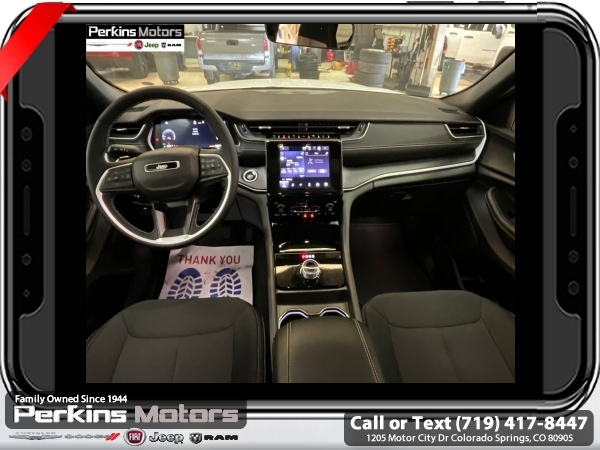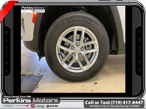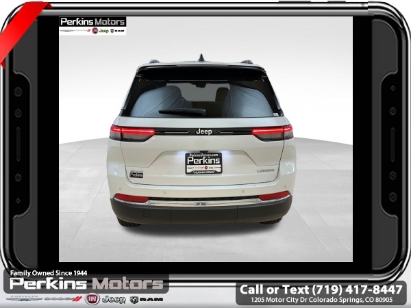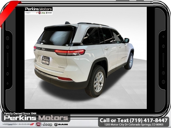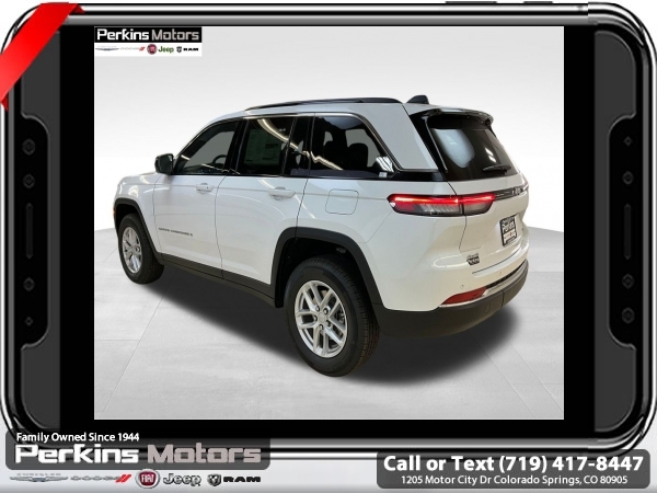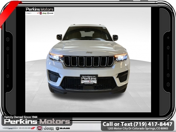 Factory MSRP: $41,580 $6,000 off MSRP! Priced below KBB Fair Purchase Price! Bright White Clearcoat 2025 Jeep Grand Cherokee Laredo 4WD 8-Speed Automatic 3.6L V6 24V VVT<br>4WD.<br>Check us out at www.perkinsmotors.com to see our specials! Since opening our doors in 1944, we’ve been proud to serve Colorado Springs, CO, and the surrounding areas of Pueblo, Castle Rock and Denver, CO. Throughout this time of being family owned for 80 years, we’ve maintained a firm commitment to our customers: to offer a wide selection of New Chrysler, Dodge, Fiat, Jeep, and Ram vehicles and quality pre-owned vehicles, and provide a quick, no-hassle car-buying process that ensures everyone drives off the lot satisfied with their purchase.<br><br>Quick Order Package 23D Laredo X (Laredo X and Wheels: 18 x 8 Fully Painted Aluminum), 4WD, 4-Wheel Disc Brakes, 6 Speakers, ABS brakes, Air Conditioning, Alloy wheels, Anti-whiplash front head restraints, Automatic temperature control, Brake assist, Bumpers: body-color, Cloth Seats, Compass, Cruise Control, Delay-off headlights, Driver door bin, Driver vanity mirror, Dual front impact airbags, Dual front side impact airbags, Electronic Stability Control, Emergency communication system, Four wheel independent suspension, Front anti-roll bar, Front Bucket Seats, Front Center Armrest w/Storage, Front dual zone A/C, Front License Plate Bracket, Front reading lights, Fully automatic headlights, Heated door mirrors, Illuminated entry, Knee airbag, Low tire pressure warning, Model Year Tracking, Normal Duty Suspension, Occupant sensing airbag, Outside temperature display, Overhead airbag, Overhead console, Panic alarm, ParkView Rear Back-Up Camera, Passenger door bin, Passenger vanity mirror, Power door mirrors, Power driver seat, Power steering, Power windows, Radio data system, Radio: Uconnect 5 w/8.4 Display, Rear anti-roll bar, Rear reading lights, Rear window defroster, Rear window wiper, Remote keyless entry, Security system, Speed-Sensitive Wipers, Split folding rear seat, Spoiler, Steering wheel mounted audio controls, Tachometer, Telescoping steering wheel, Tilt steering wheel, Traction control, Trip computer, Variably intermittent wipers, Voltmeter, and Wheels: 17 x 6.5 Fully Painted Aluminum.<br><br>19/26 City/Highway MPG Sale price includes all manufacture's incentives and dealer discounts. Sale price not available on lease or compatible with special APR. $1000 - 2025 National Retail Consumer Cash. Exp. 03/31/2025 $1000 - 2025 West BC SFS Bonus Cash . Exp. 03/31/2025 $1500 - 2025 National Jeep Celebration Event Retail Bonus Cash . Exp. 03/31/2025