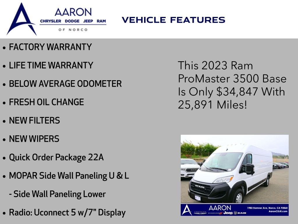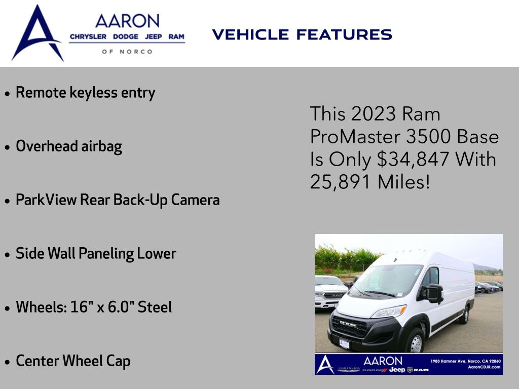 FACTORY WARRANTY, LIFE TIME WARRANTY, BELOW AVERAGE ODOMETER, FRESH OIL CHANGE, NEW FILTERS, NEW WIPERS, ProMaster 3500 High Roof 159 WB, 3D Extended Cargo Van, 3.6L V6 24V VVT, 9-Speed 948TE Automatic, FWD, Bright White Clearcoat, Center Wheel Cap, MOPAR Side Wall Paneling U & L, Overhead airbag, ParkView Rear Back-Up Camera, Quick Order Package 22A, Radio: Uconnect 5 w/7" Display, Remote keyless entry, Side Wall Paneling Lower, Wheels: 16" x 6.0" Steel.Clean CARFAX.CARFAX One-Owner.