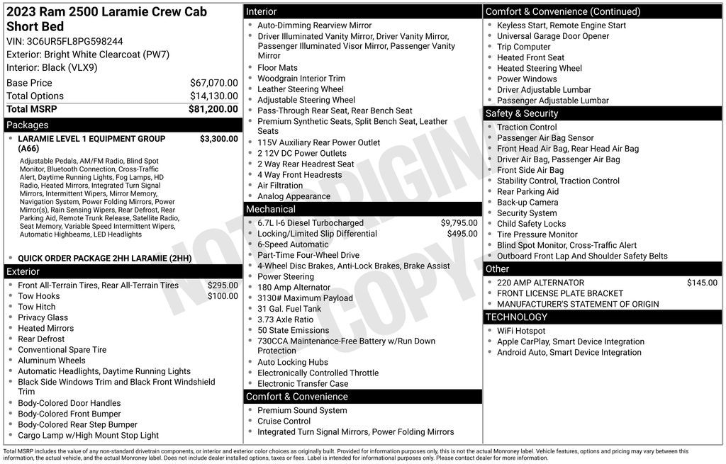 Priced below KBB Fair Purchase Price!FACTORY WARRANTY, LIFE TIME WARRANTY, NEW FILTERS, NEW WIPERS, 2500 Laramie, 4D Crew Cab, Cummins 6.7L I6 Turbodiesel, 6-Speed Automatic, 4WD, 12" Touchscreen Display, 2nd Row In Floor Storage Bins, 4G LTE Wi-Fi Hot Spot, Alexa Built-In, Alloy wheels, Apple CarPlay, Apple CarPlay/Android Auto, Auto Adjust In Reverse Exterior Mirrors, Auto Dim Exterior Mirror, Auto High Beam Headlamp Control, Auto Power-Folding Mirrors, Auto-Dimming Exterior Passenger Mirror, Blind Spot & Cross Path Detection, Chrome Exterior Mirrors, Connected Travel & Traffic Services, Connectivity - US/Canada, Disassociated Touchscreen Display, Exterior Mirrors Courtesy Lamps, Exterior Mirrors w/Heating Element, Exterior Mirrors w/Memory, Exterior Mirrors w/Supplemental Signals, Foam Bottle Insert (Door Trim Panel), For Details, Visit DriveUconnect.com, For More Info, Call 800-643-2112, Forward & Reverse Utility Lights, Front LED Fog Lamps, Global Telematics Box Module (TBM), Google Android Auto, GPS Antenna Input, GPS Navigation, HD Radio, Heated front seats, Integrated Voice Command w/Bluetooth, Laramie Level 1 Equipment Group, Leather Trim 40/20/40 Bench Seat, LED Reflector Headlamps, Mirror Running Lights, Navigation System, Off-Road Information Pages, ParkSense Front/Rear Park Assist System, ParkView Rear Back-Up Camera, Power Adjust Mirrors, Power Adjustable Convex Aux Mirrors, Power Adjustable Pedals w/Memory, Power Heated Fold Telescopic Mirrors w/Memory, Power Telescoping Mirrors, Quick Order Package 2HH Laramie, Radio: Uconnect 5 Nav w/12.0" Display, Radio/Driver Seat/Mirrors/Pedals Memory, Rain Sensitive Windshield Wipers, Rear Power Sliding Window, Rear Window Defroster, Remote keyless entry, Remote Tailgate Release, Selectable Tire Fill Alert, SiriusXM Radio Service, SiriusXM w/360L, Tow Hooks, Trailer Tow Pages.Clean CARFAX.CARFAX One-Owner.