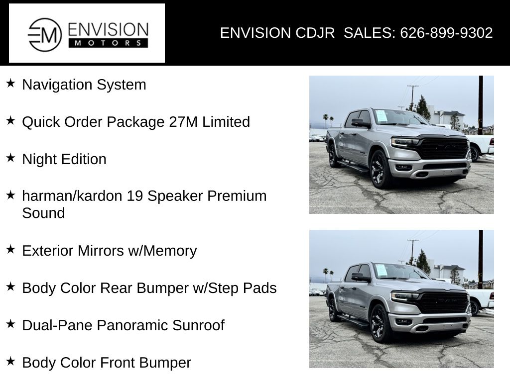 WE SPECIALIZE IN ALL CREDIT PROFILES! See what we can do for you! Call to find out (626) 899-9302.Certified. Clean CARFAX.Odometer is 5185 miles below market average! Accent Color Door Handles, Accent Color Premium Power Mirrors, Auto-Dimming Exterior Driver Mirror, Black Day Light Opening Moldings, Black Exterior Truck Badging, Black Grille Surround Texture 7 Black, Black Headlamp Bezels, Black Painted Exterior Mirrors Caps, Body Color Front Bumper, Body Color Rear Bumper w/Step Pads, Convex Wide-Angle Exterior Mirror Insert, Dome Dual LED Reading Lamp, Dual Exhaust w/Black Tips, Dual-Pane Panoramic Sunroof, Exterior Mirrors Courtesy Lamps, Exterior Mirrors w/Heating Element, Exterior Mirrors w/Memory, Exterior Mirrors w/Supplemental Signals, harman/kardon 19 Speaker Premium Sound, LED Dome/Reading Lamp, Navigation System, Night Edition, Power-Folding Mirrors, Quick Order Package 27M Limited, RAM Grille Badge - Black, Sport Performance Hood, Tow Hooks, Tri-Fold Tonneau Cover, Wheels: 22" x 9" Black Aluminum.Billet Silver Metallic Clearcoat2024 Ram 1500 Limited 4WD 8-Speed Automatic HEMI 5.7L V8 Multi Displacement VVT eTorqueFCA US LLC Certified Pre-Owned Details: * Roadside Assistance * Transferable Warranty * Warranty Deductible: $100 * Includes First Day Rental, Car Rental Allowance, and Trip Interruption Benefits. SiriusXM 3 month trial subscription. * 125 Point Inspection * Limited Warranty: 3 Month/3,000 Mile (whichever comes first) after new car warranty expires or from certified purchase date * Vehicle History * Powertrain Limited Warranty: 84 Month/100,000 Mile (whichever comes first) from original in-service date**********All Pricing and Advertised Prices for any/all vehicles offered for sale does not include dealer installed accessories which can be purchased for an additional cost.********** The Factory Rebates may not be available on this vehicle if you elect to take advantage of a Special Alternative APR or Special Lease program. Some Factory Rebates are California Resident specific and may vary for residents of other states. NO sales to Dealers, Brokers or Exporters. For out of state purchase, customers must be present to purchase. If shipping is required, dealership must facilitate; no exceptions. Please contact us for special Multi-Vehicle or Fleet pricing. Prices are plus government fees and taxes, any finance charges, $85 documentary fee, $29 electronic registration fee, any emission testing charge and $1.75 per new tire state tire fee. *** We make every effort to provide accurate information, but please verify before purchasing. Leasing & financing available on approved credit. Trade-ins accepted. Subject to prior sale.