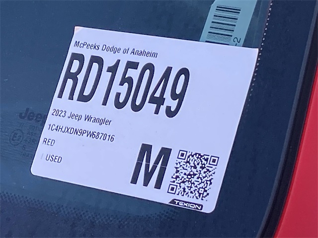 Recent Arrival! Odometer is 18578 miles below market average! Clean CARFAX. CARFAX One-Owner. INTERIOR & EXTERIOR PROFESSIONALLY DETAILED FOR DELIVERY, MCPEEK CHRYSLER DODGE JEEP RAM FAMILY OWNED AND OPERATED SINCE 1961 !!!!!.Firecracker Red Clearcoat 2023 Jeep Wrangler Sport S 4WD 8-Speed AutomaticReceive Free lube and oil filter changes for up to 45,000 miles for 3 years!!! McPeek's Dodge of Anahiem 1221 S. Auto Center Drive Anahiem, CA 92806 714-262-4902.