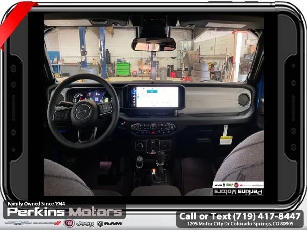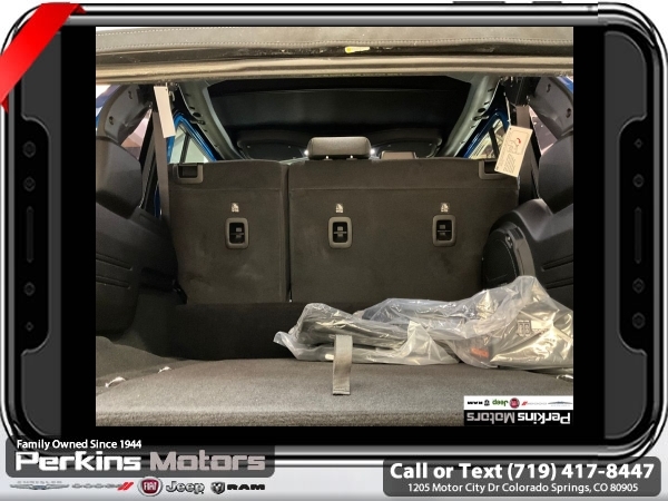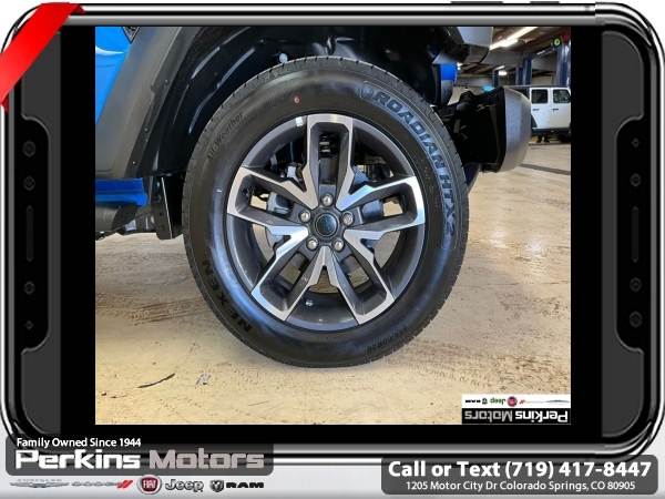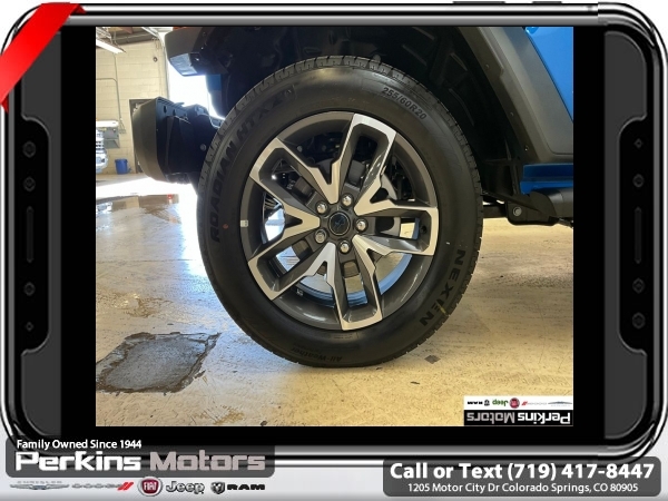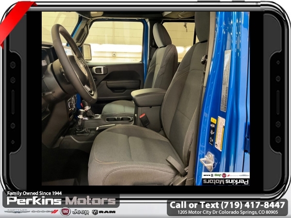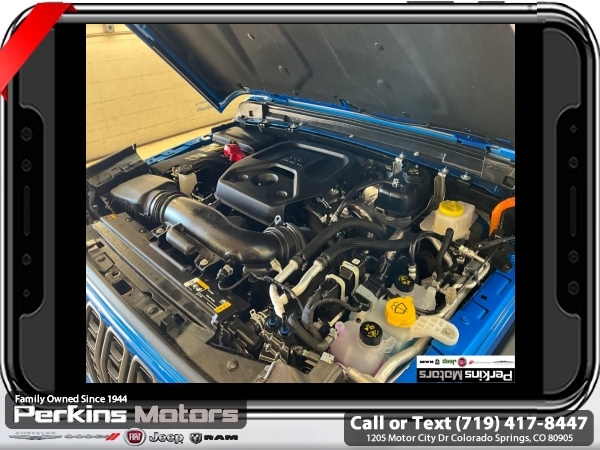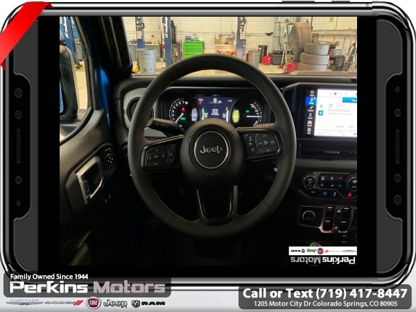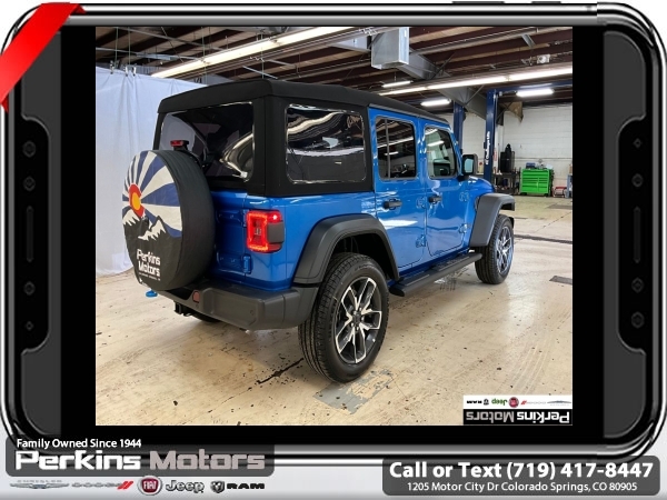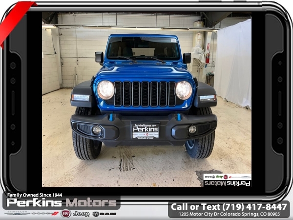 Factory MSRP: $60,030 $11,500 off MSRP! Priced below KBB Fair Purchase Price! Hydro Blue Pearl Coat 2024 Jeep Wrangler Sport S 4xe 4WD 8-Speed Automatic 2.0L I4 DOHC<br>2.0L I4 DOHC.<br>Check us out at www.perkinsmotors.com to see our specials! Since opening our doors in 1944, we’ve been proud to serve Colorado Springs, CO, and the surrounding areas of Pueblo, Castle Rock and Denver, CO. Throughout this time of being family owned for 80 years, we’ve maintained a firm commitment to our customers: to offer a wide selection of New Chrysler, Dodge, Fiat, Jeep, and Ram vehicles and quality pre-owned vehicles, and provide a quick, no-hassle car-buying process that ensures everyone drives off the lot satisfied with their purchase.<br><br>Convenience Group (Universal Garage Door Opener), Quick Order Package 29U Sport S, Safety Group (Auto High Beam Headlamp Control, LED Taillamps, and ParkSense Rear Park Assist System), Technology Group, Trailer Tow & Aux Switch Group (Auxiliary Switches), 2.0L I4 DOHC, 3.73 Rear Axle Ratio, 4-Wheel Disc Brakes, 8 Speakers, ABS brakes, Air Conditioning, Alloy wheels, Apple CarPlay/Android Auto, Automatic temperature control, Brake assist, Cloth Low-Back Bucket Seats, Compass, Cruise Control, Delay-off headlights, Driver door bin, Driver vanity mirror, Dual front impact airbags, Dual front side impact airbags, Electronic Stability Control, Front anti-roll bar, Front Bucket Seats, Front Center Armrest w/Storage, Front dual zone A/C, Front fog lights, Front License Plate Bracket, Front reading lights, Fully automatic headlights, Heated door mirrors, Illuminated entry, Integrated roll-over protection, Low tire pressure warning, MOPAR All-Weather Floor Mats, Mopar Black Tubular Side Steps, Occupant sensing airbag, Outside temperature display, Overhead airbag, Panic alarm, ParkView Rear Back-Up Camera, Passenger door bin, Passenger vanity mirror, Power door mirrors, Power steering, Power windows, Radio data system, Radio: Uconnect 5 w/12.3 Display, Rear anti-roll bar, Rear reading lights, Remote keyless entry, Security system, Split folding rear seat, Sport Suspension, Steering wheel mounted audio controls, Tachometer, Telescoping steering wheel, Tilt steering wheel, Traction control, Trip computer, Variably intermittent wipers, Voltmeter, and Wheels: 20 x 8 Machined/Painted Gray. Sale price includes all manufacture's incentives and dealer discounts. Sale price not available on lease or compatible with special APR. $500 - 2024 National Jeep Celebration Event Bonus Cash. Exp. 03/31/2025 $7500 - 2024 National Retail Consumer Cash . Exp. 03/31/2025