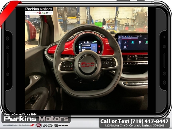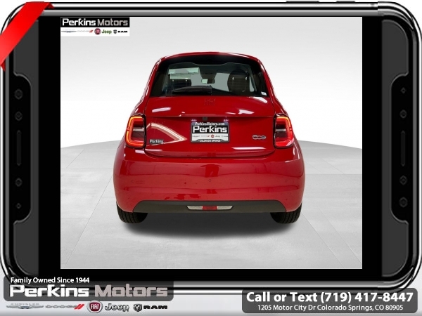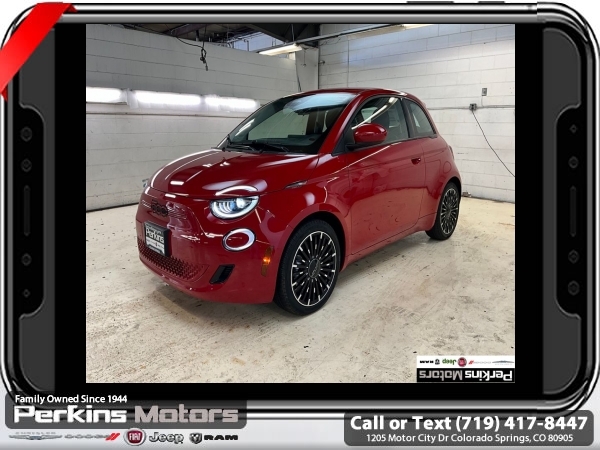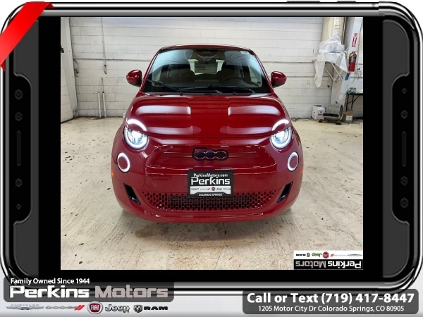 Factory MSRP: $34,095 Red by (Red) 2024 Fiat 500e Battery Electric FWD 1-Speed Automatic Electric<br><br>Check us out at www.perkinsmotors.com to see our specials! Since opening our doors in 1944, we’ve been proud to serve Colorado Springs, CO, and the surrounding areas of Pueblo, Castle Rock and Denver, CO. Throughout this time of being family owned for 80 years, we’ve maintained a firm commitment to our customers: to offer a wide selection of New Chrysler, Dodge, Fiat, Jeep, and Ram vehicles and quality pre-owned vehicles, and provide a quick, no-hassle car-buying process that ensures everyone drives off the lot satisfied with their purchase.<br><br>Quick Order Package 21A 500e Inspi(red), 6 Speakers, ABS brakes, Air Conditioning, Alloy wheels, AM/FM radio: SiriusXM, Anti-whiplash front head restraints, Automatic temperature control, Brake assist, Bumpers: body-color, Cloth Bucket Seats w/Red Accents, Compass, Cruise Control, Delay-off headlights, Driver door bin, Dual front impact airbags, Dual front side impact airbags, Electronic Stability Control, Front anti-roll bar, Front Bucket Seats, Front Center Armrest, Front dual zone A/C, Front reading lights, Front wheel independent suspension, Fully automatic headlights, Illuminated entry, Knee airbag, Low tire pressure warning, Navigation System, Occupant sensing airbag, Outside temperature display, Overhead airbag, Overhead console, Panic alarm, ParkView Rear Back-Up Camera, Passenger door bin, Passenger vanity mirror, Power door mirrors, Power steering, Power windows, Premium audio system: Uconnect 5.0, Radio data system, Radio: Uconnect 5 Nav w/10.25 Display, Rain sensing wipers, Rear anti-roll bar, Rear window defroster, Rear window wiper, Remote keyless entry, Security system, Split folding rear seat, Spoiler, Sport steering wheel, Steering wheel mounted audio controls, Telescoping steering wheel, Tilt steering wheel, Traction control, Trip computer, Variably intermittent wipers, and Wheels: 17 x 7.0 Aluminum Multi-Spoke.