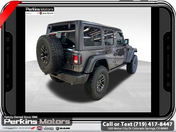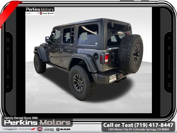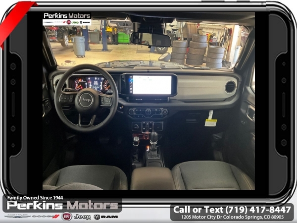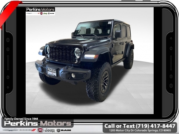 Factory MSRP: $61,360 $7,836 off MSRP! Granite Crystal Metallic Clearcoat 2025 Jeep Wrangler Willys 4WD 8-Speed Automatic 3.6L V6 24V VVT<br><br>Check us out at www.perkinsmotors.com to see our specials! Since opening our doors in 1944, we’ve been proud to serve Colorado Springs, CO, and the surrounding areas of Pueblo, Castle Rock and Denver, CO. Throughout this time of being family owned for 80 years, we’ve maintained a firm commitment to our customers: to offer a wide selection of New Chrysler, Dodge, Fiat, Jeep, and Ram vehicles and quality pre-owned vehicles, and provide a quick, no-hassle car-buying process that ensures everyone drives off the lot satisfied with their purchase.<br><br>Convenience Group (2-Door Passive Entry, Front Door Locks, Air Conditioning w/Auto Temperature Control, Air Filtering, Cluster 7.0 TFT Color Display, Emergency/Assistance Call, Heated Front Seats, Heated Steering Wheel, Remote Start System, and Universal Garage Door Opener), Quick Order Package 24W Willys (4-Wheel Drive Swing Gate Decal, 4.10 Rear Axle Ratio, 7 & 4 Pin Wiring Harness, 97 MPH Vehicle Max Speed Calibration, Advanced Brake Assist, Automatic Headlamps, Auxiliary Switches, Black Grille, Class II Receiver Hitch, Conventional Differential Front Axle, Corning Gorilla Glass, Dana M210 Wide HD Tube Front Axle, Dana M220 Wide Rear Axle, Daytime Running Lamps LED Accents, Deep Tint Sunscreen Windows, E-Locker Rear Axle, Enhanced Adaptive Cruise Control, Front LED Fog Lamps, Full Speed Forward Collision Warning Plus, Injection Molded Black Rear Bumper, LED Premium Reflector Headlamps, Mold In Color Bumper w/Gloss Black, Molded in Color Rubicon Highline Flare, MOPAR All-Weather Floor Mats, Off-Road Plus Mode, Power Heated Mirrors, Premium Wrapped Steering Wheel, Security Alarm, Sun Visors w/Illuminated Vanity Mirrors, Wheels: 17 x 7.5 Painted Black, Willy's Suspension, and Willys Hood Decal), Technology Group (DISC) (Alpine Premium Audio System), Trailer Tow & Aux Switch Group, Xtreme 35 Tire Package (35 Tire Suspension, 4.56 Rear Axle Ratio, Anti-Lock 4-Wheel Disc Perf Brakes, MOPAR Hinge-Gate Reinforcement, Wheel Flare Extensions, and Wheels: 17 x 8 Machined w/Black Pockets), 110 MPH Vehicle Max Speed Calibration, 3.45 Overall Top Gear Ratio, 4-Wheel Disc Brakes, 8 Speakers, ABS brakes, Air Conditioning, Apple CarPlay/Android Auto, Aux Battery, Black 3-Piece Hard Top, Brake assist, Cloth Low-Back Bucket Seats, Compass, Cruise Control, Delay-off headlights, Driver door bin, Driver vanity mirror, Dual front impact airbags, Dual front side impact airbags, Electronic Stability Control, Freedom Panel Storage Bag, Front anti-roll bar, Front Bucket Seats, Front Center Armrest w/Storage, Front fog lights, Front reading lights, Illuminated entry, Integrated roll-over protection, Jeep Trail Rated Kit, Low tire pressure warning, Non-Lock Fuel Cap w/o Discriminator, Normal Duty Suspension, Occupant sensing airbag, Outside temperature display, Overhead airbag, Panic alarm, ParkView Rear Back-Up Camera, Passenger door bin, Passenger vanity mirror, Power steering, Power windows, Radio data system, Radio: Uconnect 5 w/12.3 Display, Rear anti-roll bar, Rear reading lights, Rear Window Defroster, Rear Window Wiper/Washer, Remote keyless entry, Split folding rear seat, Steering wheel mounted audio controls, Stop-Start Dual Battery System, Tachometer, Telescoping steering wheel, Tilt steering wheel, Traction control, Trip computer, Variably intermittent wipers, and Wheels: 17 x 7.5 Black Steel Styled.