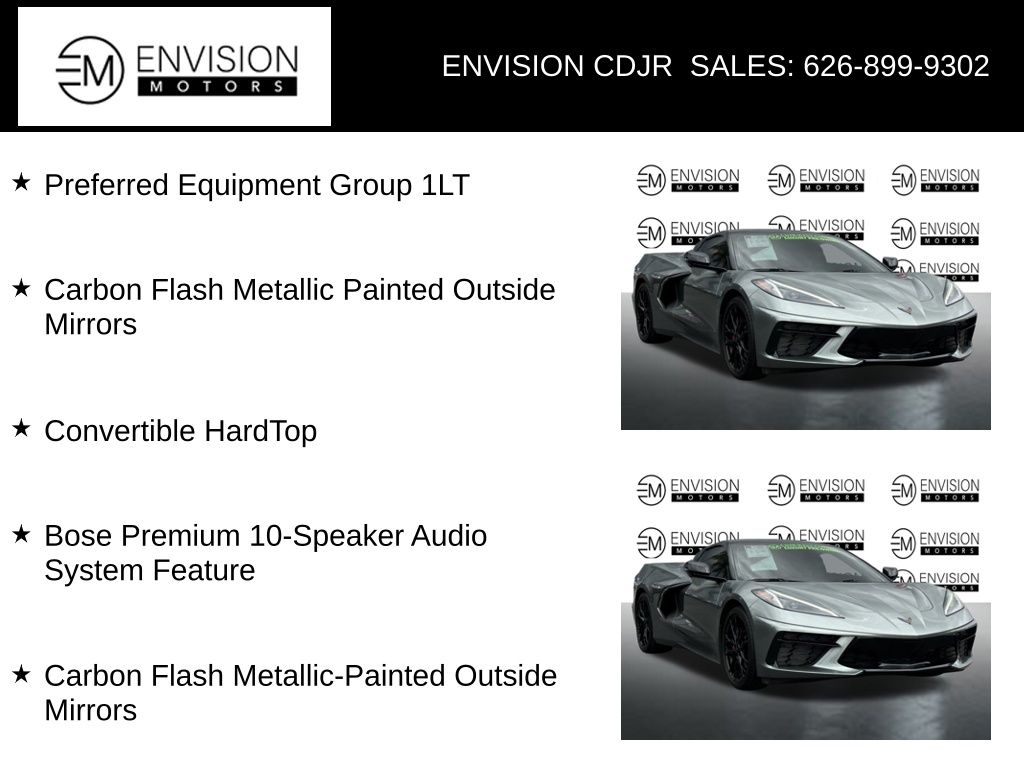 WE SPECIALIZE IN ALL CREDIT PROFILES! See what we can do for you! Call to find out (626) 899-9302.Clean CARFAX.Bose Premium 10-Speaker Audio System Feature, Carbon Flash Metallic Painted Outside Mirrors, Carbon Flash Metallic-Painted Outside Mirrors, Convertible HardTop, Preferred Equipment Group 1LT.Hypersonic Gray Metallic2023 Chevrolet Corvette Stingray RWD 8-Speed Dual Clutch 6.2L V8**********All Pricing and Advertised Prices for any/all vehicles offered for sale does not include dealer installed accessories which can be purchased for an additional cost.********** The Factory Rebates may not be available on this vehicle if you elect to take advantage of a Special Alternative APR or Special Lease program. Some Factory Rebates are California Resident specific and may vary for residents of other states. NO sales to Dealers, Brokers or Exporters. For out of state purchase, customers must be present to purchase. If shipping is required, dealership must facilitate; no exceptions. Please contact us for special Multi-Vehicle or Fleet pricing. Prices are plus government fees and taxes, any finance charges, $85 documentary fee, $29 electronic registration fee, any emission testing charge and $1.75 per new tire state tire fee. *** We make every effort to provide accurate information, but please verify before purchasing. Leasing & financing available on approved credit. Trade-ins accepted. Subject to prior sale.Awards: * Car and Driver 10 BestCar and Driver, January 2017.