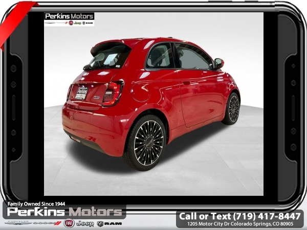 Factory MSRP: $34,095 Red by (Red) 2024 Fiat 500e Battery Electric FWD 1-Speed Automatic Electric<br><br>Check us out at www.perkinsmotors.com to see our specials! Since opening our doors in 1944, we’ve been proud to serve Colorado Springs, CO, and the surrounding areas of Pueblo, Castle Rock and Denver, CO. Throughout this time of being family owned for 80 years, we’ve maintained a firm commitment to our customers: to offer a wide selection of New Chrysler, Dodge, Fiat, Jeep, and Ram vehicles and quality pre-owned vehicles, and provide a quick, no-hassle car-buying process that ensures everyone drives off the lot satisfied with their purchase.<br><br>Quick Order Package 21A 500e Inspi(red), 6 Speakers, ABS brakes, Air Conditioning, Alloy wheels, AM/FM radio: SiriusXM, Anti-whiplash front head restraints, Automatic temperature control, Brake assist, Bumpers: body-color, Cloth Bucket Seats w/Red Accents, Compass, Cruise Control, Delay-off headlights, Driver door bin, Dual front impact airbags, Dual front side impact airbags, Electronic Stability Control, Front anti-roll bar, Front Bucket Seats, Front Center Armrest, Front dual zone A/C, Front reading lights, Front wheel independent suspension, Fully automatic headlights, Illuminated entry, Knee airbag, Low tire pressure warning, Manufacturer's Statement of Origin, Navigation System, Occupant sensing airbag, Outside temperature display, Overhead airbag, Overhead console, Panic alarm, ParkView Rear Back-Up Camera, Passenger door bin, Passenger vanity mirror, Power door mirrors, Power steering, Power windows, Premium audio system: Uconnect 5.0, Radio data system, Radio: Uconnect 5 Nav w/10.25 Display, Rain sensing wipers, Rear anti-roll bar, Rear window defroster, Rear window wiper, Remote keyless entry, Security system, Split folding rear seat, Spoiler, Sport steering wheel, Steering wheel mounted audio controls, Telescoping steering wheel, Tilt steering wheel, Traction control, Trip computer, Variably intermittent wipers, and Wheels: 17 x 7.0 Aluminum Multi-Spoke.