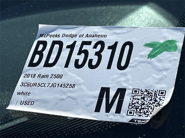 Odometer is 5027 miles below market average! INTERIOR & EXTERIOR PROFESSIONALLY DETAILED FOR DELIVERY, MCPEEK CHRYSLER DODGE JEEP RAM FAMILY OWNED AND OPERATED SINCE 1961 !!!!!, 1-Yr SiriusXM Radio Service, 180 Amp Alternator, 4-Wheel Disc Brakes, 40/20/40 Split Bench Seat, 5.0" Touchscreen Display, 6 Speakers, ABS brakes, Air Conditioning, AM/FM radio, Anti-Spin Differential Rear Axle, Black Exterior Mirrors, Brake assist, Carpet Floor Covering, Charge Only Remote USB Port, Delay-off headlights, Dual front impact airbags, Dual front side impact airbags, Electric Shift-On-The-Fly Transfer Case, Electronic Stability Control, Electronically Controlled Throttle, Exterior Mirrors w/Heating Element, For More Info, Call 800-643-2112, Front & Rear Floor Mats, Front anti-roll bar, Front Center Armrest, Fully automatic headlights, GPS Antenna Input, Heated door mirrors, Heavy Duty Vinyl 40/20/40 Split Bench Seat, Hemi Badge, Integrated Voice Command w/Bluetooth, Locking Tailgate, Low tire pressure warning, Manual Adjust Seats, Manufacturer's Statement of Origin, Next Generation Engine Controller, Occupant sensing airbag, Overhead airbag, Overhead Console, ParkSense Rear Park Assist System, ParkView Rear Back-Up Camera, Passenger door bin, Popular Equipment Group, Power door mirrors, Power steering, Power windows, Protection Group, Quick Order Package 2FA Tradesman, Radio data system, Radio: 3.0, Radio: Uconnect 3 w/5" Display, Rear Folding Seat, Rear step bumper, Rear View Day/Night Mirror, Remote Keyless Entry, SiriusXM Satellite Radio, Speed control, Storage Tray, Tachometer, Temperature & Compass Gauge, Tilt steering wheel, Tip Start, Traction control, Variably intermittent wipers, Vendor Painted Cargo Box Tracking, Voltmeter.Bright White Clearcoat 2018 Ram 2500 Tradesman 4WD 6-Speed AutomaticReceive Free lube and oil filter changes for up to 45,000 miles for 3 years!!! McPeek's Dodge of Anahiem 1221 S. Auto Center Drive Anahiem, CA 92806 714-262-4902.