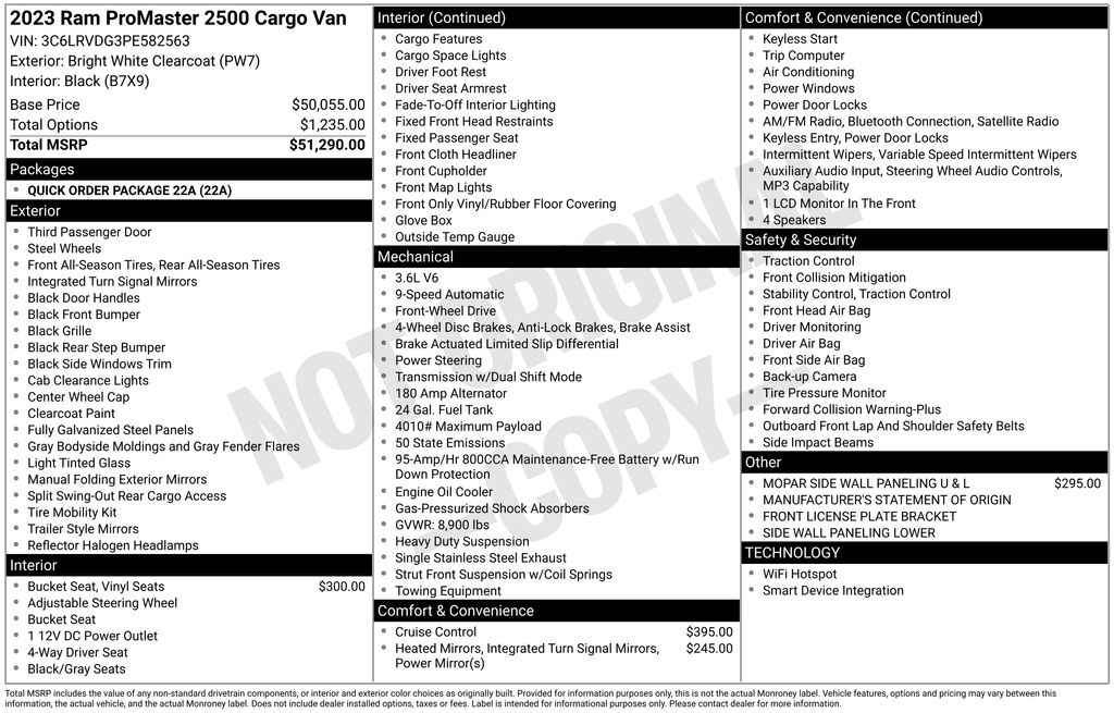 FACTORY WARRANTY, LIFE TIME WARRANTY, FRESH OIL CHANGE, NEW FILTERS, NEW WIPERS, ProMaster 2500 High Roof 159 WB, 3D Cargo Van, 3.6L V6 24V VVT, 9-Speed 948TE Automatic, FWD, Apple CarPlay/Android Auto, Center Wheel Cap, MOPAR Side Wall Paneling U & L, Overhead airbag, ParkView Rear Back-Up Camera, Quick Order Package 22A, Radio: Uconnect 5 w/7" Display, Remote keyless entry, Side Wall Paneling Lower.Clean CARFAX.CARFAX One-Owner.