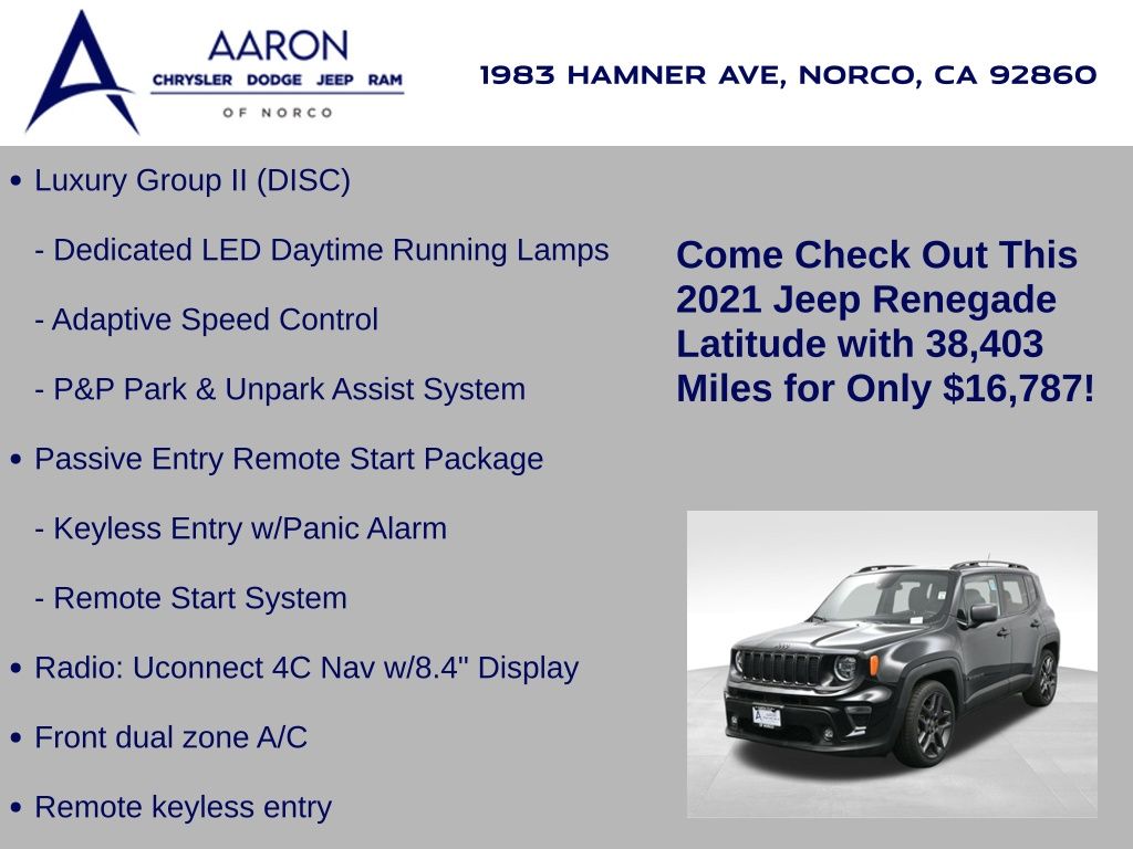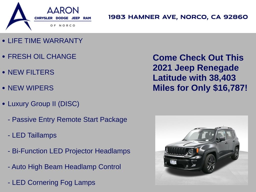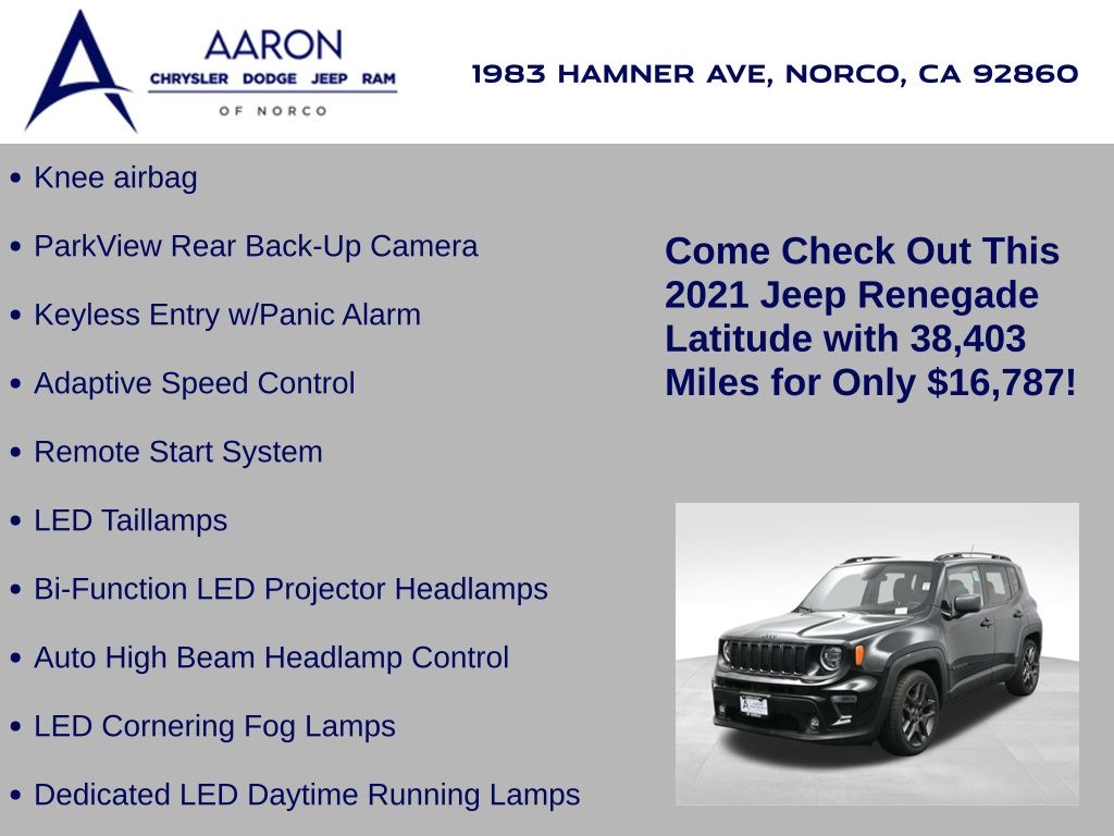 Priced below KBB Fair Purchase Price!LIFE TIME WARRANTY, FRESH OIL CHANGE, NEW FILTERS, NEW WIPERS, Renegade Latitude, 4D Sport Utility, 1.3L I4, 9-Speed 948TE Automatic, FWD, Black Clearcoat, Black Cloth, 17" x 7.0" Aluminum Wheels, Adaptive Speed Control, Alloy wheels, Apple CarPlay/Android Auto, Auto High Beam Headlamp Control, Bi-Function LED Projector Headlamps, Dedicated LED Daytime Running Lamps, Front dual zone A/C, Keyless Entry w/Panic Alarm, Knee airbag, LED Cornering Fog Lamps, LED Taillamps, Luxury Group II (DISC), Overhead airbag, P&P Park & Unpark Assist System, ParkView Rear Back-Up Camera, Passive Entry Remote Start Package, Radio: Uconnect 4C Nav w/8.4" Display, Remote keyless entry, Remote Start System.Clean CARFAX.CARFAX One-Owner.