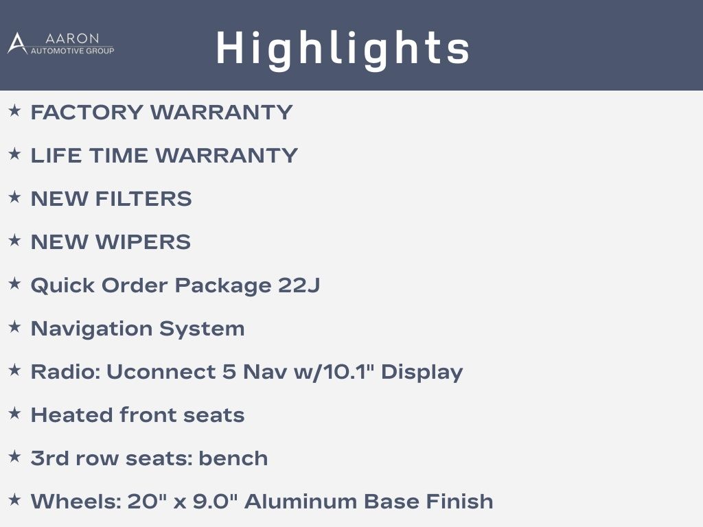 Priced below KBB Fair Purchase Price!FACTORY WARRANTY, LIFE TIME WARRANTY, NEW FILTERS, NEW WIPERS, Wagoneer Series II, 4D Sport Utility, 5.7L V8, 8-Speed Automatic, 4WD, 3rd row seats: bench, Alloy wheels, Dual front side impact airbags, Exterior Parking Camera Rear, Front dual zone A/C, Front fog lights, Heated front seats, Knee airbag, Memory seat, Navigation System, Power Liftgate, Quick Order Package 22J, Radio: Uconnect 5 Nav w/10.1" Display, Rear dual zone A/C, Remote keyless entry, Wheels: 20" x 9.0" Aluminum Base Finish.Clean CARFAX.CARFAX One-Owner.
