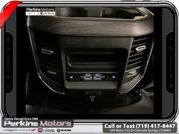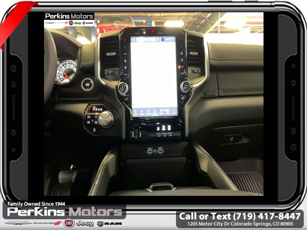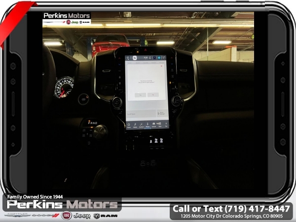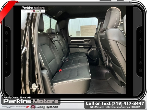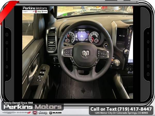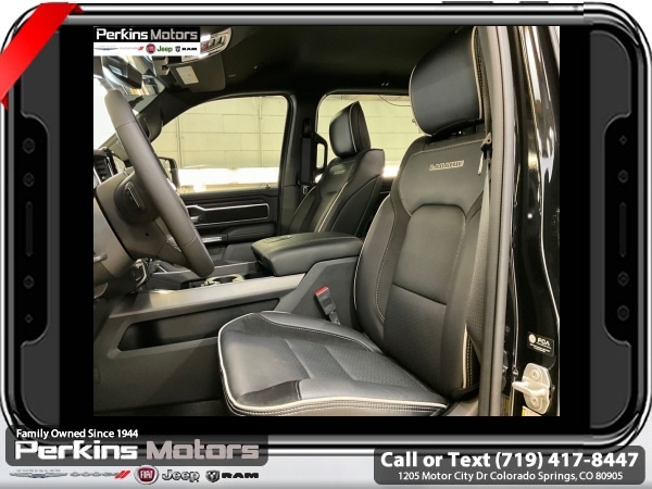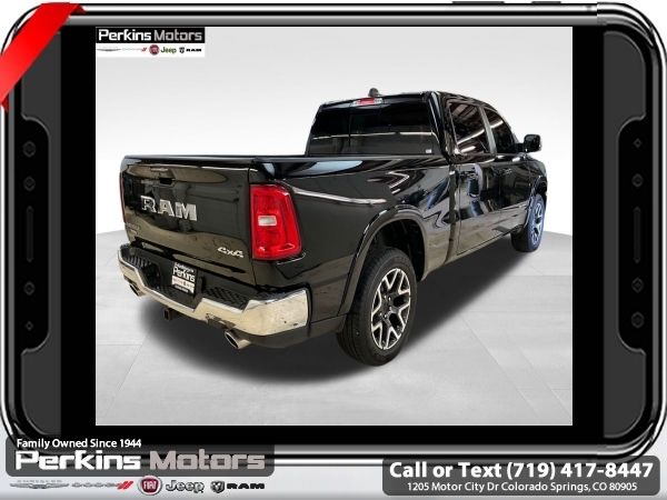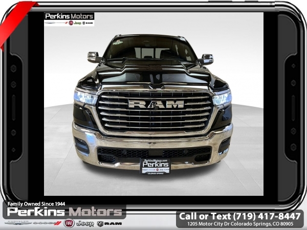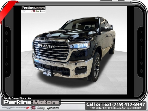 Factory MSRP: $68,860 $15,430 off MSRP! Priced below KBB Fair Purchase Price! Diamond Black Crystal Pearlcoat 2025 Ram 1500 Laramie 4WD 8-Speed Automatic 3.0L I6<br><br>Check us out at www.perkinsmotors.com to see our specials! Since opening our doors in 1944, we’ve been proud to serve Colorado Springs, CO, and the surrounding areas of Pueblo, Castle Rock and Denver, CO. Throughout this time of being family owned for 80 years, we’ve maintained a firm commitment to our customers: to offer a wide selection of New Chrysler, Dodge, Fiat, Jeep, and Ram vehicles and quality pre-owned vehicles, and provide a quick, no-hassle car-buying process that ensures everyone drives off the lot satisfied with their purchase.<br><br>Laramie Level 1 Equipment Group (Rain Sensitive Windshield Wipers and Remote Tailgate Release), Quick Order Package 21H Laramie, 10 Speakers, 3 Rear Seat Head Restraints, 3.55 Rear Axle Ratio, 4 Way Front Headrests, 4-Wheel Disc Brakes, 4G LTE Wi-Fi Hot Spot, ABS brakes, Air Conditioning, Alloy wheels, AM/FM radio: SiriusXM with 360L, Apple CarPlay, Apple CarPlay/Android Auto, Audio memory, Auto High-beam Headlights, Auto Power-Folding Mirrors, Auto-dimming door mirrors, Auto-Dimming Exterior Driver Mirror, Auto-dimming Rear-View mirror, Automatic temperature control, Brake assist, Bumpers: chrome, Chrome Exterior Mirrors, Compass, Connected Travel & Traffic Services, Connectivity - US/Canada, Convex Wide-Angle Exterior Mirror Insert, Cruise Control, Delay-off headlights, Driver door bin, Driver Seat Memory, Driver vanity mirror, Dual front impact airbags, Dual front side impact airbags, Electronic Stability Control, Engine Block Heater, Exterior Mirrors Courtesy Lamps, Exterior Mirrors w/Heating Element, Exterior Mirrors w/Memory, Exterior Mirrors w/Supplemental Signals, Front anti-roll bar, Front Center Armrest w/Storage, Front dual zone A/C, Front fog lights, Front License Plate Bracket, Front reading lights, Front Seat Back Map Pockets, Front wheel independent suspension, Fully automatic headlights, Garage door transmitter, Google Android Auto, GPS Antenna Input, GPS Navigation, HD Radio, Heated door mirrors, Heated Front Seats, Heated front seats, Heated rear seats, Heated Steering Wheel, Heated steering wheel, Illuminated entry, Integrated Voice Command w/Bluetooth, Leather steering wheel, Leather Trim 40/20/40 Bench Seat, Low tire pressure warning, Manufacturer's Statement of Origin, Memory seat, MOPAR Front & Rear Rubber Floor Mats, Navigation System, Occupant sensing airbag, Outside temperature display, Overhead airbag, Overhead console, Panic alarm, ParkView Rear Back-Up Camera, Passenger door bin, Passenger vanity mirror, Power 2-Way Driver Lumbar Adjust, Power 2-Way Passenger Lumbar Adjust, Power Adjust 8-Way Front Passenger Seat, Power door mirrors, Power driver seat, Power passenger seat, Power steering, Power windows, Radio data system, Radio: Uconnect 5 Nav w/12.0 Display, RAM Grille Badge - Chrome, Rear anti-roll bar, Rear reading lights, Rear seat center armrest, Rear step bumper, Remote keyless entry, Security system, SiriusXM w/360L, Split folding rear seat, Steering wheel mounted audio controls, Tachometer, Telescoping steering wheel, Tilt steering wheel, Traction control, Trailer Brake Control, Trip computer, Turn signal indicator mirrors, USB Host Flip, Variably intermittent wipers, Ventilated Front Seats, Ventilated front seats, Voltmeter, and Wheels: 20 x 9 Premium Paint/Polish. Sale price includes all manufacture's incentives and dealer discounts. Sale price not available on lease or compatible with special APR. $3000 - 2025 National Retail Consumer Cash. Exp. 06/30/2025 $7092 - 2025 National Minimum Employee Pricing Discount. Exp. 06/30/2025