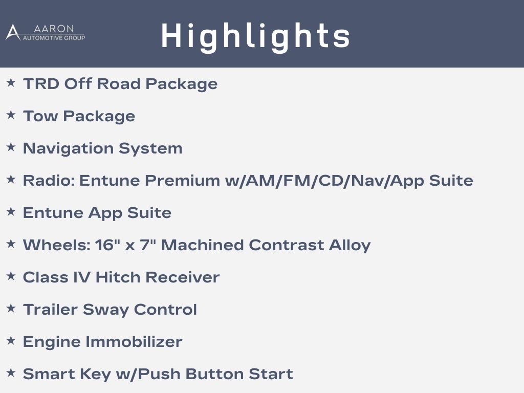 Priced below KBB Fair Purchase Price!Tacoma TRD Offroad, 4D Double Cab, V6, 6-Speed Automatic, RWD, Silver Sky, Graphite Cloth, 120V/400W Deck Mounted AC Power, 130 Amp Alternator, ATF Cooler, Class IV Hitch Receiver, Engine Immobilizer, Engine Oil Cooler, Entune App Suite, Hard Tri-Fold Tonneau Cover, LED Daytime Running Lights, Navigation System, ORP Black Overfenders, Power Steering Cooler, Radio: Entune Premium w/AM/FM/CD/Nav/App Suite, Remote keyless entry, Smart Key w/Push Button Start, Tow Package, Trailer Sway Control, TRD Off Road Package, TRD-Tuned Off-Road Suspension, Wheels: 16" x 7" Machined Contrast Alloy, Wide Angle Front Fog Lamps.Awards: * 2017 KBB.com Best Resale Value Awards * 2017 KBB.com 10 Most Awarded Brands